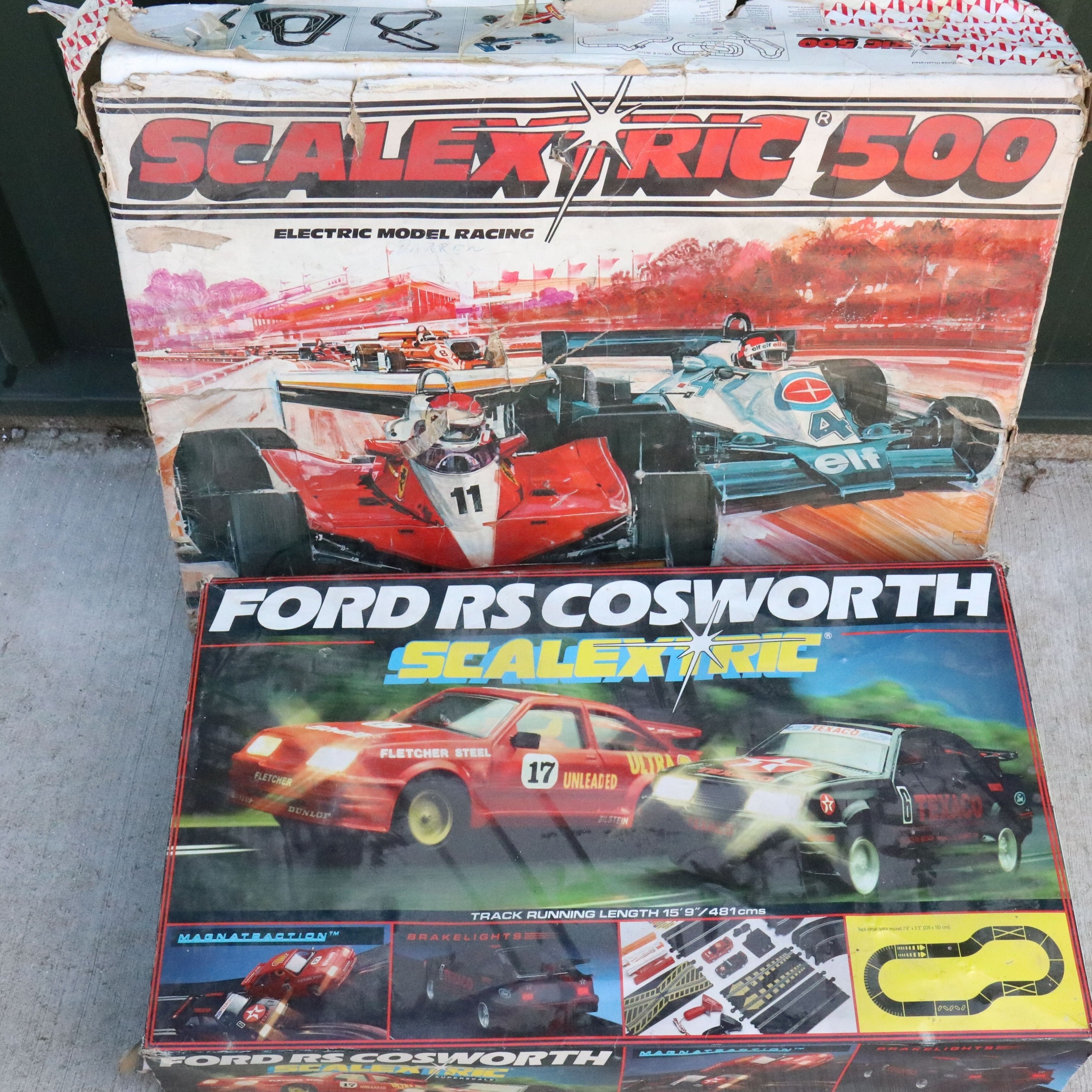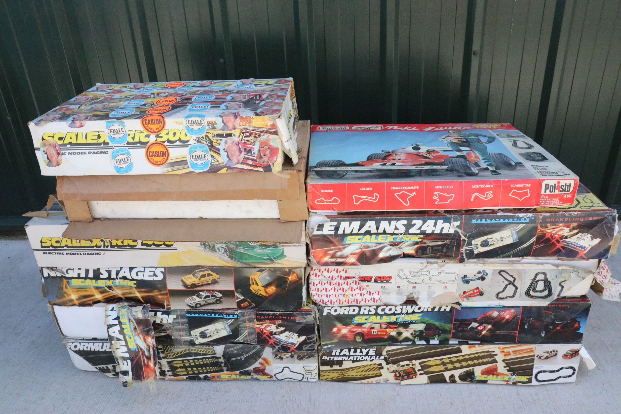 Boxed Scalextric 300 set with both slot cars plus 10 x boxed slot car sets all without cars to include Hornby Rallye Internationale, Ford RS Cosworth, Scalextric 500, Polistil Niki Lauda etc, tatty boxes (11 items)