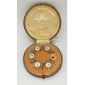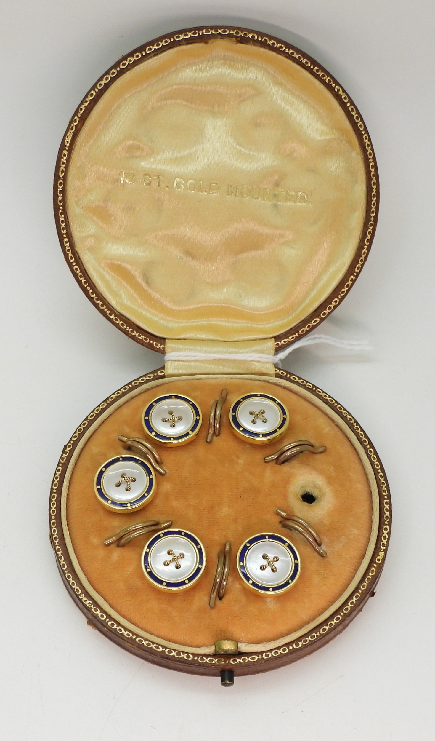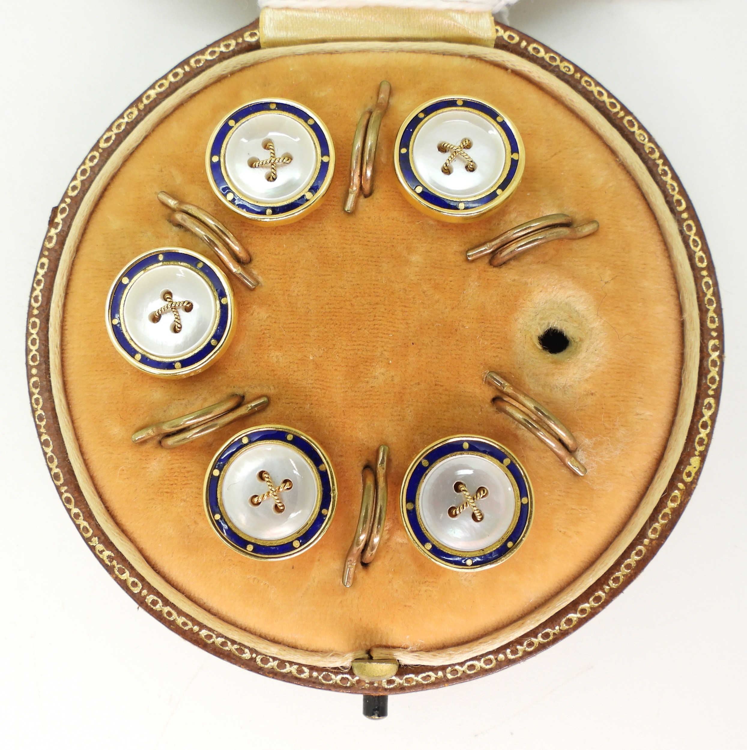 A boxed set of five enamel and mother of pearl buttons (one missing) stamped 18ct to the edge, weight of the buttons only 7.6gms.