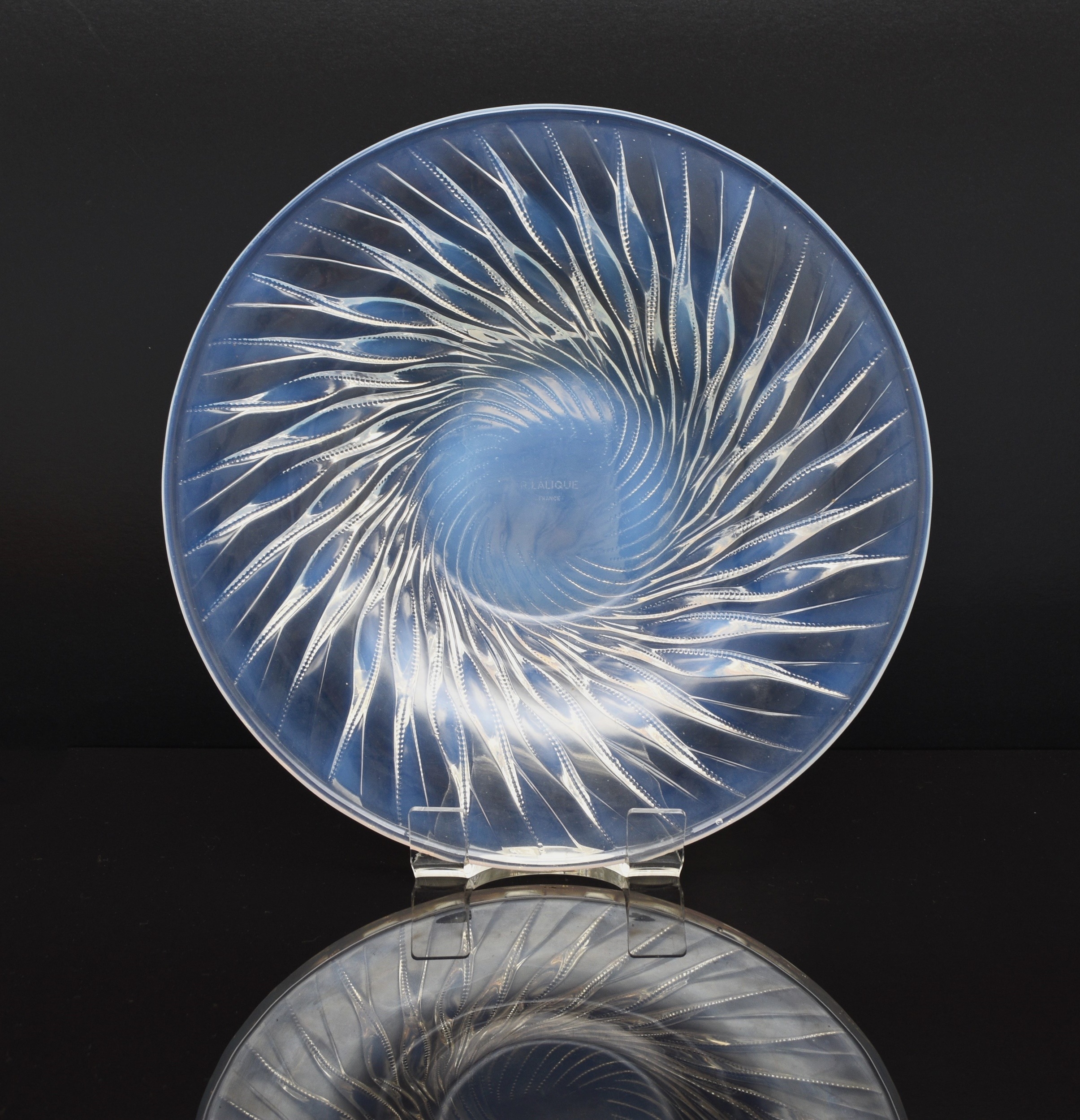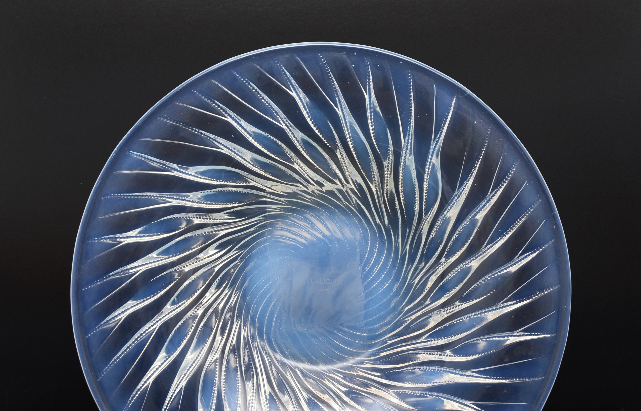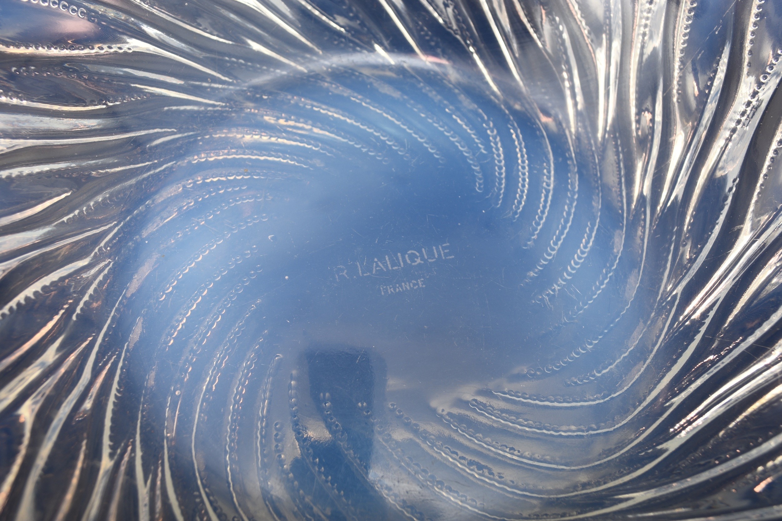 A René Lalique 'Algues' bowl, designed in 1933, opalescent glass with spiralling seaweed trails, stencilled 'R. LALIQUE FRANCE' mark, 35cm diameter Condition:Good condition with no damages or repairs. A couple of small bubble inclusions near the rim of the bowl, some natural wear to the underside of the base commensurate with age and some relatively light, short scratches to the interior centre of the bowl.