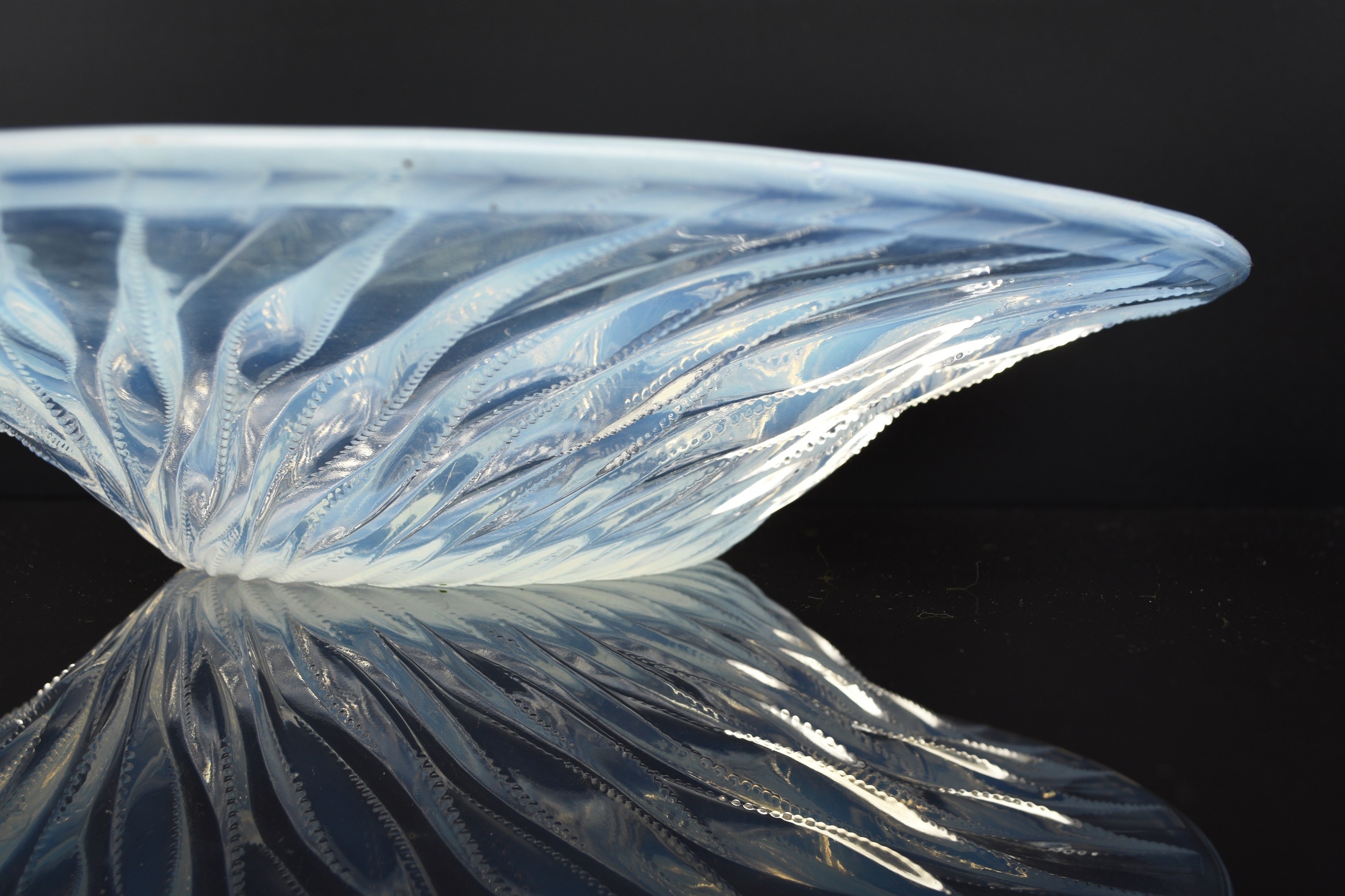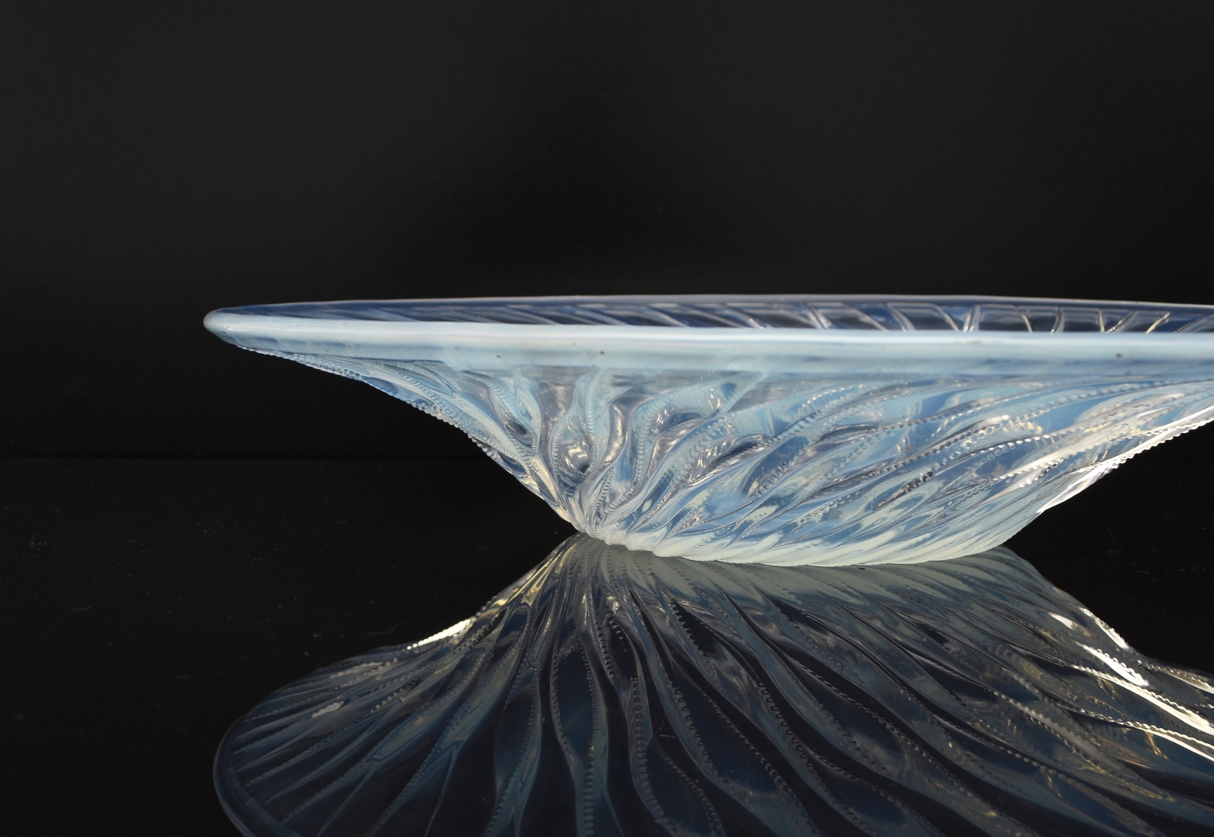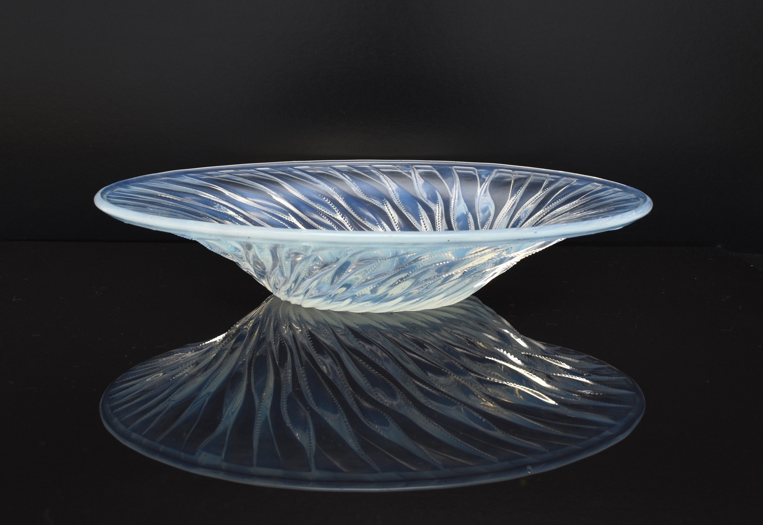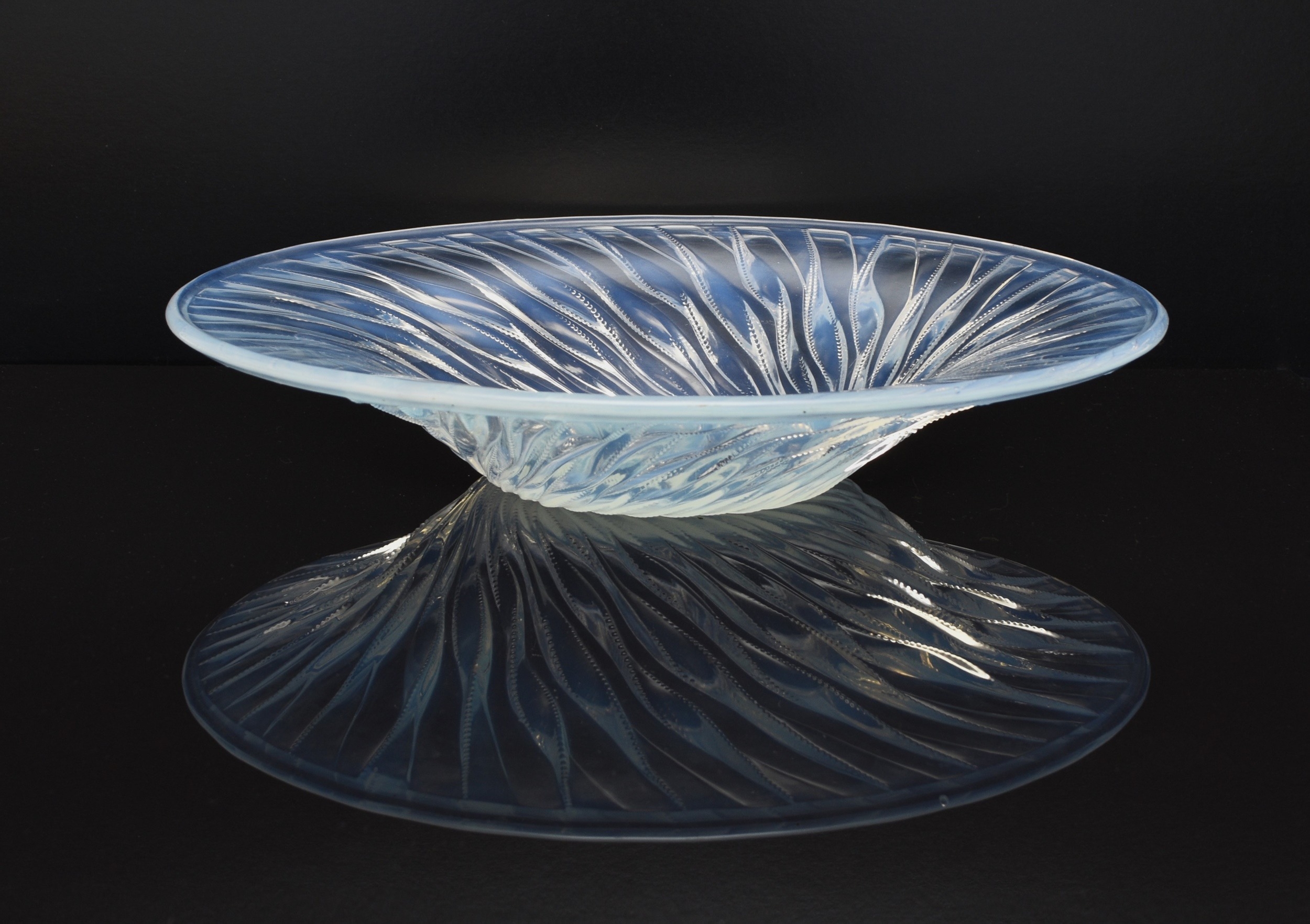 A René Lalique 'Algues' bowl, designed in 1933, opalescent glass with spiralling seaweed trails, stencilled 'R. LALIQUE FRANCE' mark, 35cm diameter Condition:Good condition with no damages or repairs. A couple of small bubble inclusions near the rim of the bowl, some natural wear to the underside of the base commensurate with age and some relatively light, short scratches to the interior centre of the bowl.