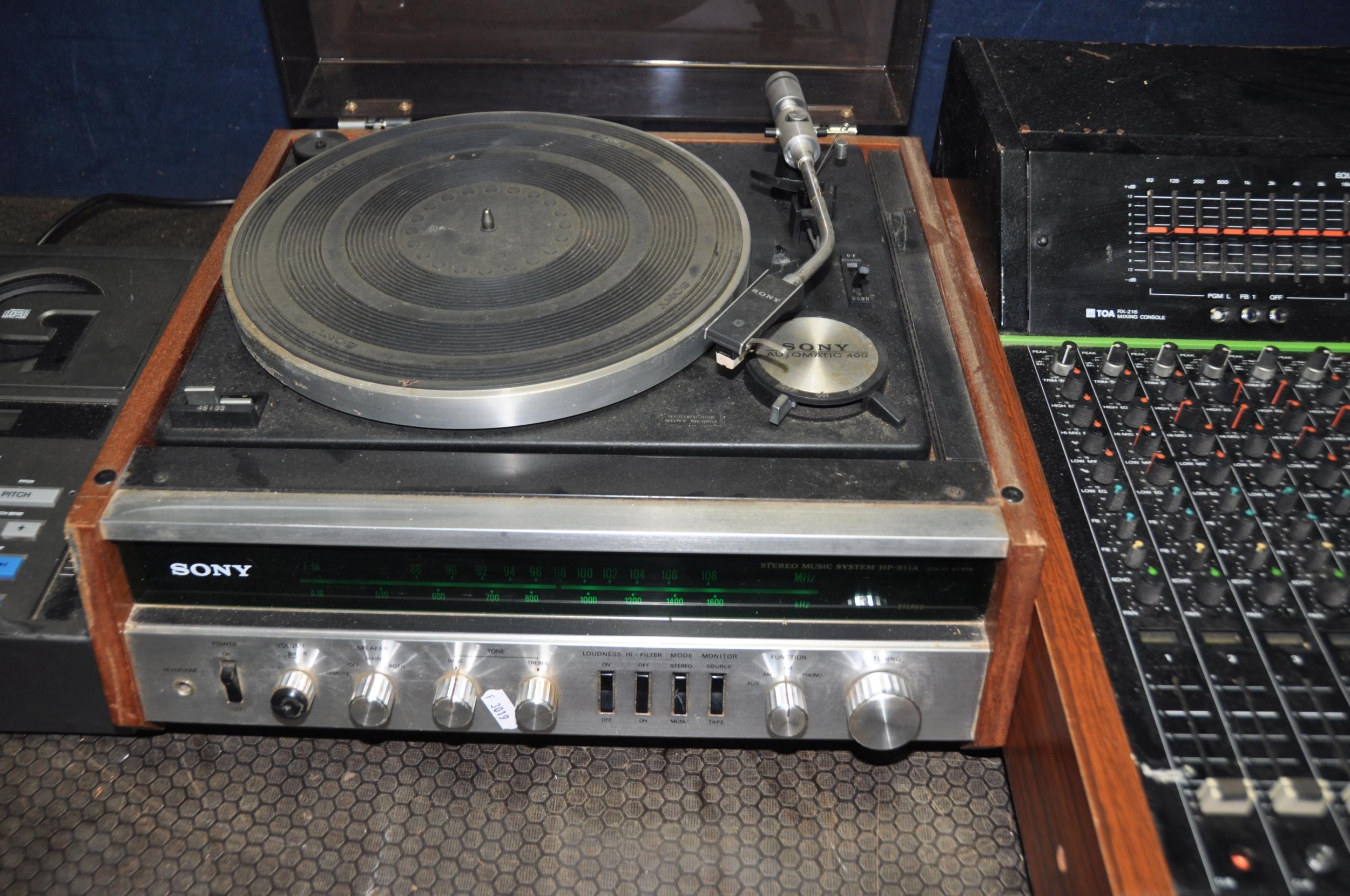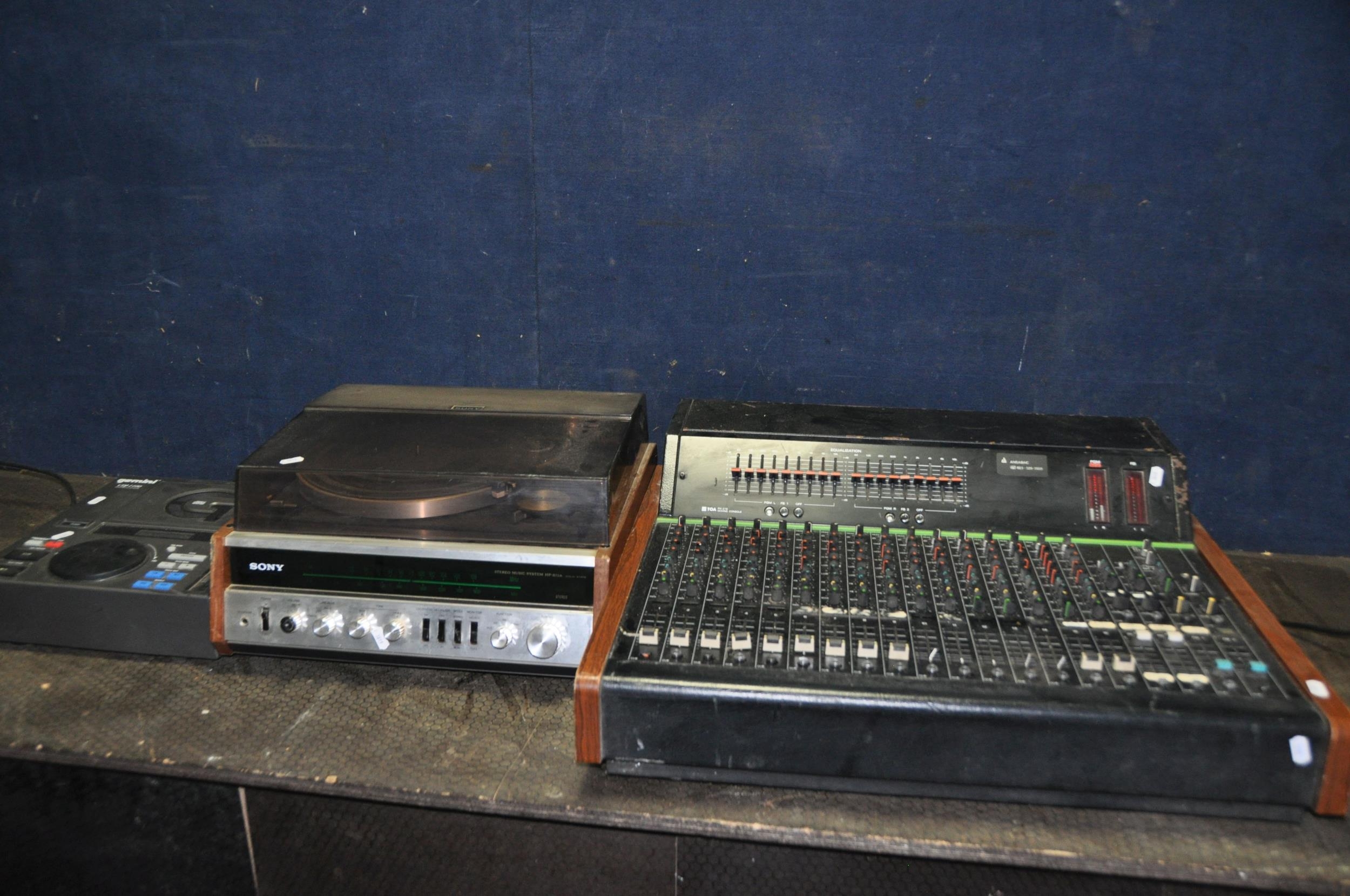 A VINTAGE SONY HP-511A MUSIC CENTRE (drive belt gone but working) a Toa RX216 mixing desk (powers up but not tested any further) and a Gemini CDJ-1100 (PAT pass and working) (3)
