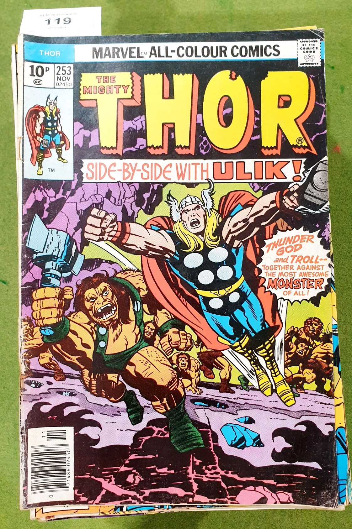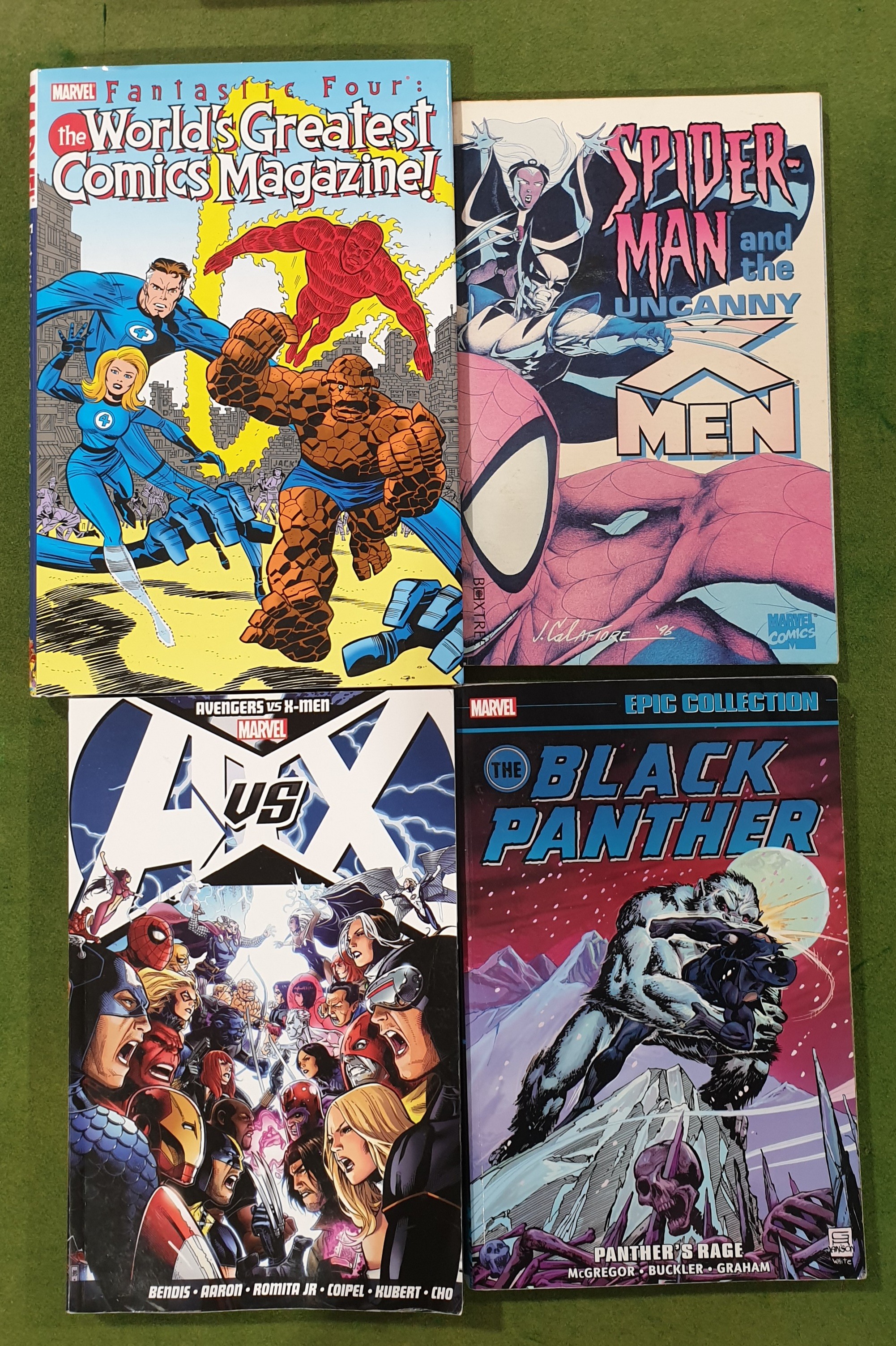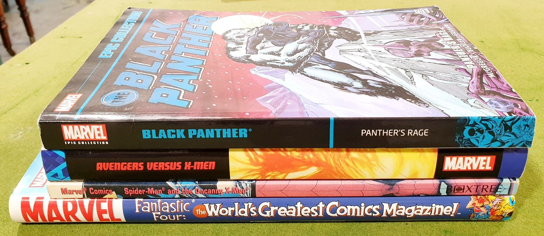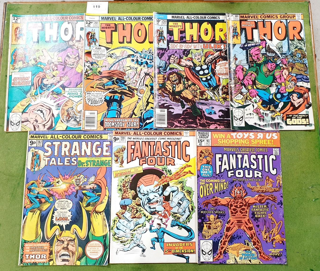 Seven vintage Marvel comics including Thor and The Fantastic Four together with four other Marvel graphic novels. UK shipping £14.