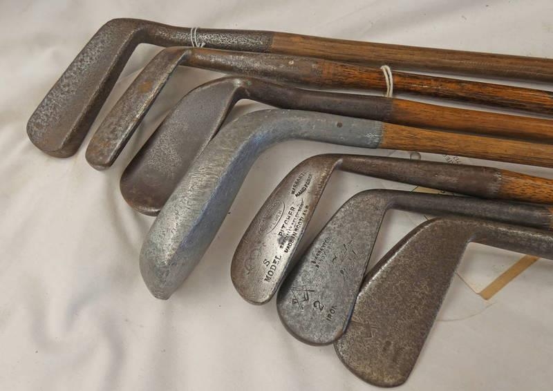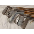 7 HICKORY SHAFTED GOLF CLUBS TO INCLUDE AN UNUSUAL SHAPED MASHIE BY F.A. JOHNSON, THE MILLS L MODEL, PITCHER S MODEL BY JOE ANDERSON AND FOUR OTHERS -7-