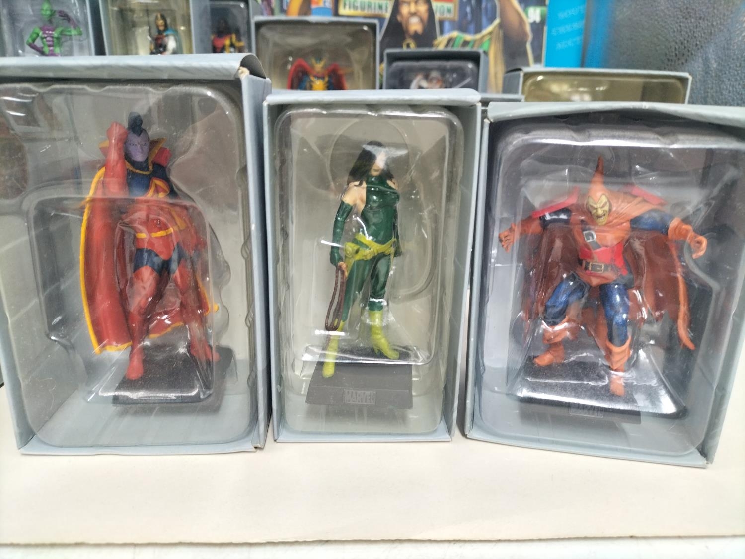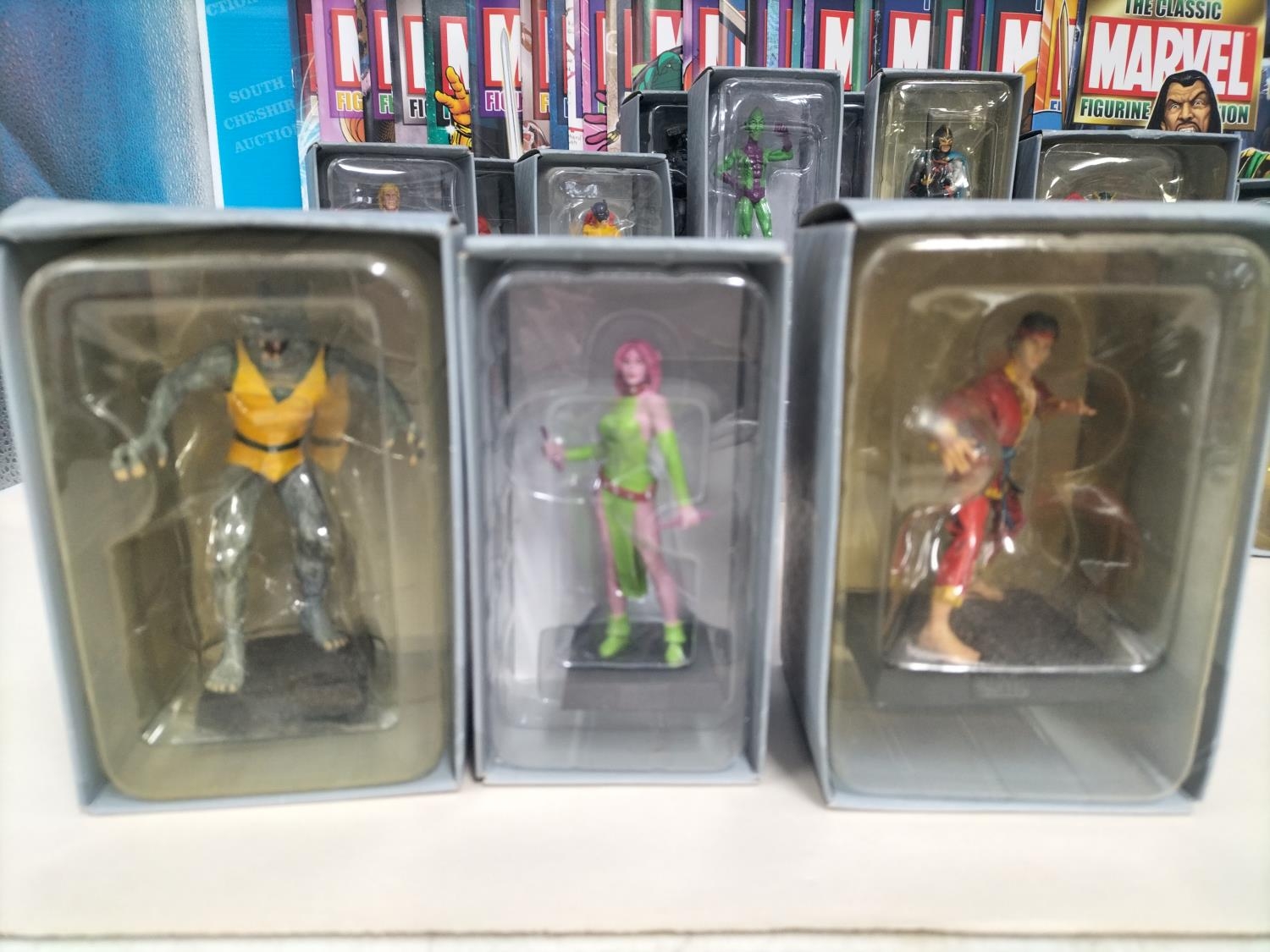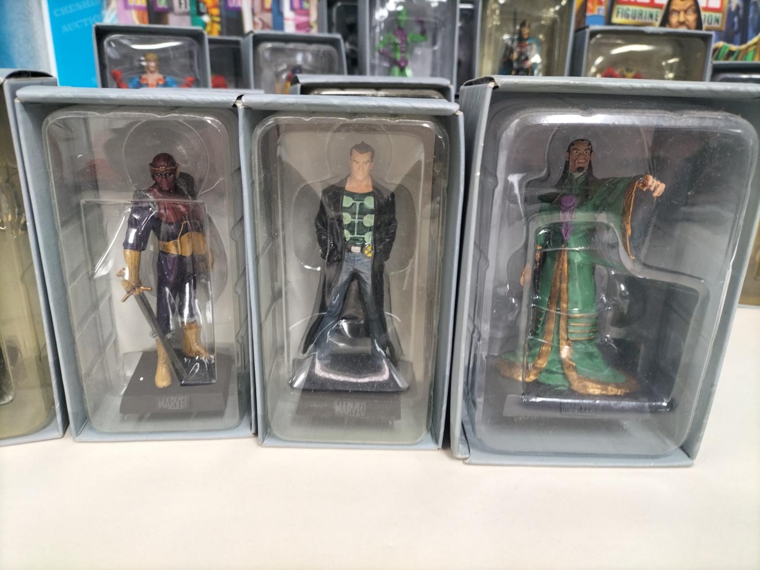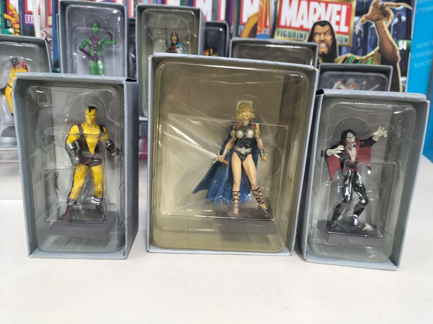 Boxed Eaglemoss The Marvel Classic Figurine Collection 2009 Figures (25) with Magazines to include Valkyrie, Night Hawk, Gladiator, Mandarin, Man-Wolf, Shang-Chi, Hobgoblin, Banshee, Taskmaster, Machine Man, Black Knight, Morbius, Viper, Doc Sampson, Union Jack, Warlock, Ikaris, Baron Zemo, War Machine, Madrox, Shocker, Blink, Hellcat, Bishop and Impossible Man.