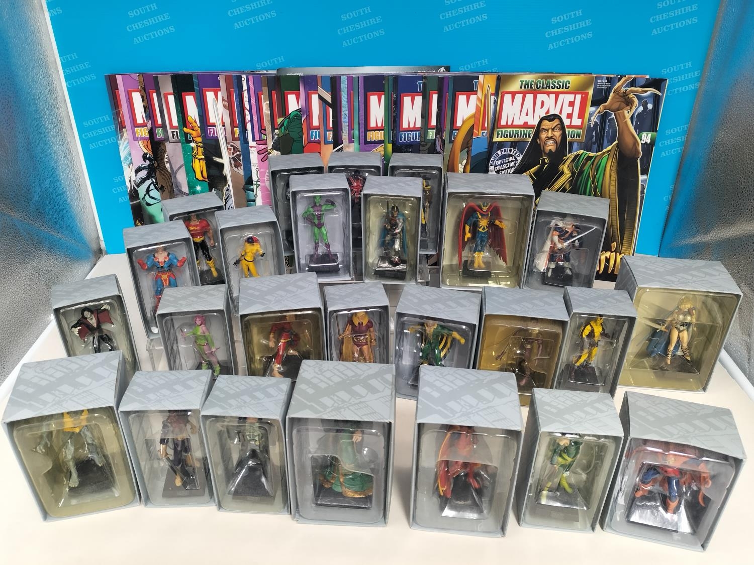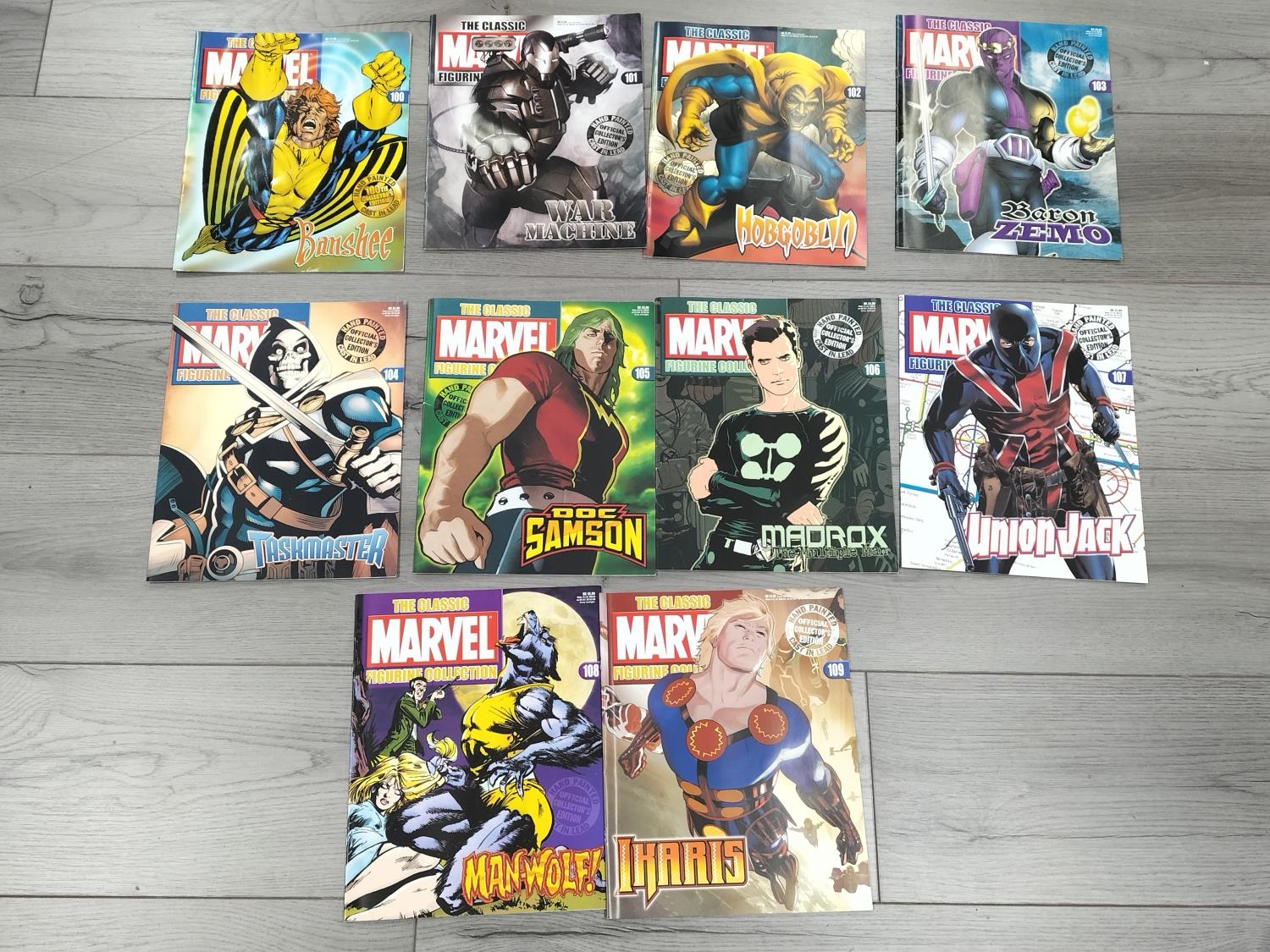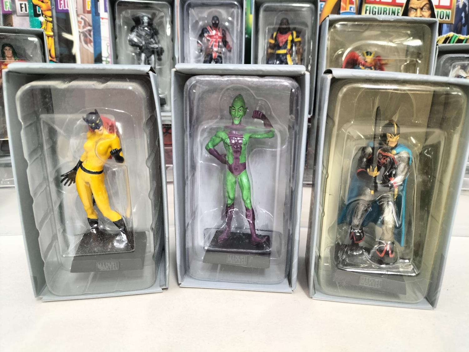 Boxed Eaglemoss The Marvel Classic Figurine Collection 2009 Figures (25) with Magazines to include Valkyrie, Night Hawk, Gladiator, Mandarin, Man-Wolf, Shang-Chi, Hobgoblin, Banshee, Taskmaster, Machine Man, Black Knight, Morbius, Viper, Doc Sampson, Union Jack, Warlock, Ikaris, Baron Zemo, War Machine, Madrox, Shocker, Blink, Hellcat, Bishop and Impossible Man.