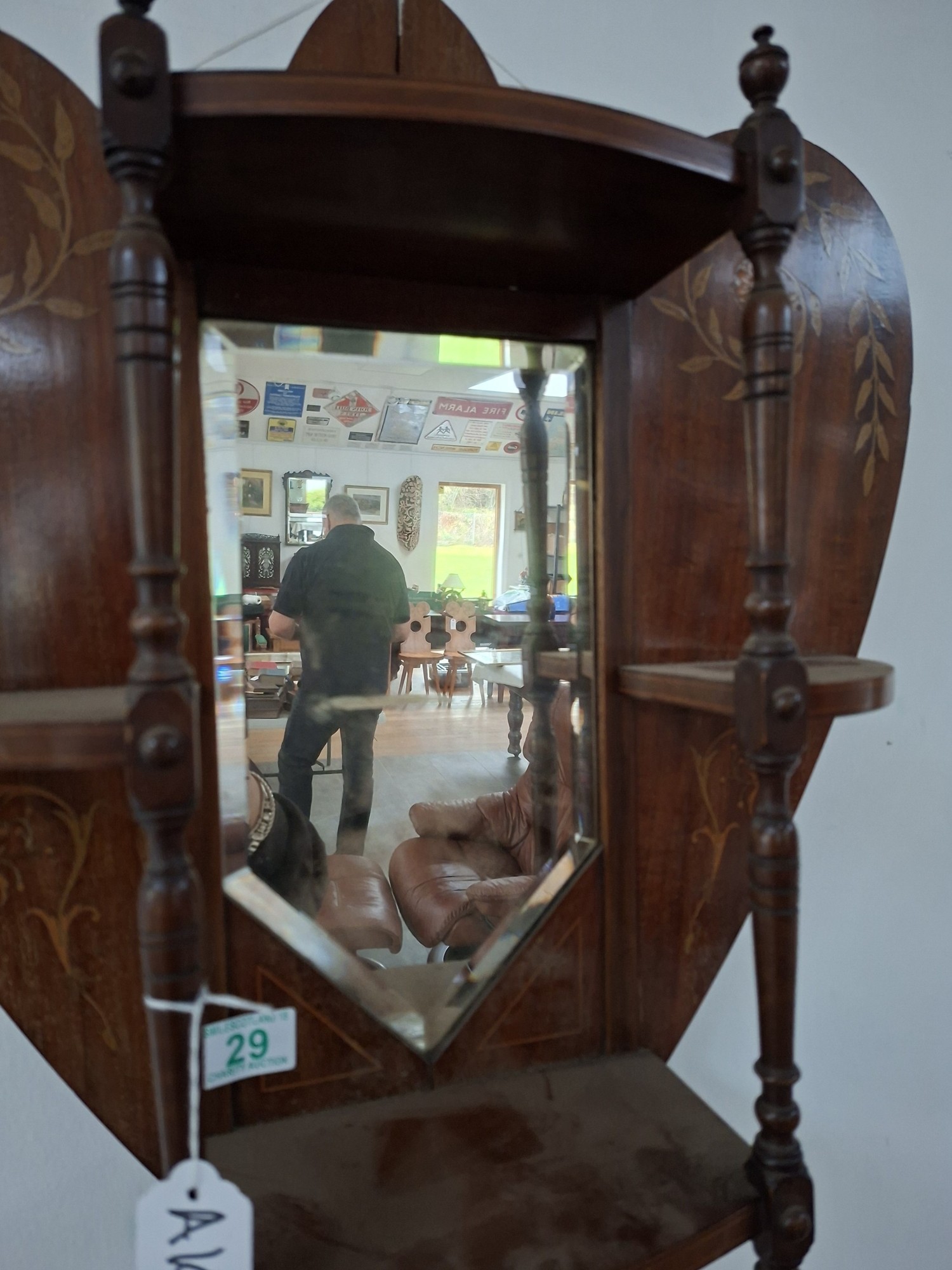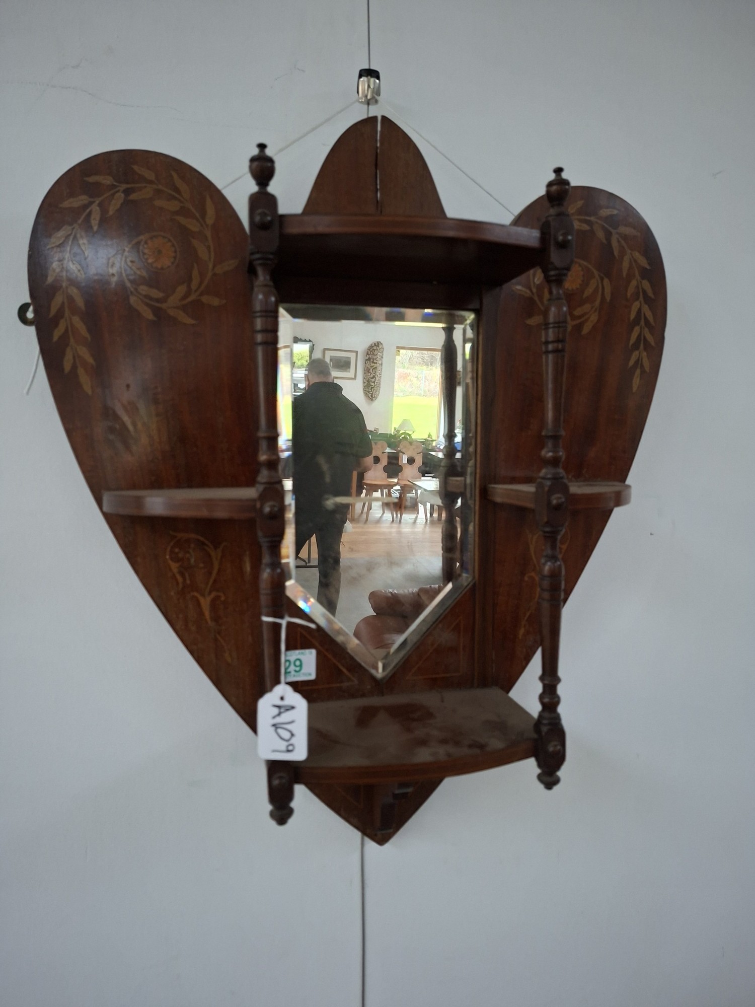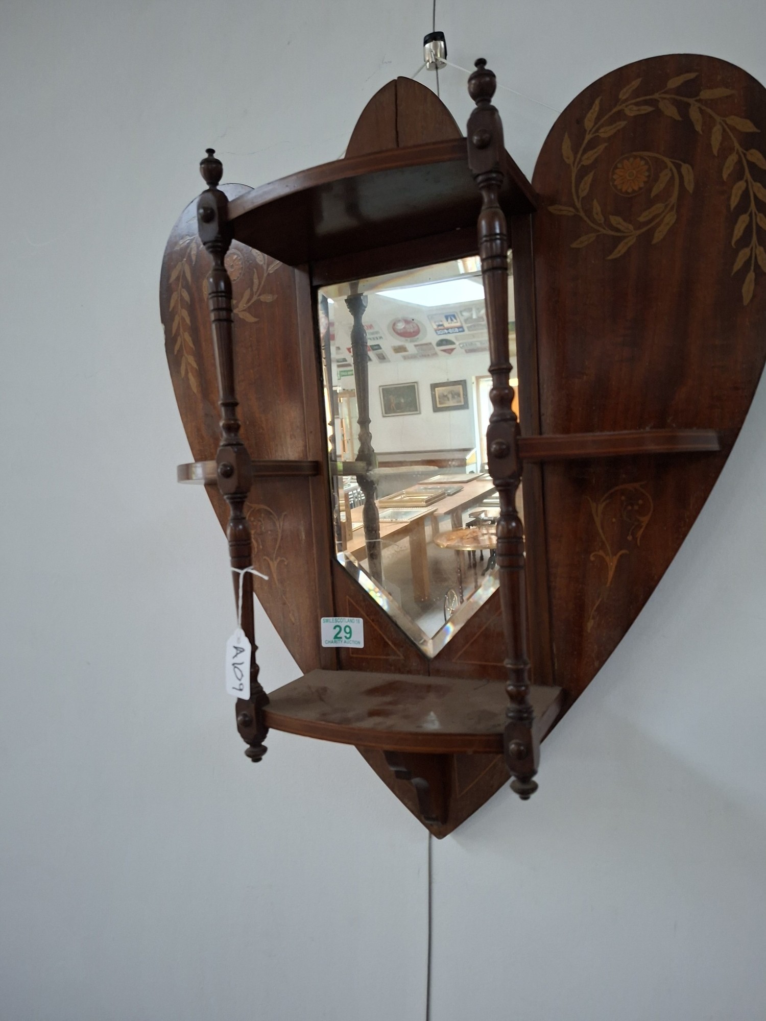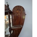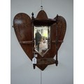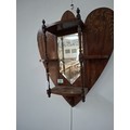 Victorian heart shaped wooden with inlaid design wall mirror with shelves 54cm x 63cm approx. As found