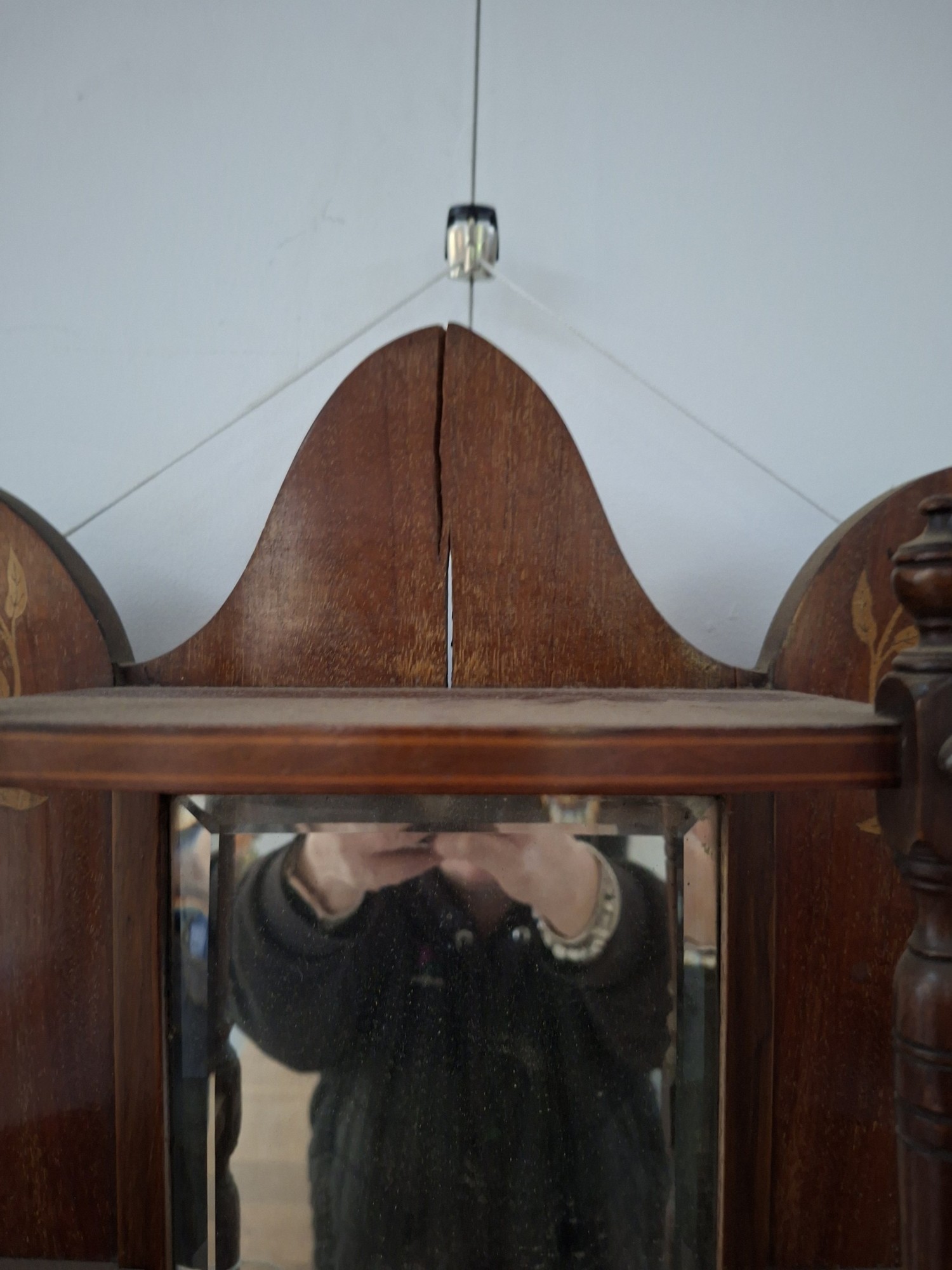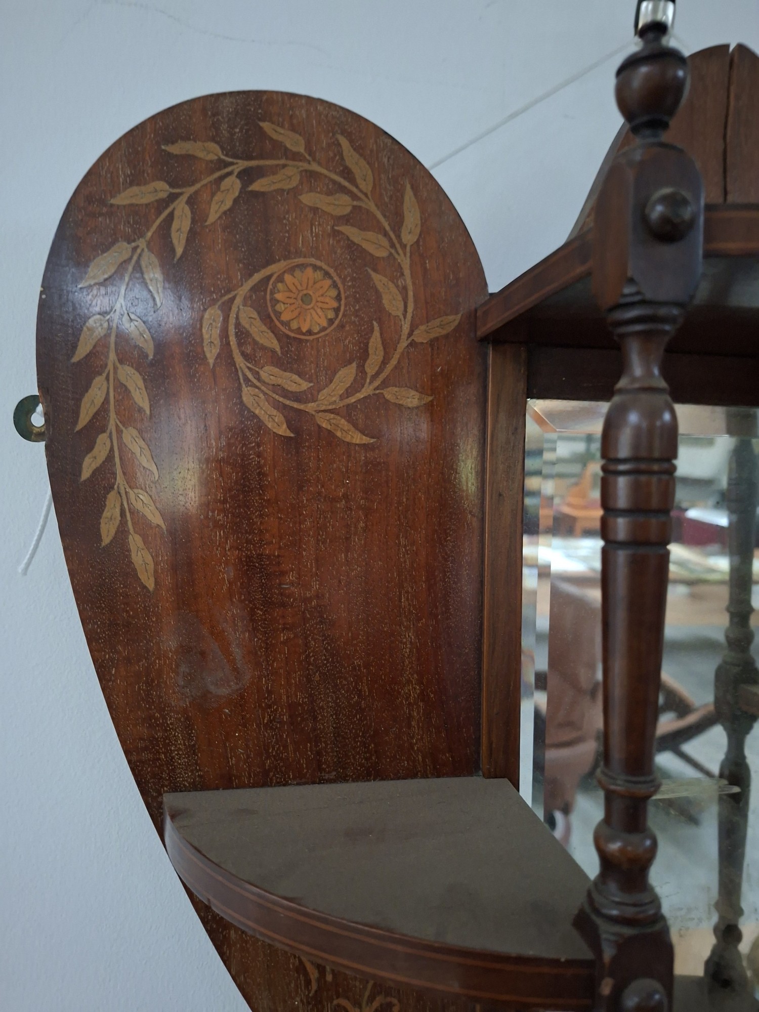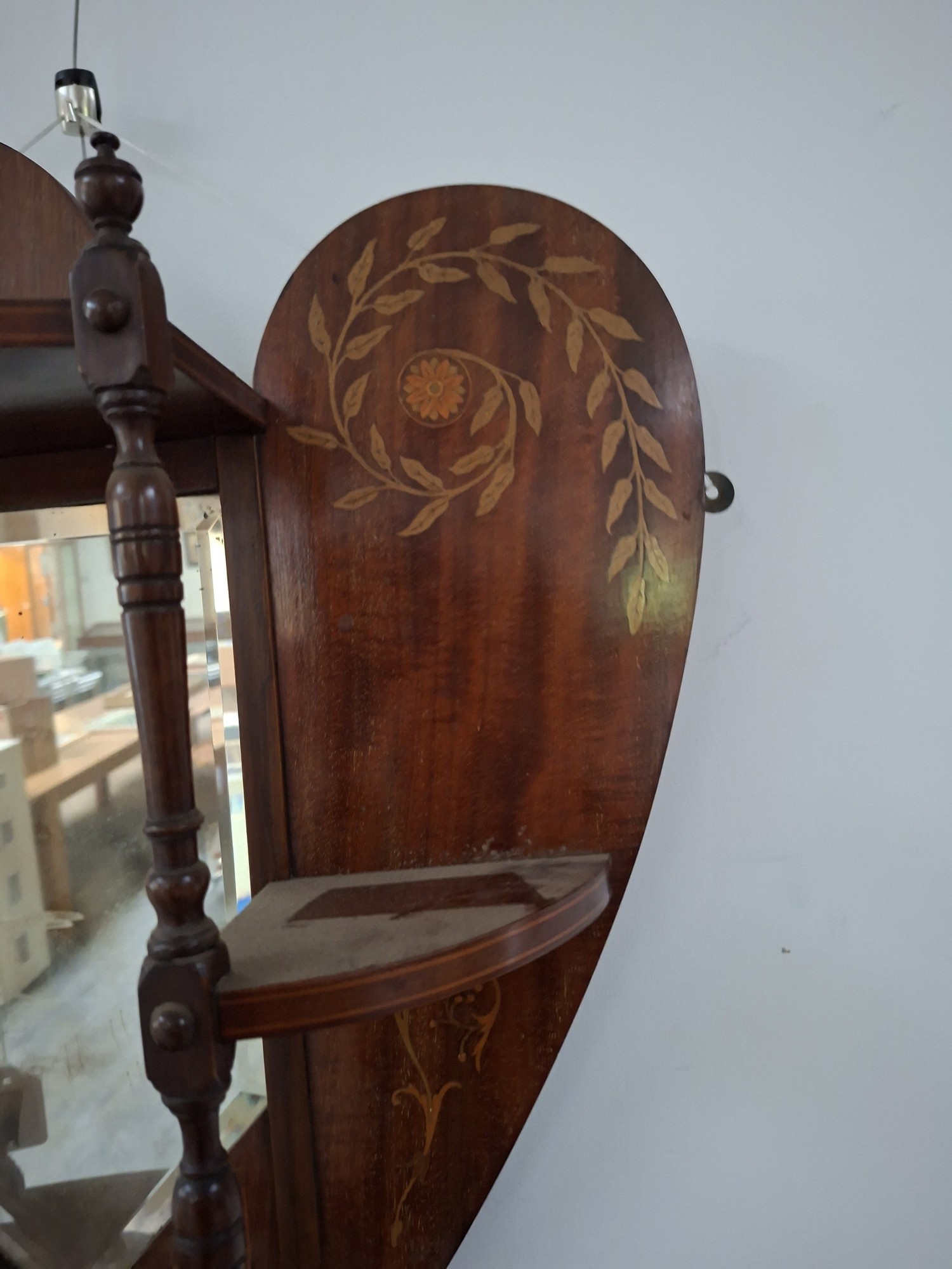 Victorian heart shaped wooden with inlaid design wall mirror with shelves 54cm x 63cm approx. As found