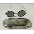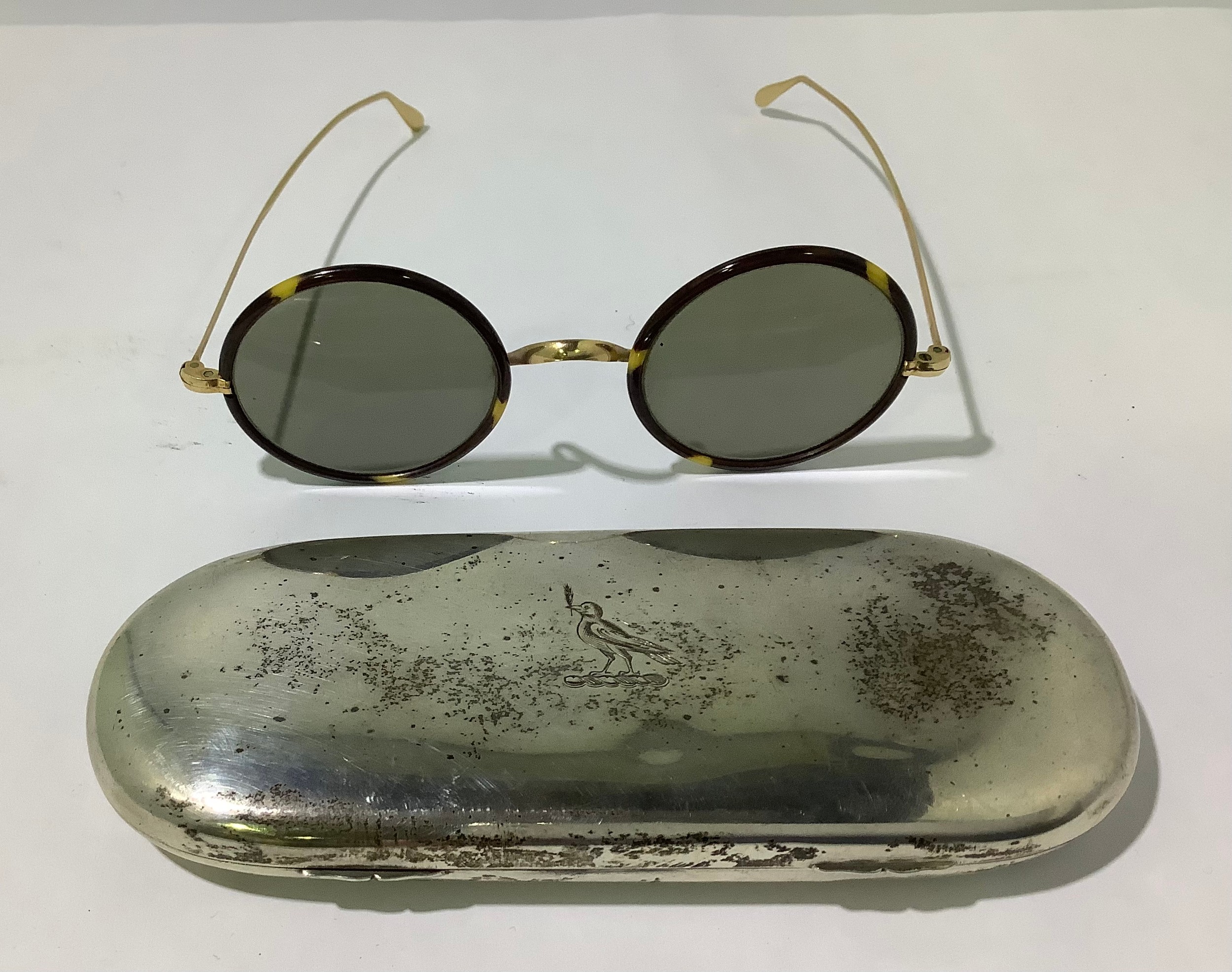 A silver spectacle case, with makers mark ‘HL’, hallmarked London 1927, gross weight approximately 4.2ozt, containing a pair of round tortoiseshell and 1/10 10ct gold spectacles