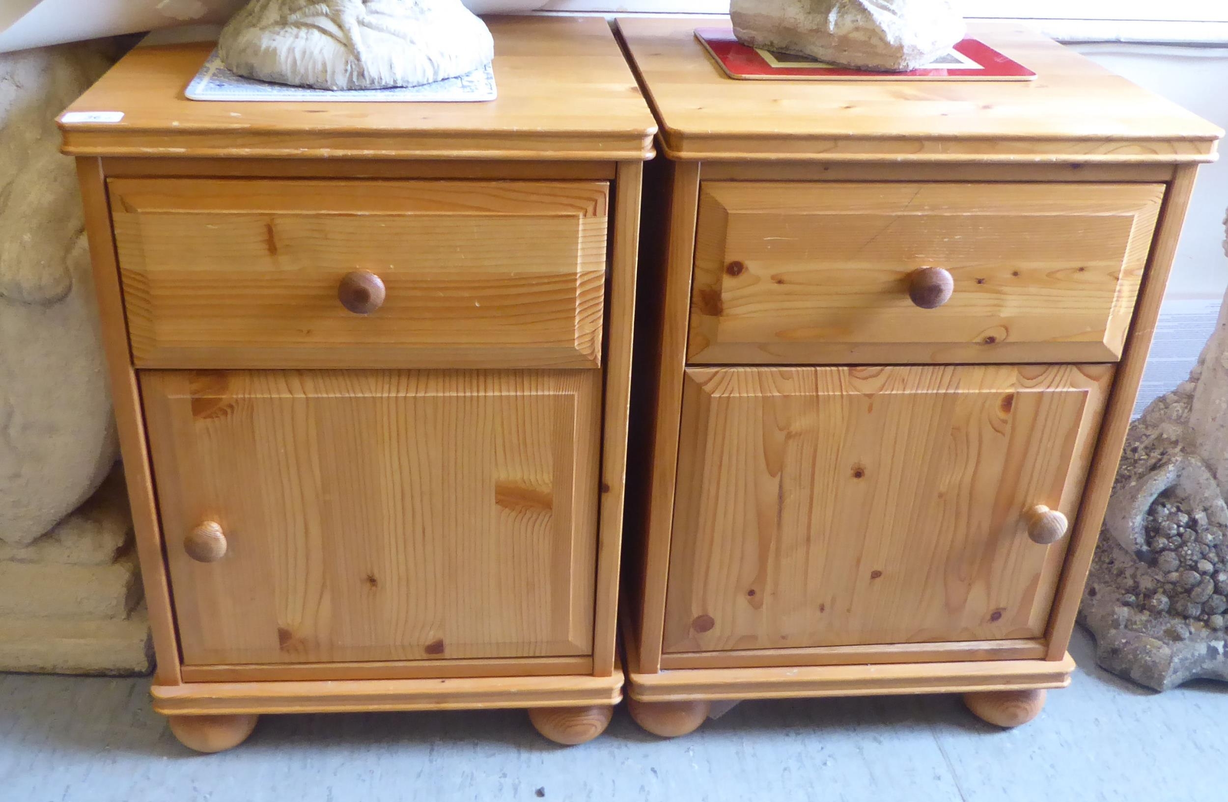 A pair of modern pine bedside chests with a single drawer over a door, on a plinth and bun feet  24"h  16"w