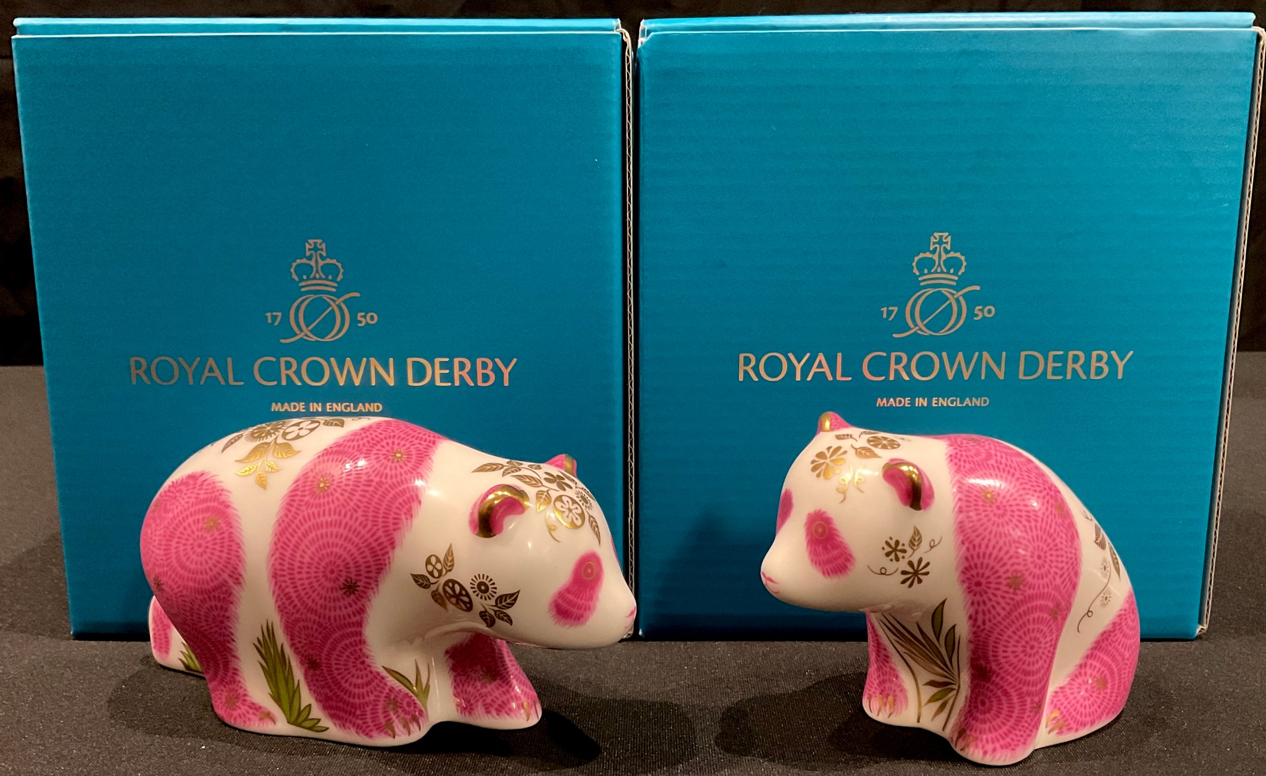 A Royal Crown Derby paperweight, Pink Baby Panda Walking, limited edition of 150, gold stopper, certificate, boxed; another Pink Baby Panda, gold stopper, boxed