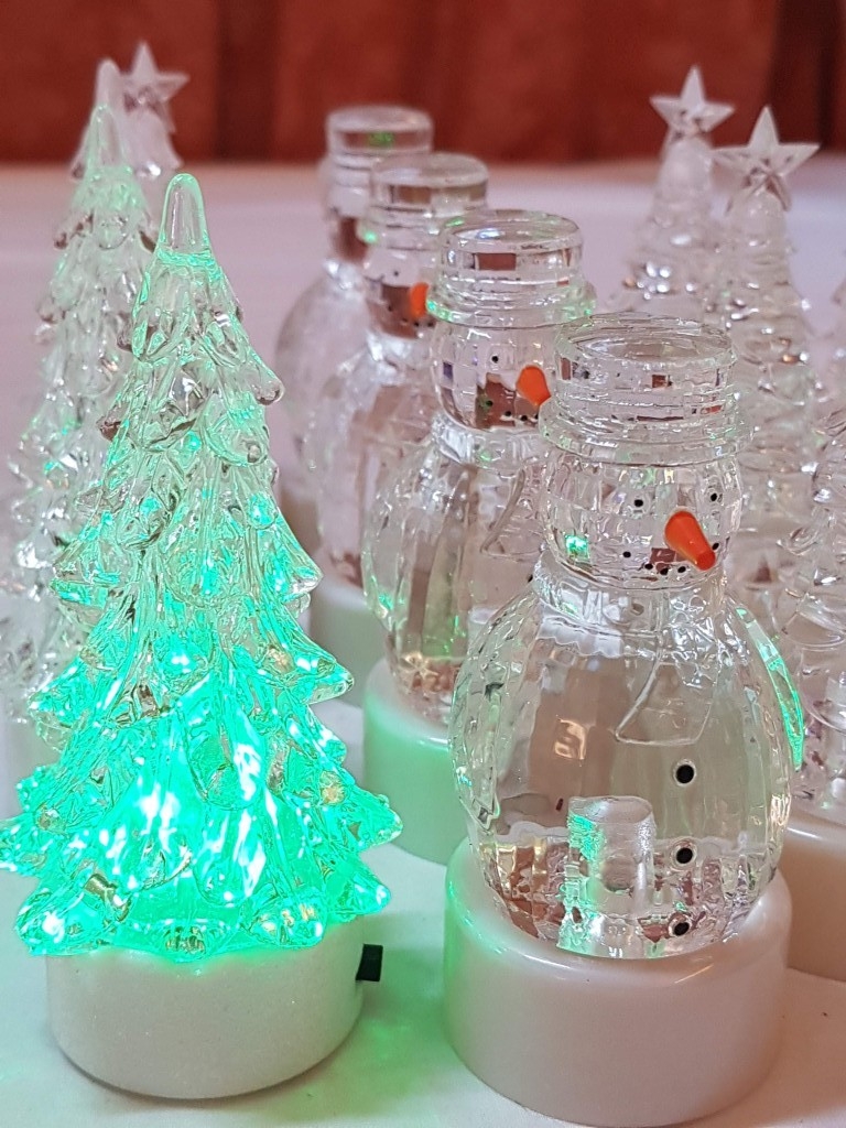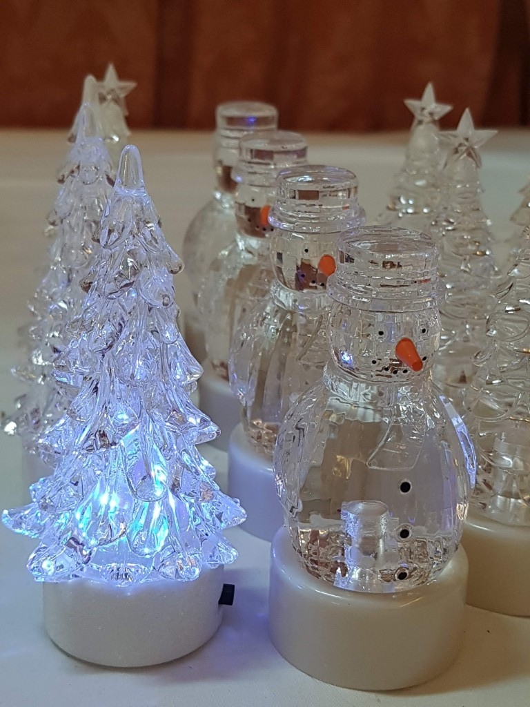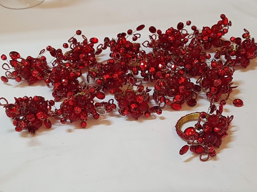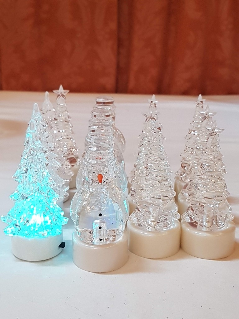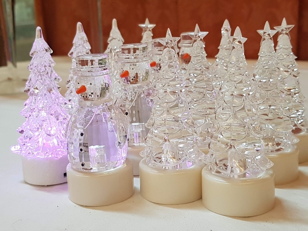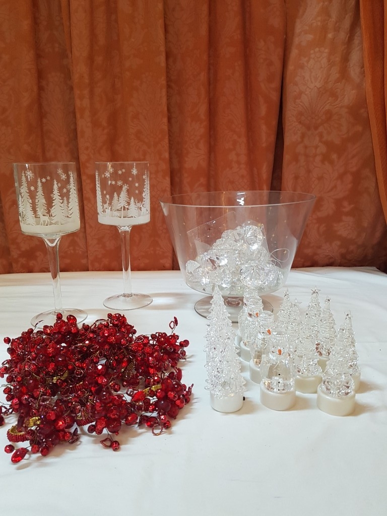 Large Collection of Xmas Table Decor: Napkin Holders 16x, Glass Candle Holders 2x, Sweet Pedestal Bowl 1x, Light Up Christmas Decorations 14x and Crystals.