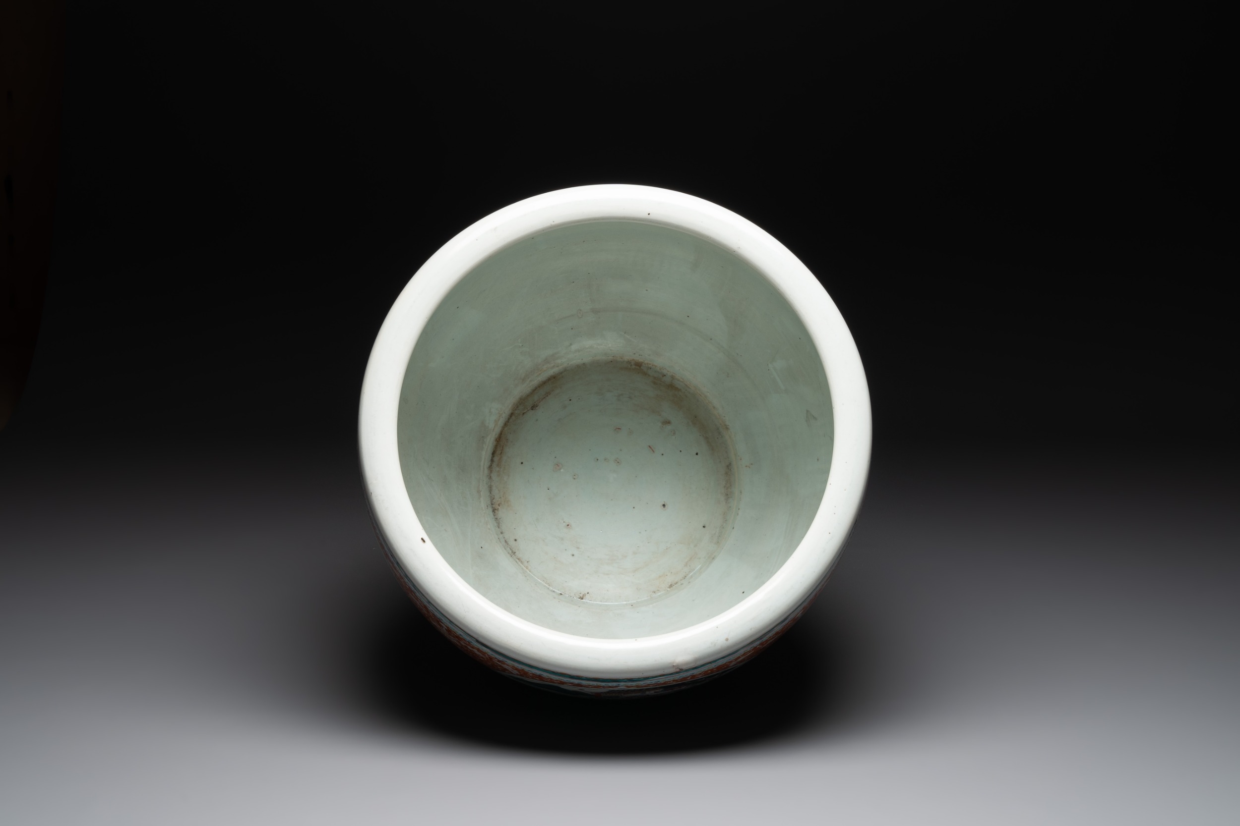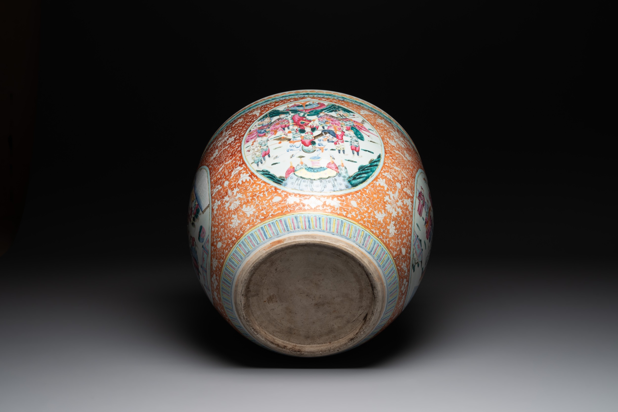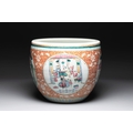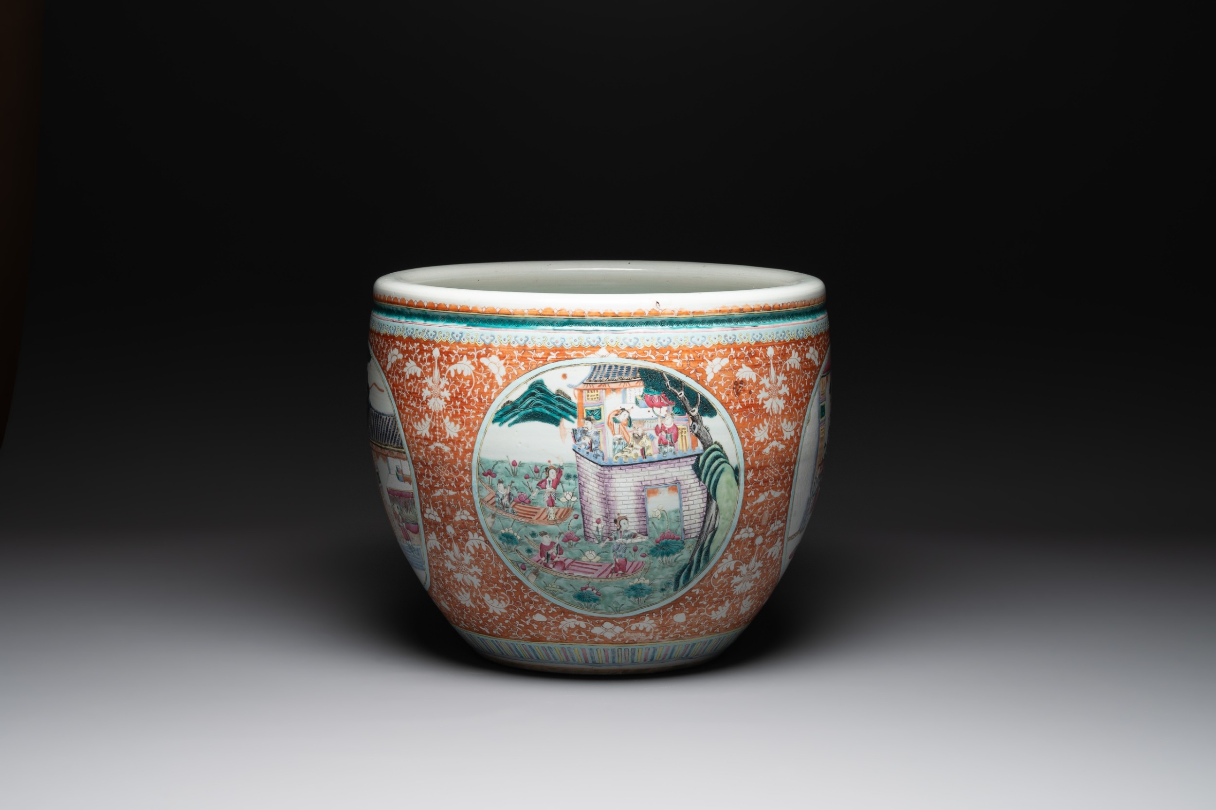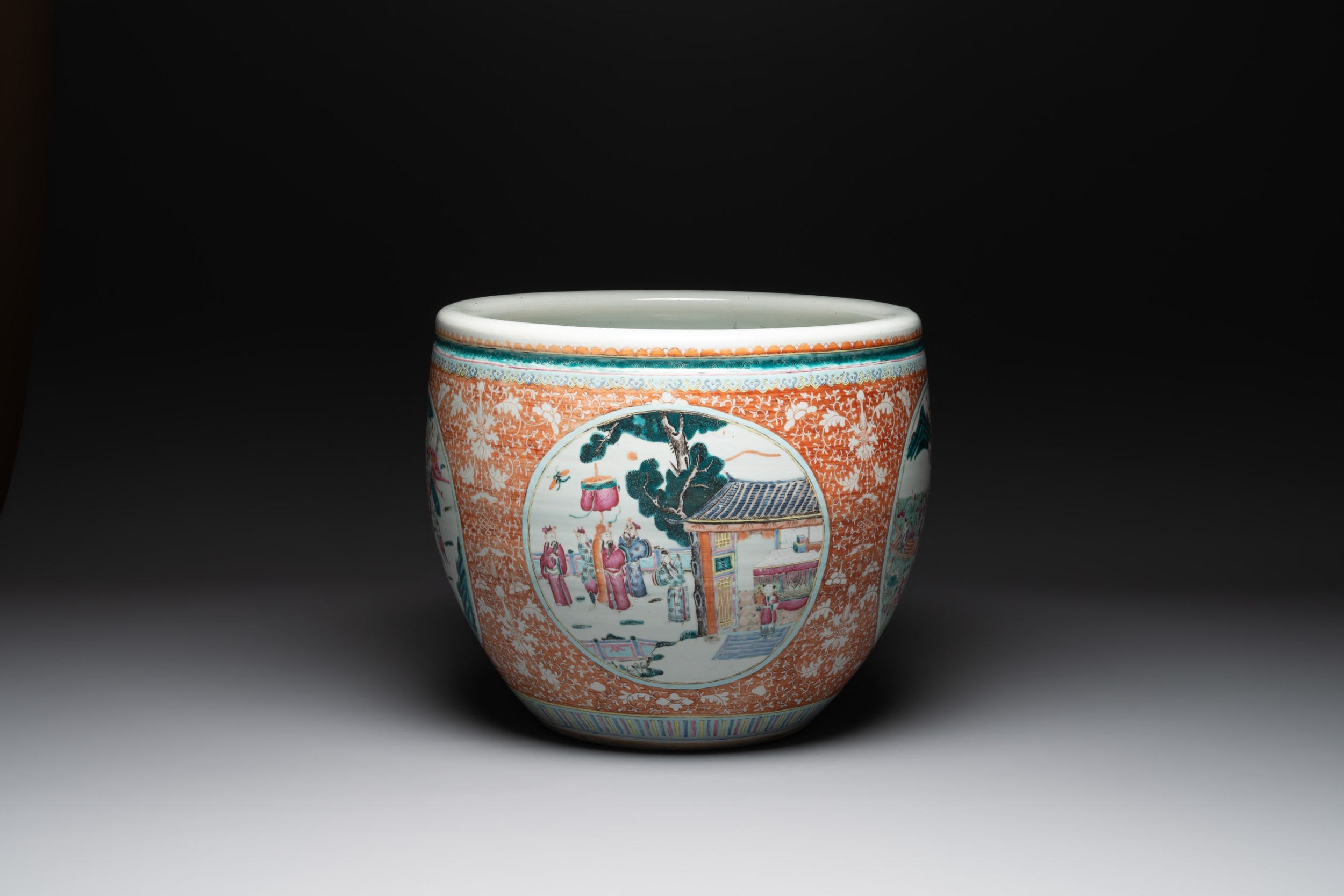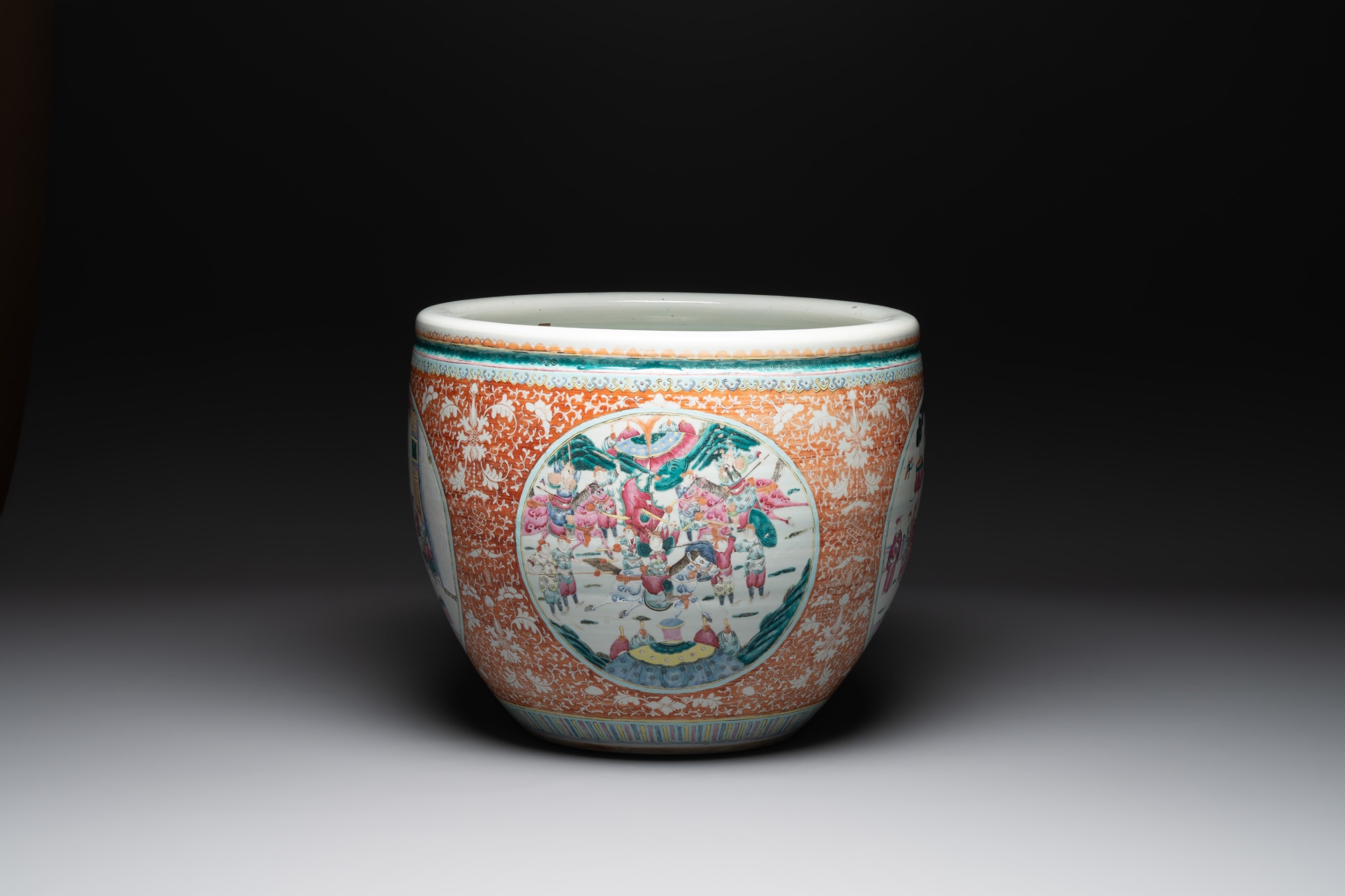 A large Chinese famille rose coral-red-ground fish bowl with narrative design, 19th C.