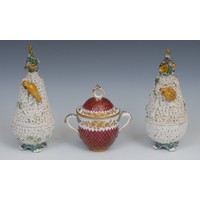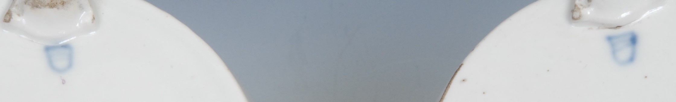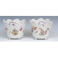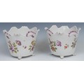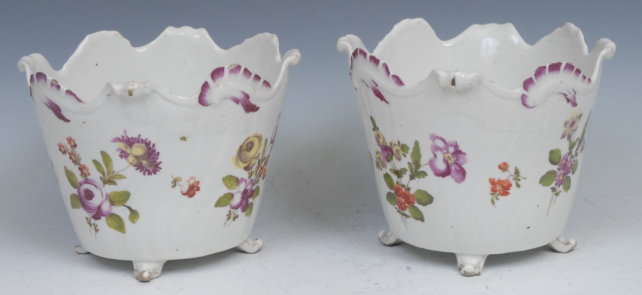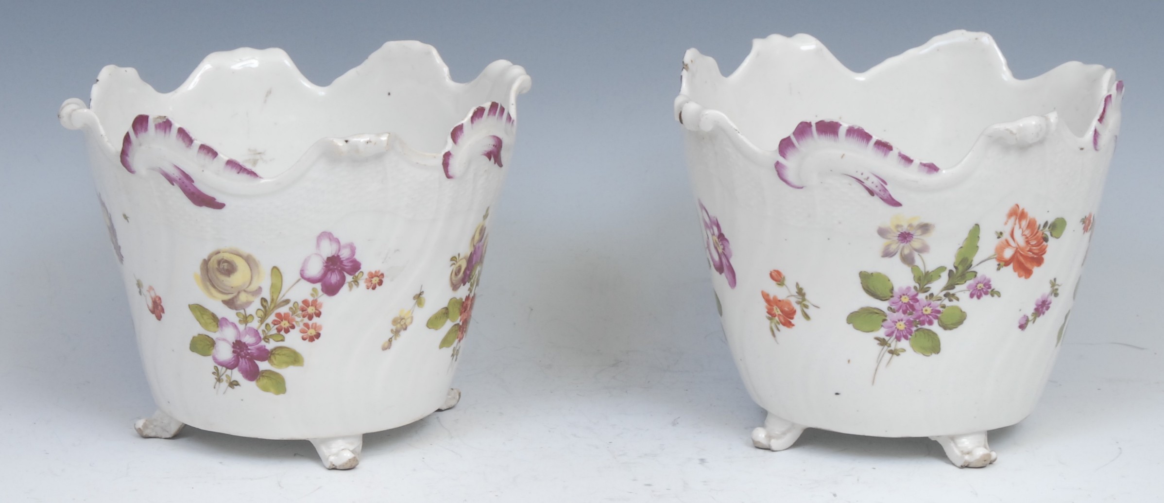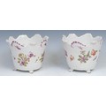 A pair of Vienna cachepots, moulded in the Rococo taste and painted with botanical specimens, 12cm high, blue shield mark