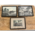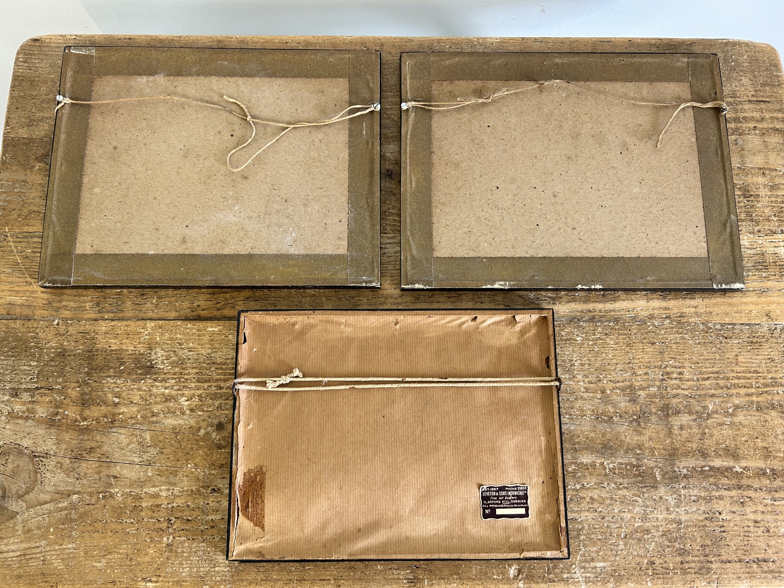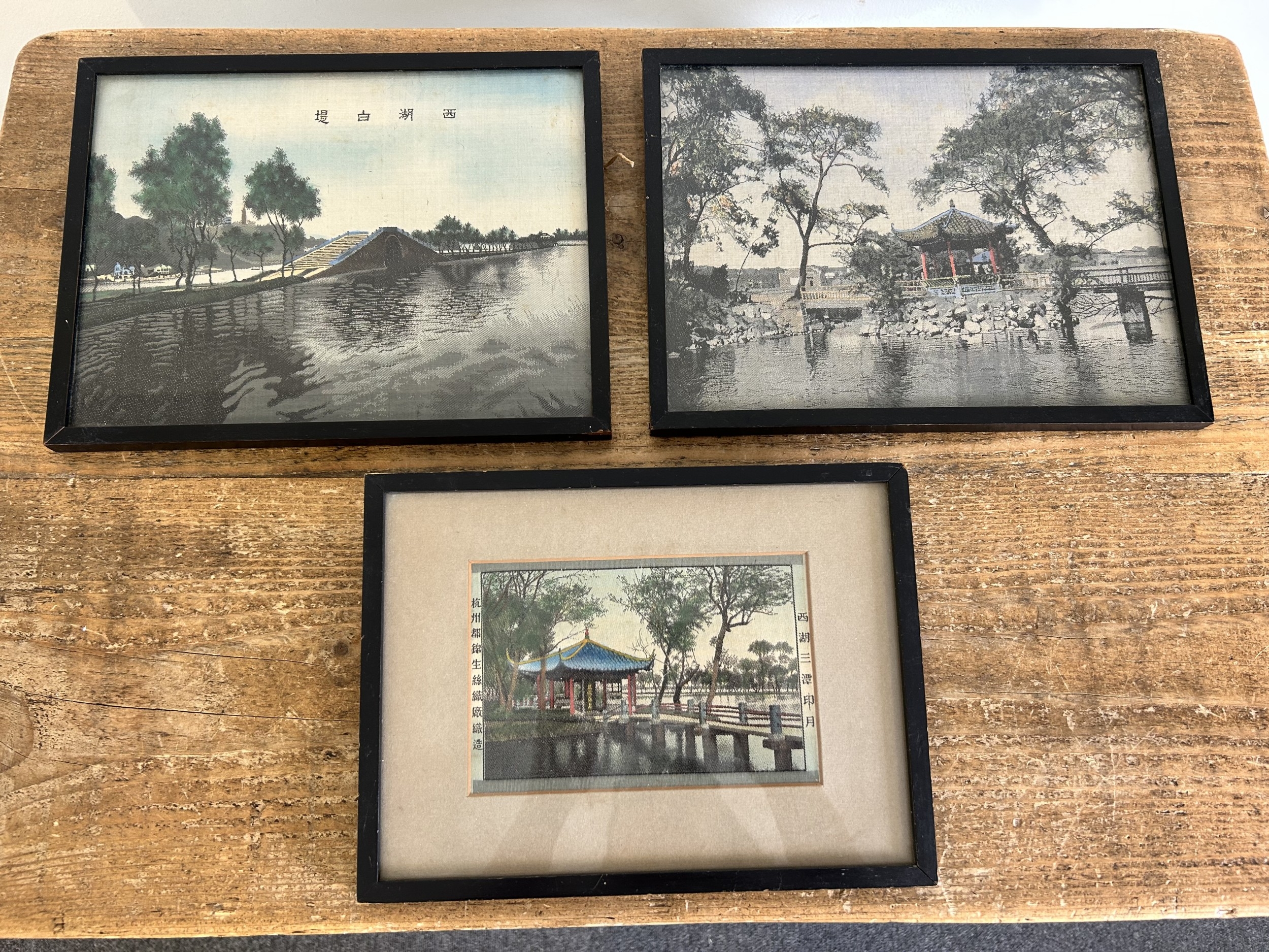 A pair and a single vintage Oriental silk work pictures with pagoda scenes, 9 3/4" x 7 1/2"