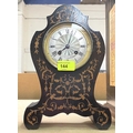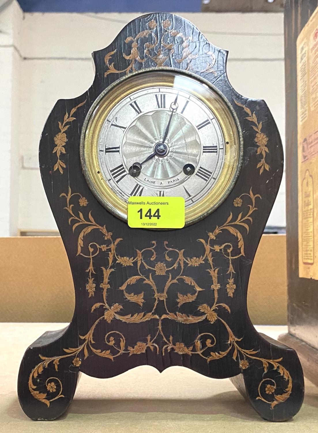 A French mantel clock in rococo style inlaid mahogany case, silvered dial lettered 'Laine Paris'