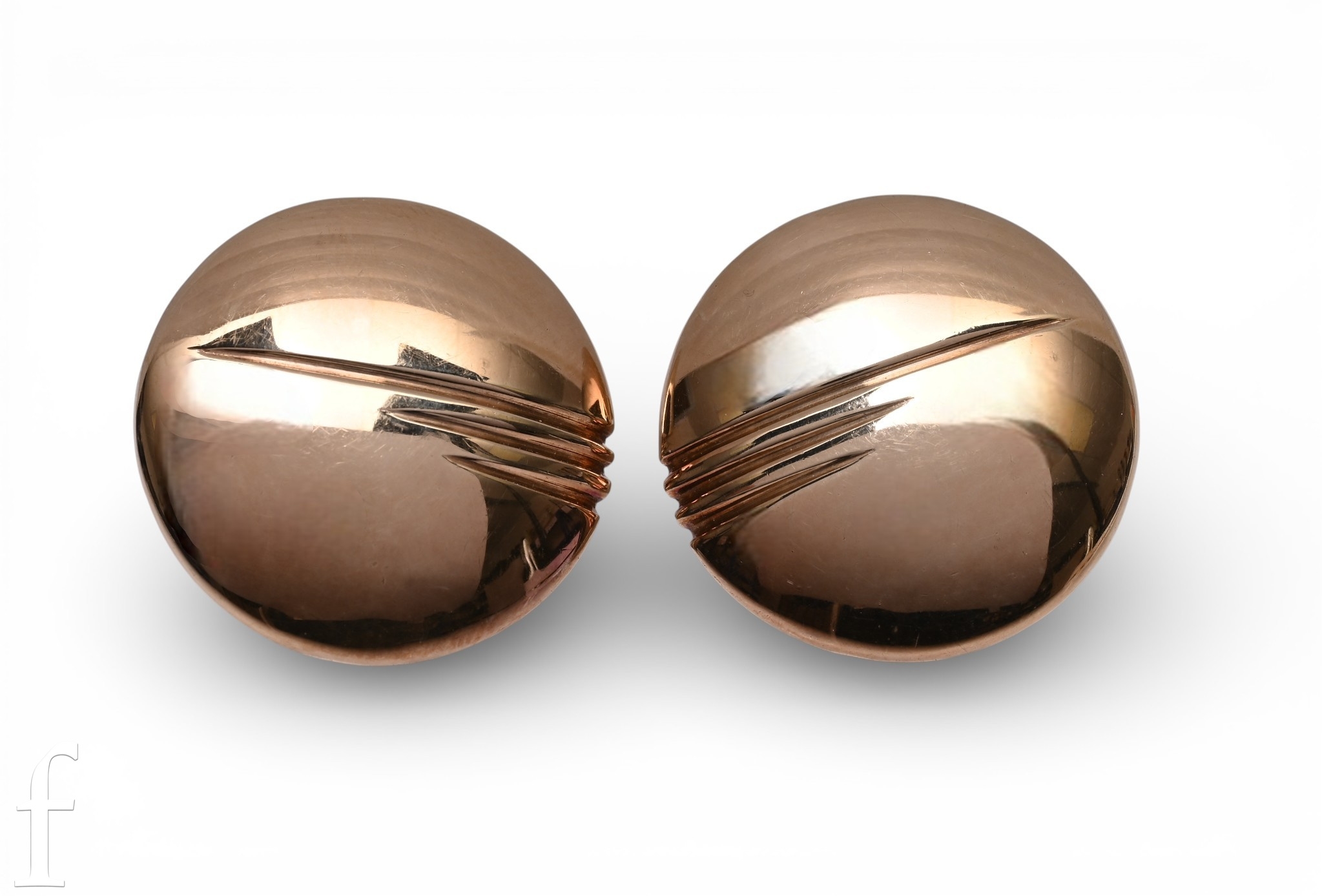 A pair of 9 carat gold earrings, the domed circular discs with linear detail to the front, post and butterfly fittings, hallmarked for 9 carat gold, total weight 10g, 2.3cm diameter.