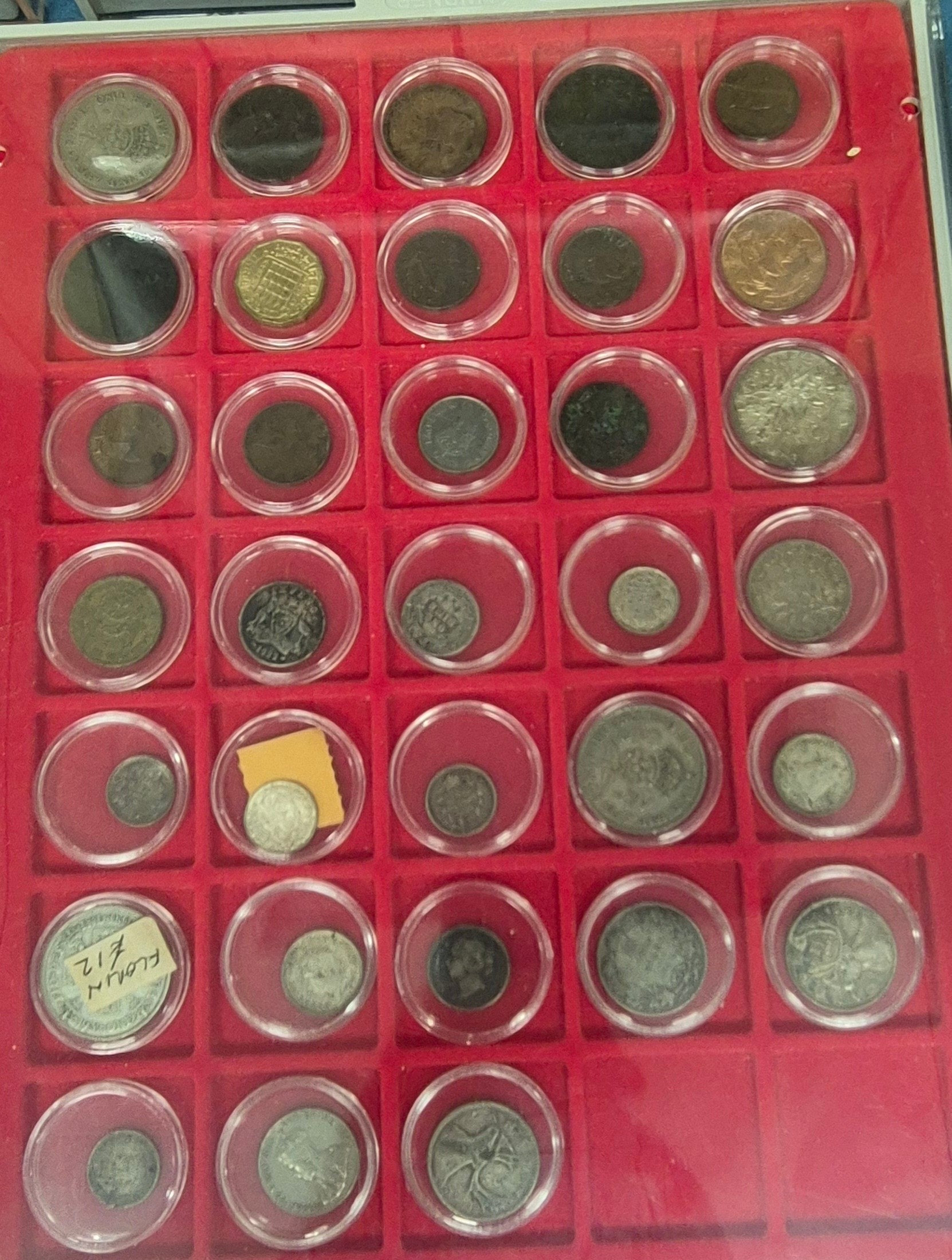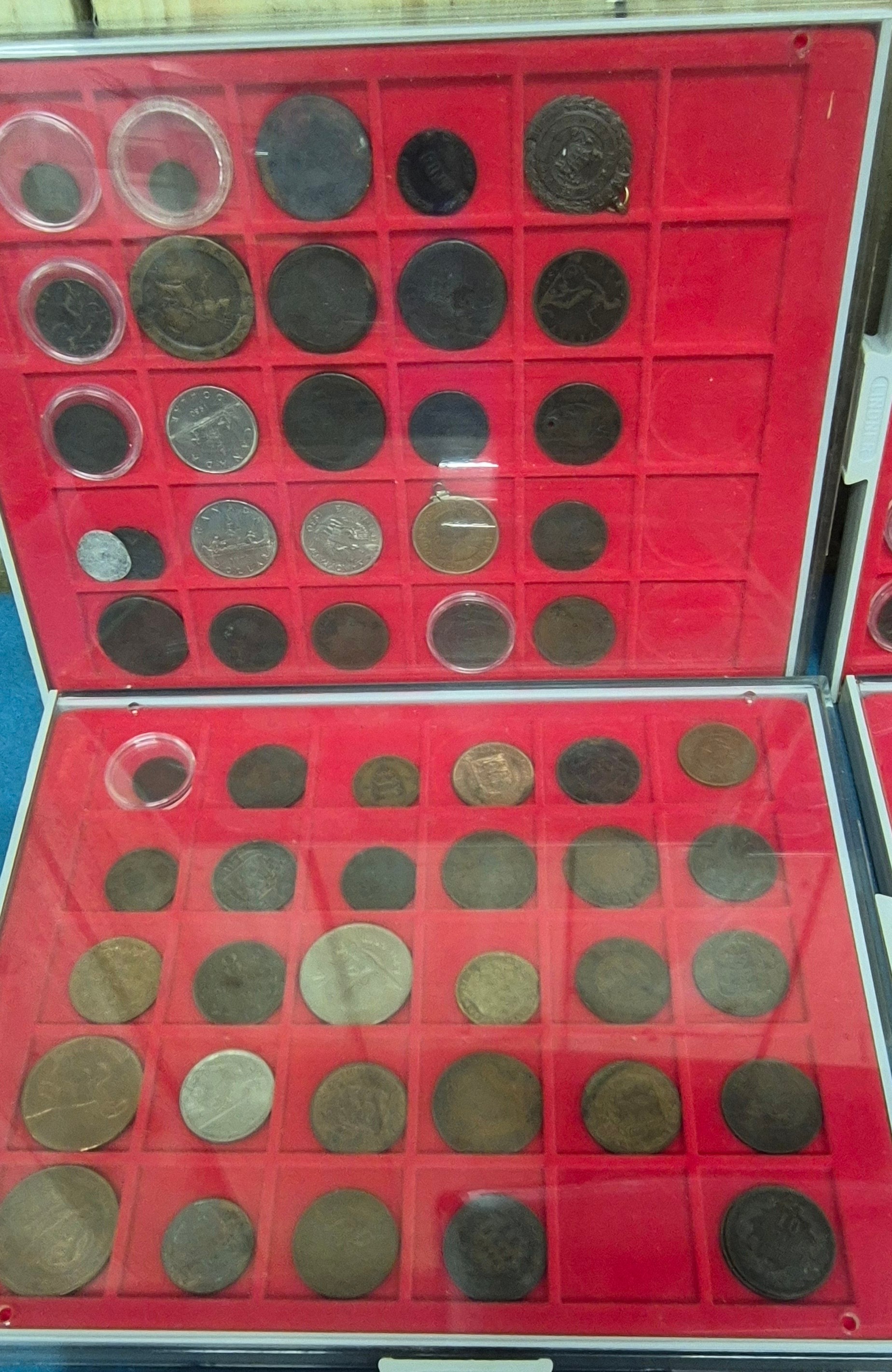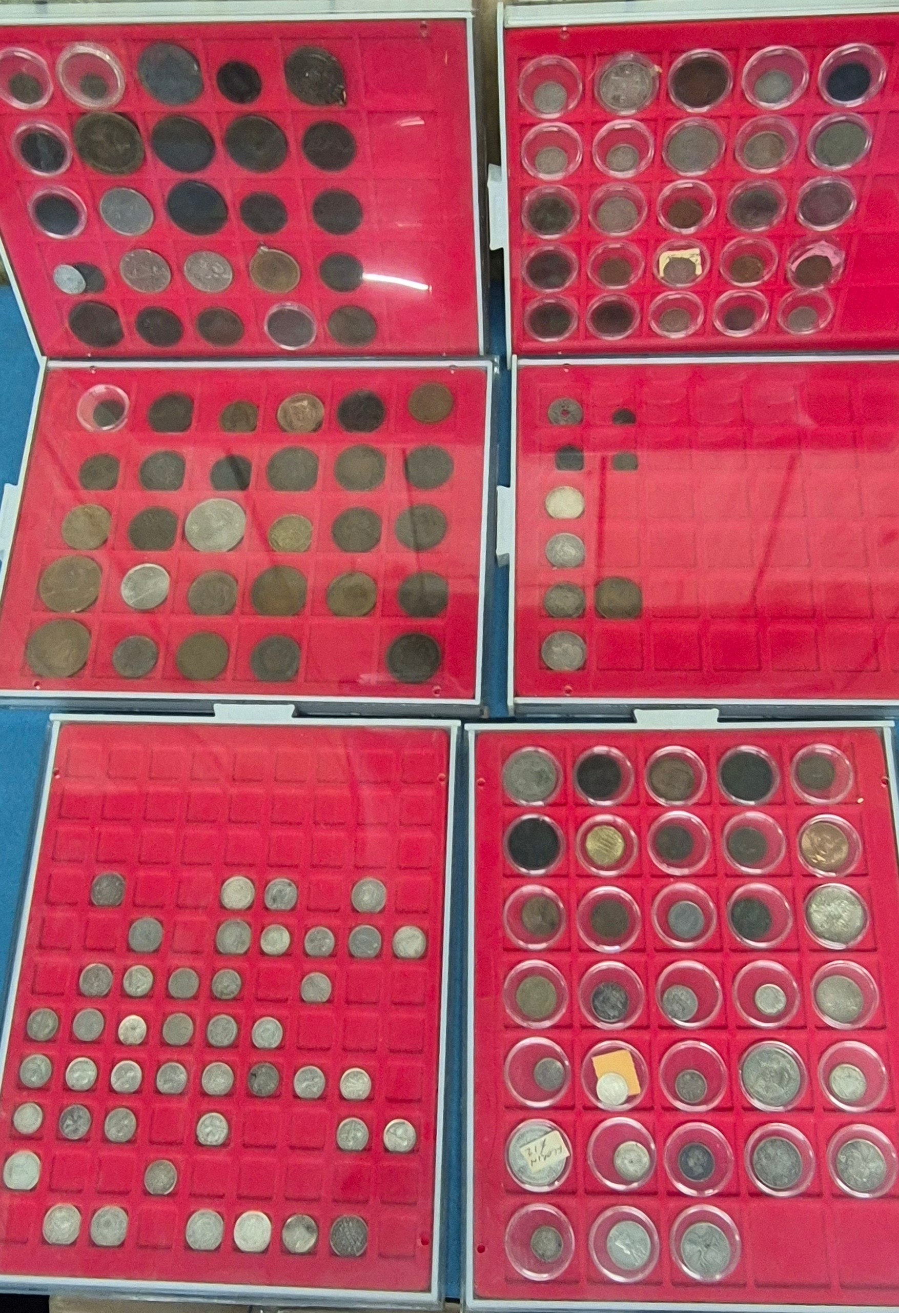 Six coin drawers containing a collection of mixed 18th, 19th and 20th century coins. Includes silver coins, Georgian Cartwheel coin, Masonic token coin and many others.