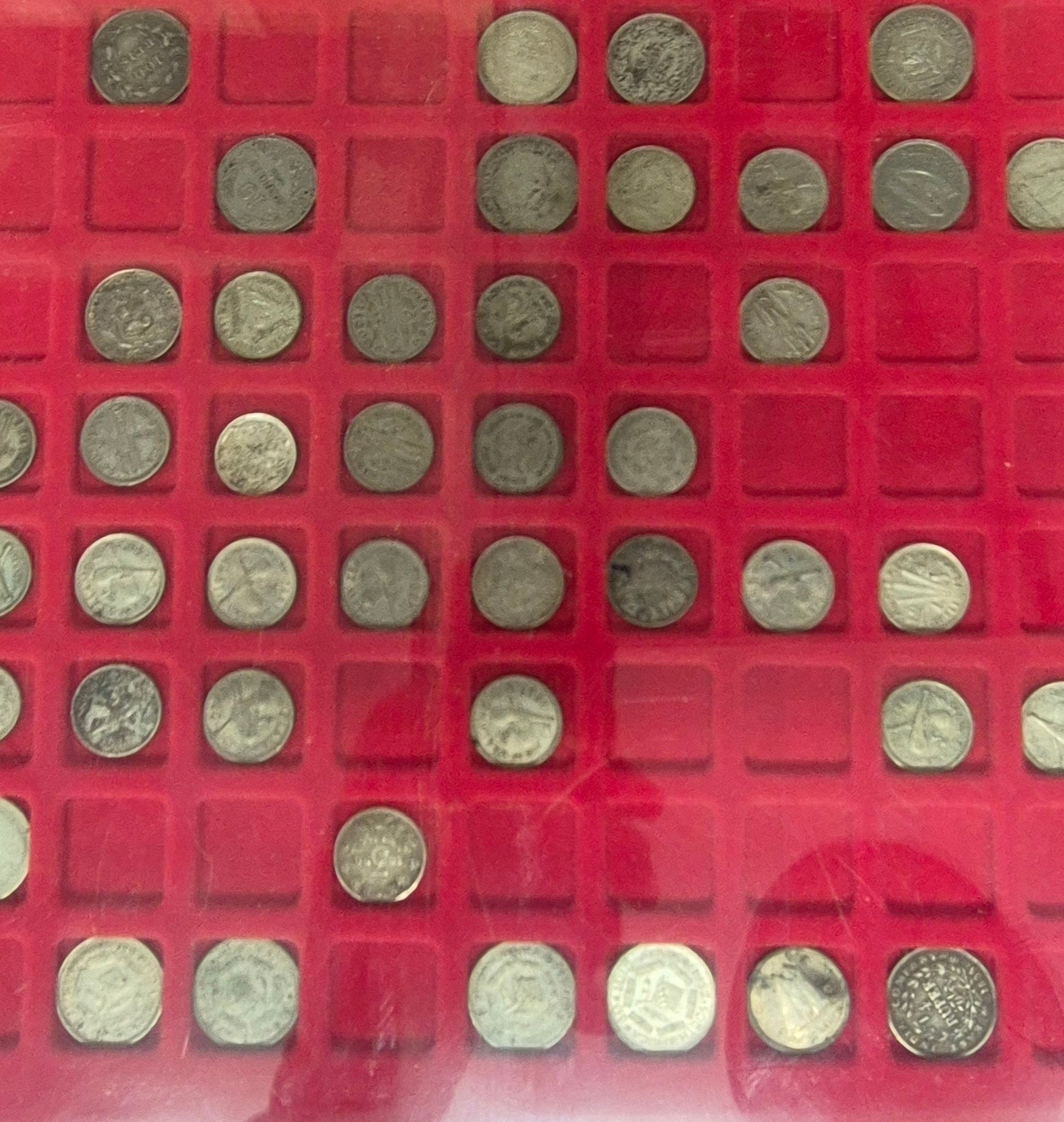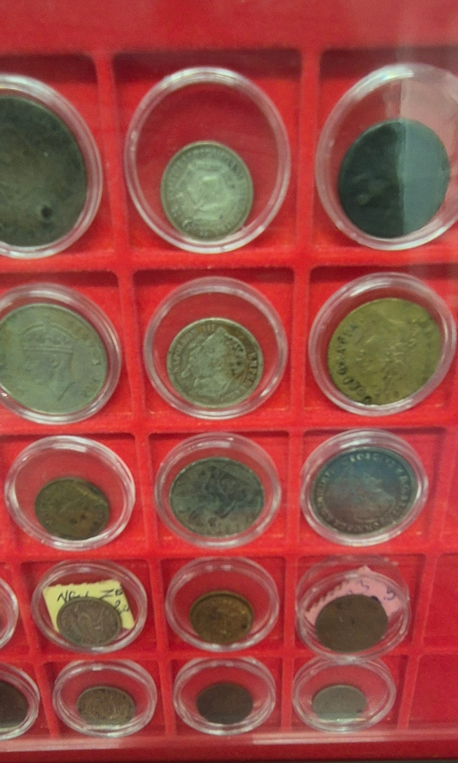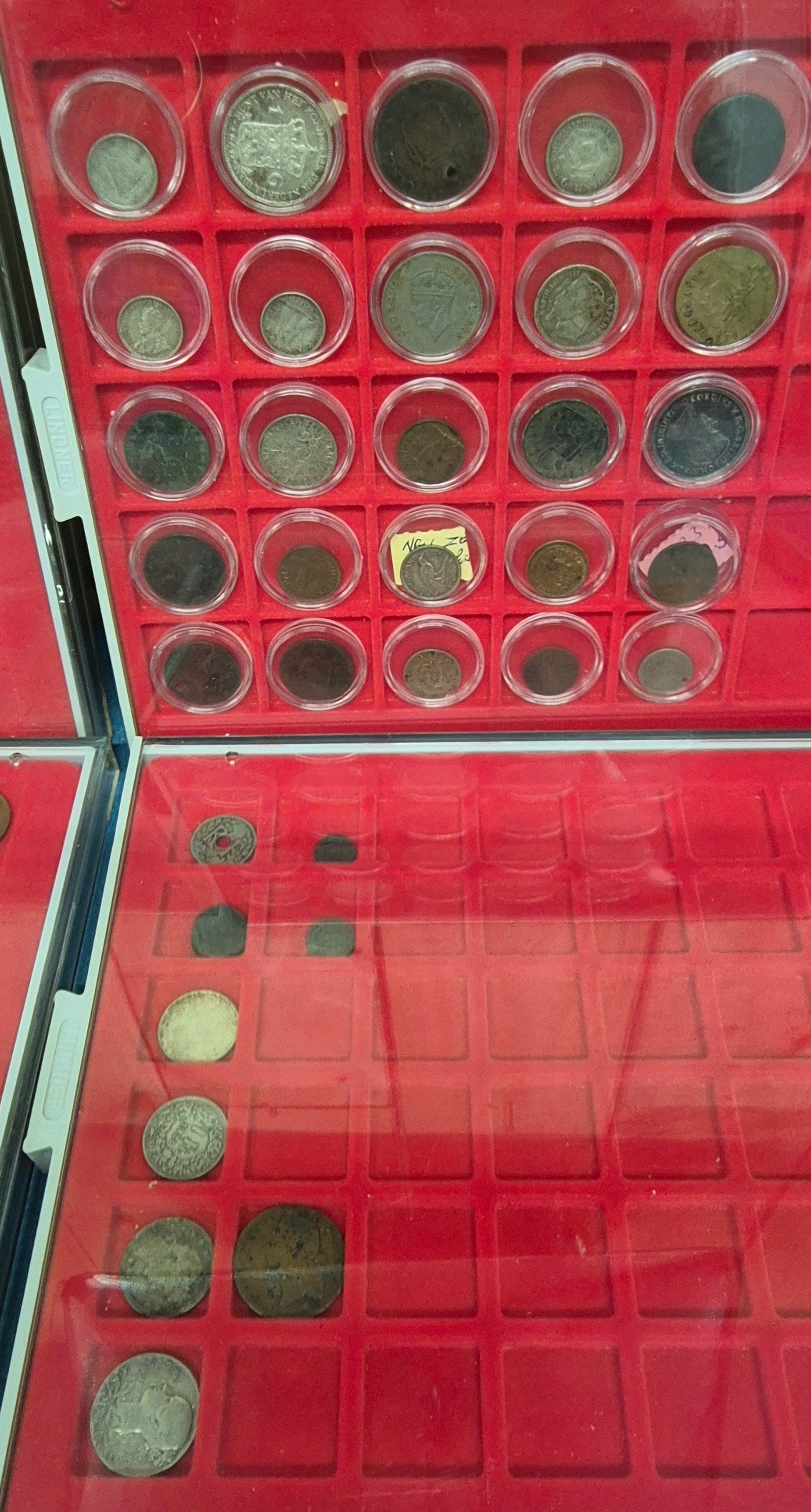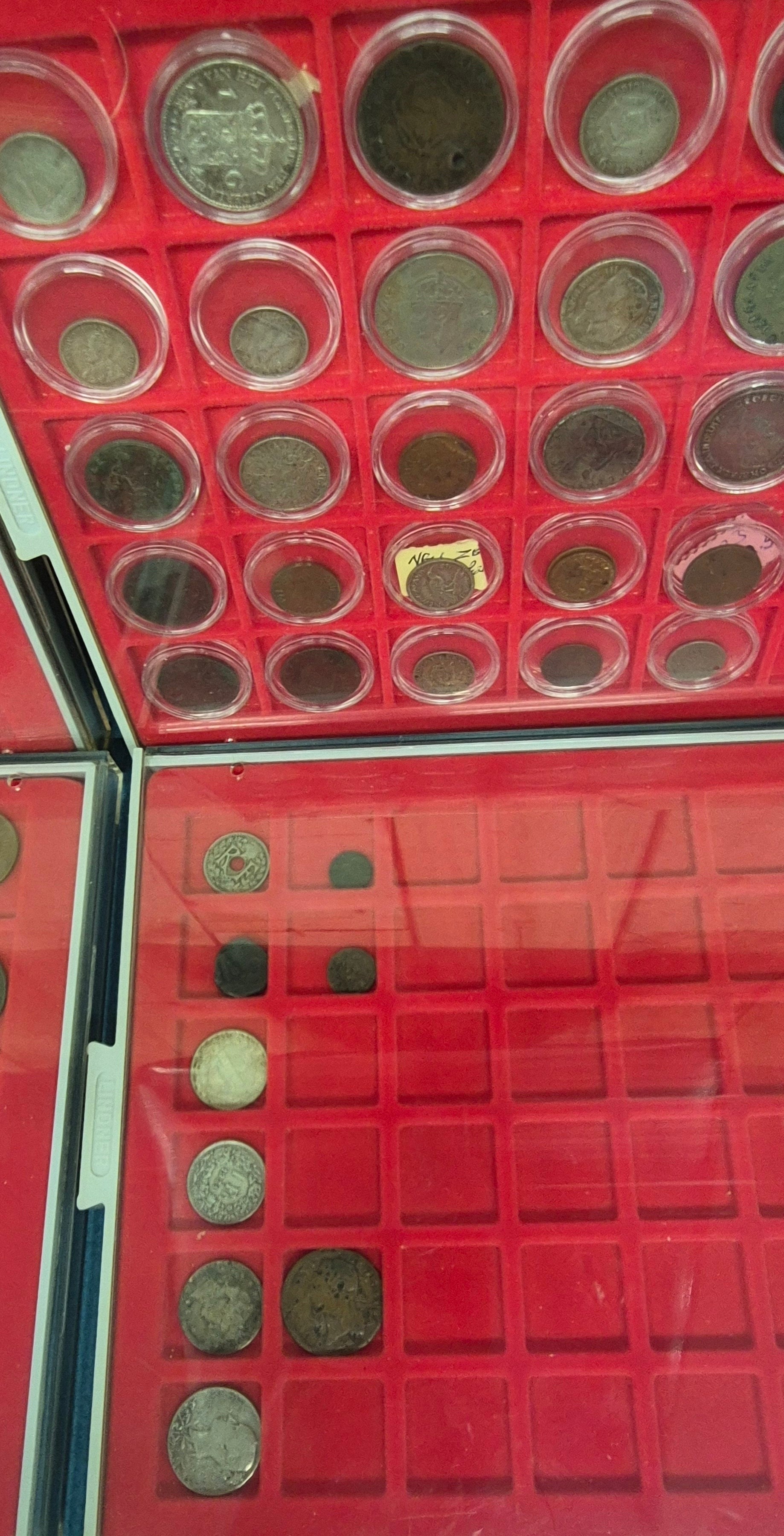 Six coin drawers containing a collection of mixed 18th, 19th and 20th century coins. Includes silver coins, Georgian Cartwheel coin, Masonic token coin and many others.