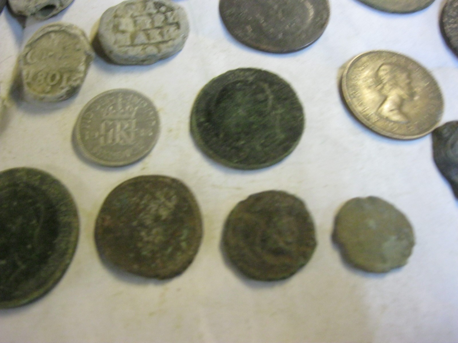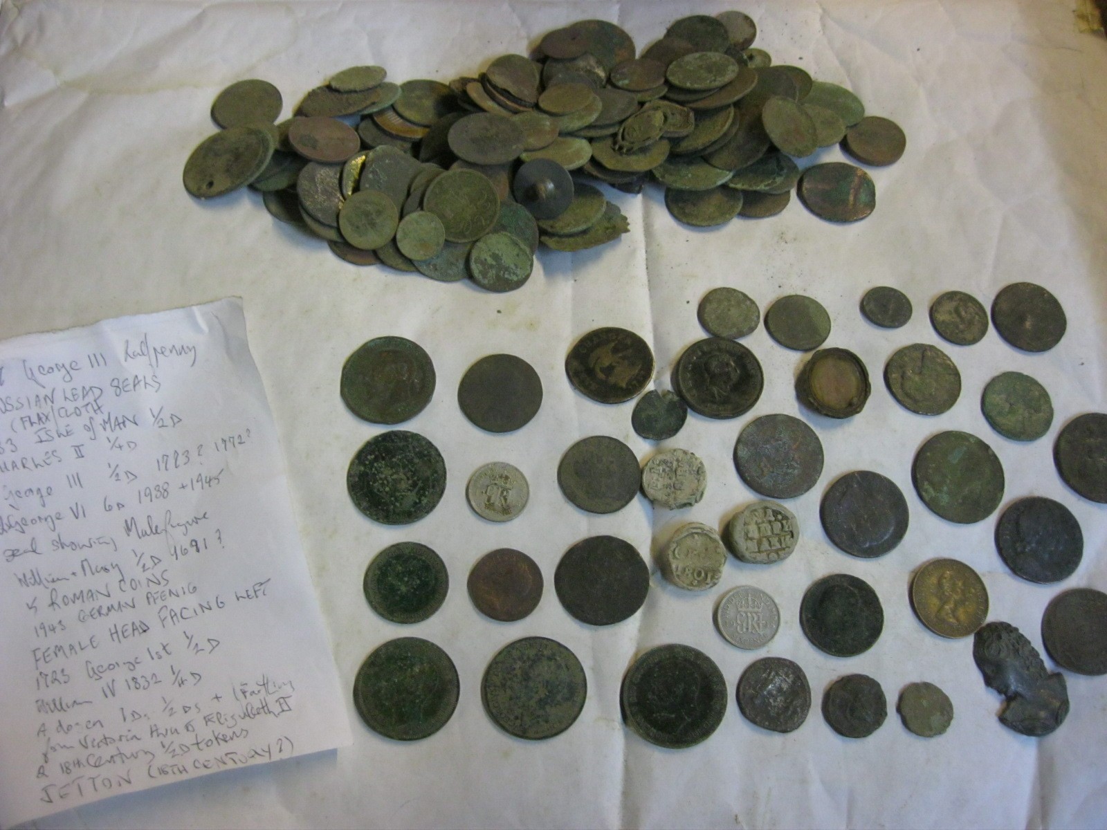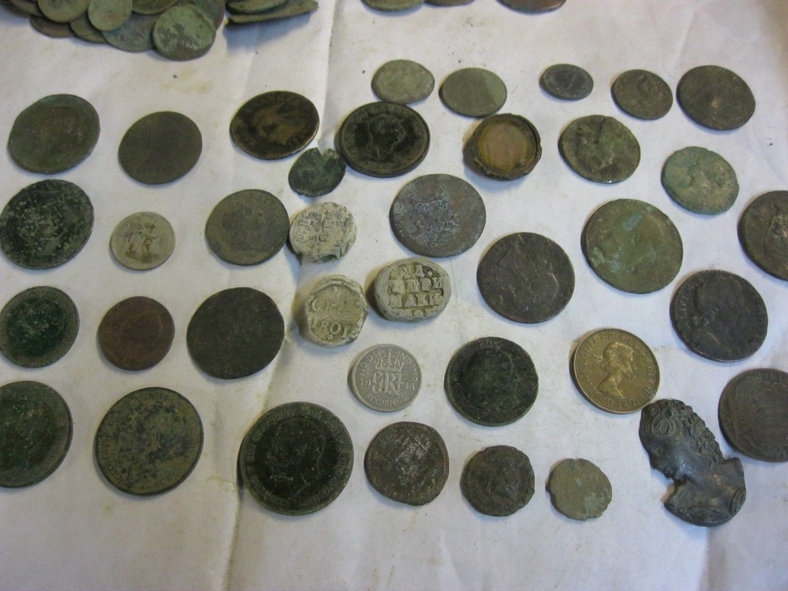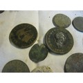 Box of metal detecting find coins including 1733 Isle of Man 'Sans Charger' 1/2d, Charles II Farthing, 1723 George I 1/2d, 18thC Jeton, 1807 George III 1/2d, various Roman coins and other interesting coins (about half the tub are just badly worn scrap, the other half are reasonable condition)