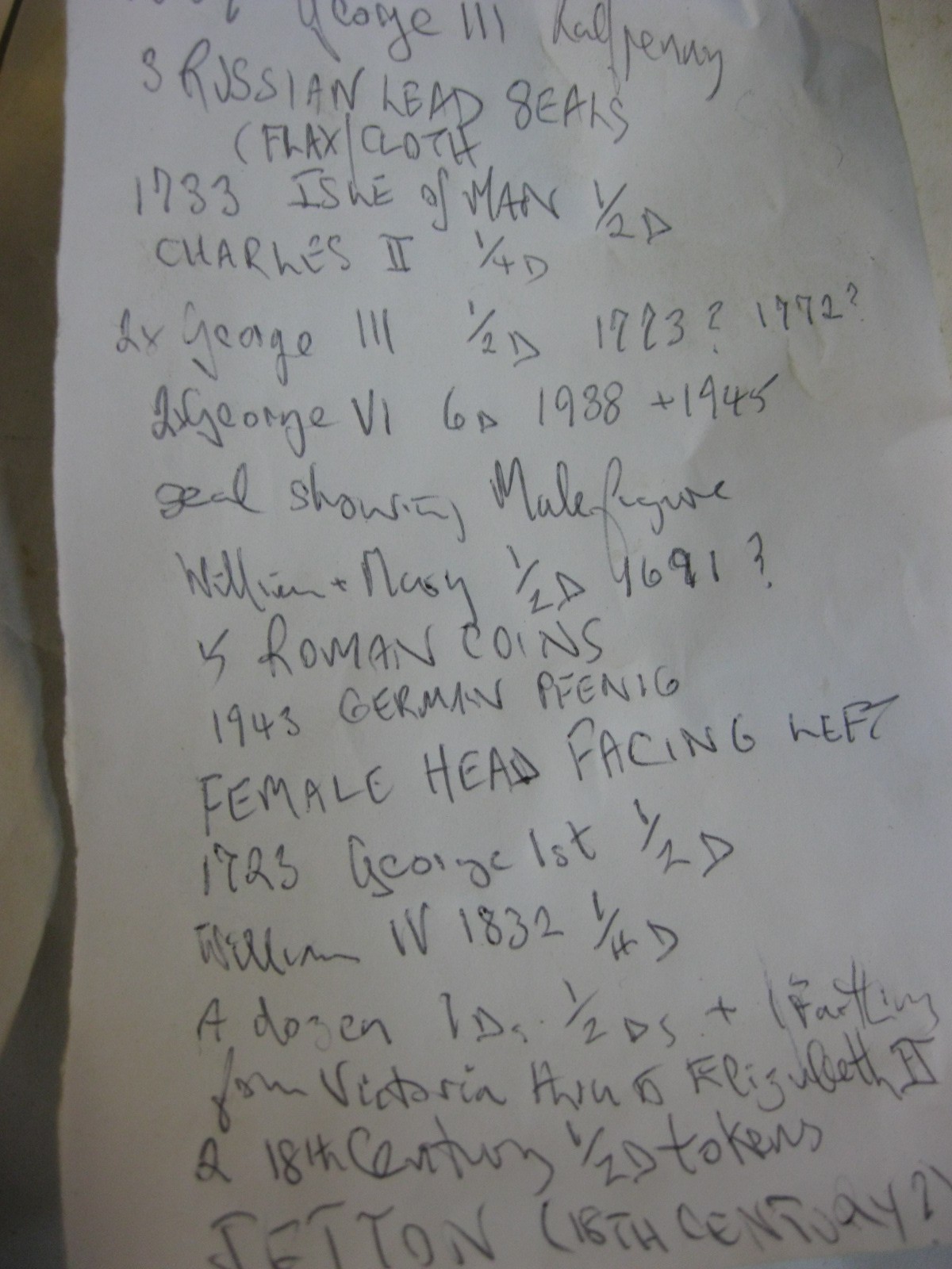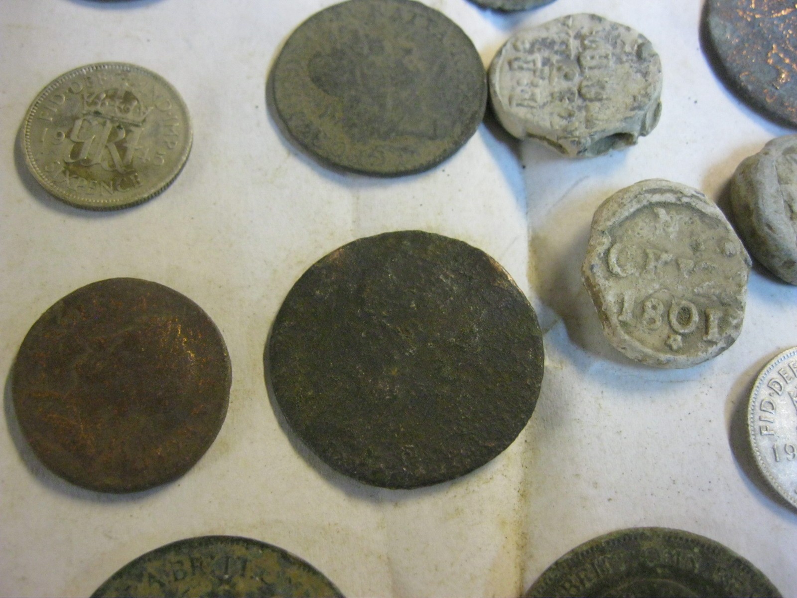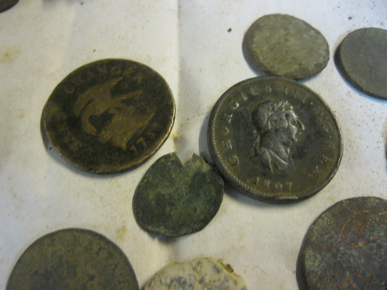 Box of metal detecting find coins including 1733 Isle of Man 'Sans Charger' 1/2d, Charles II Farthing, 1723 George I 1/2d, 18thC Jeton, 1807 George III 1/2d, various Roman coins and other interesting coins (about half the tub are just badly worn scrap, the other half are reasonable condition)