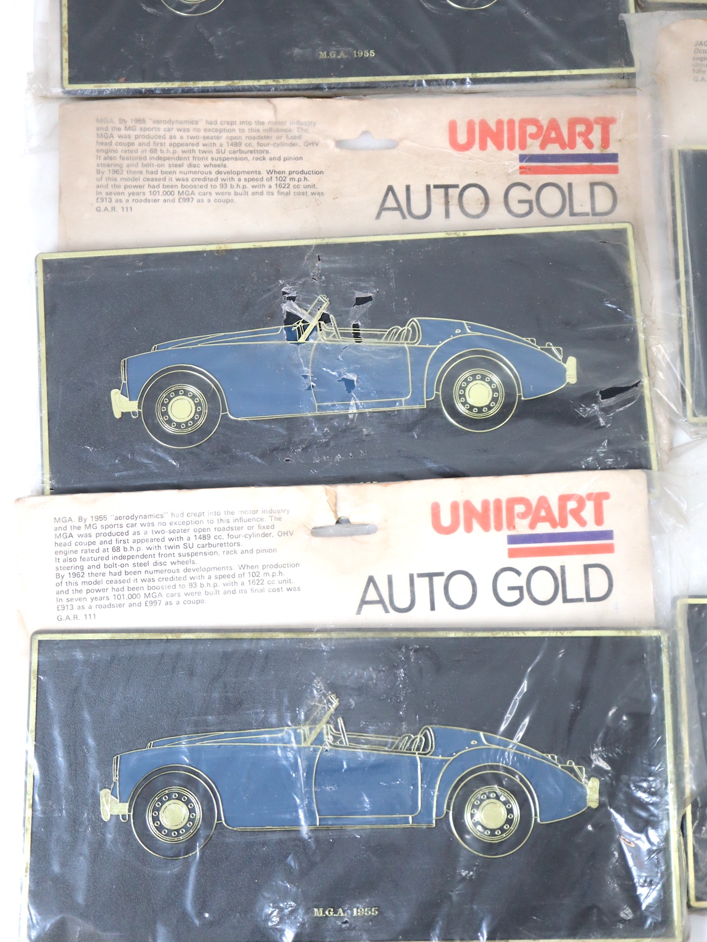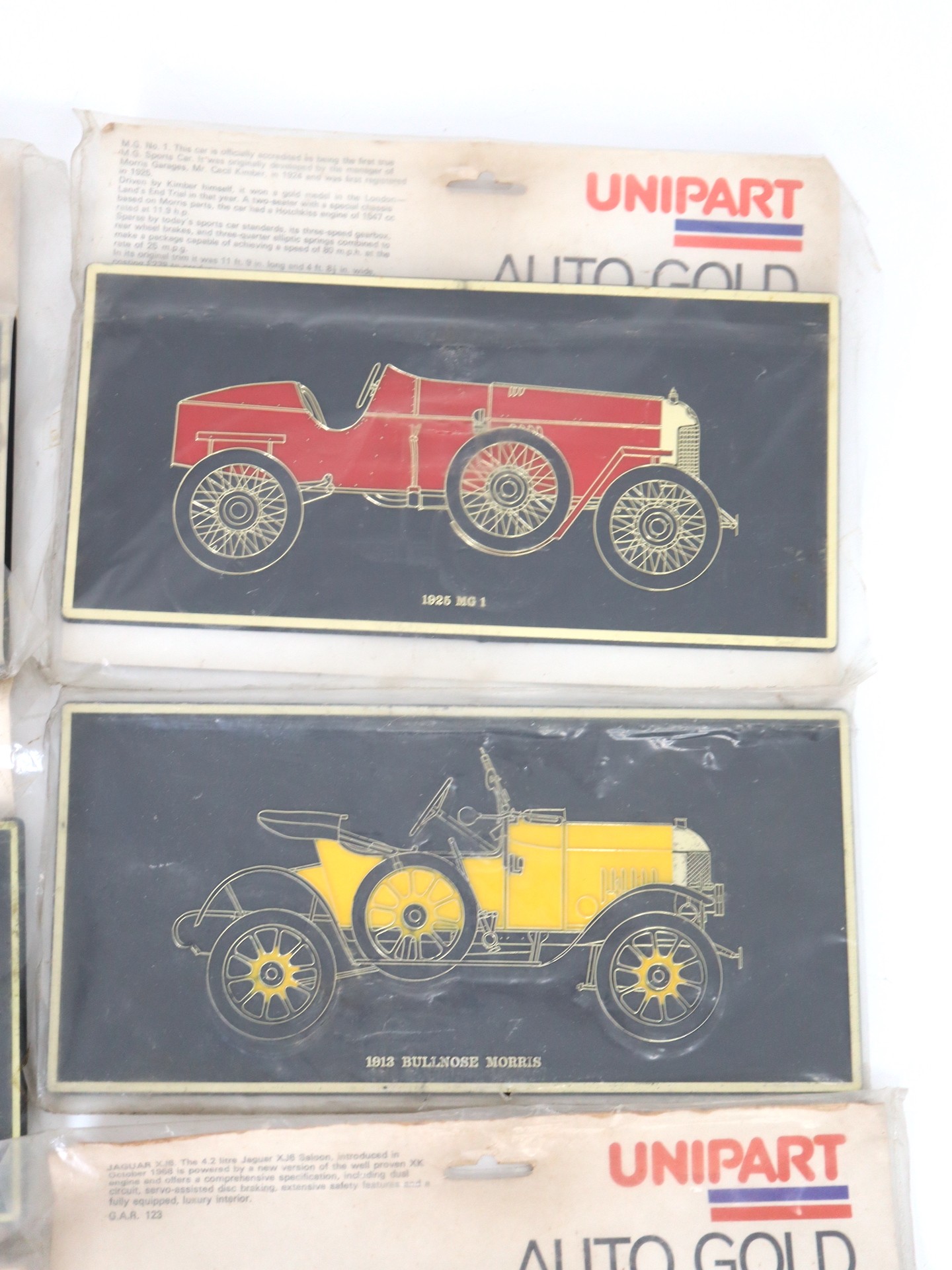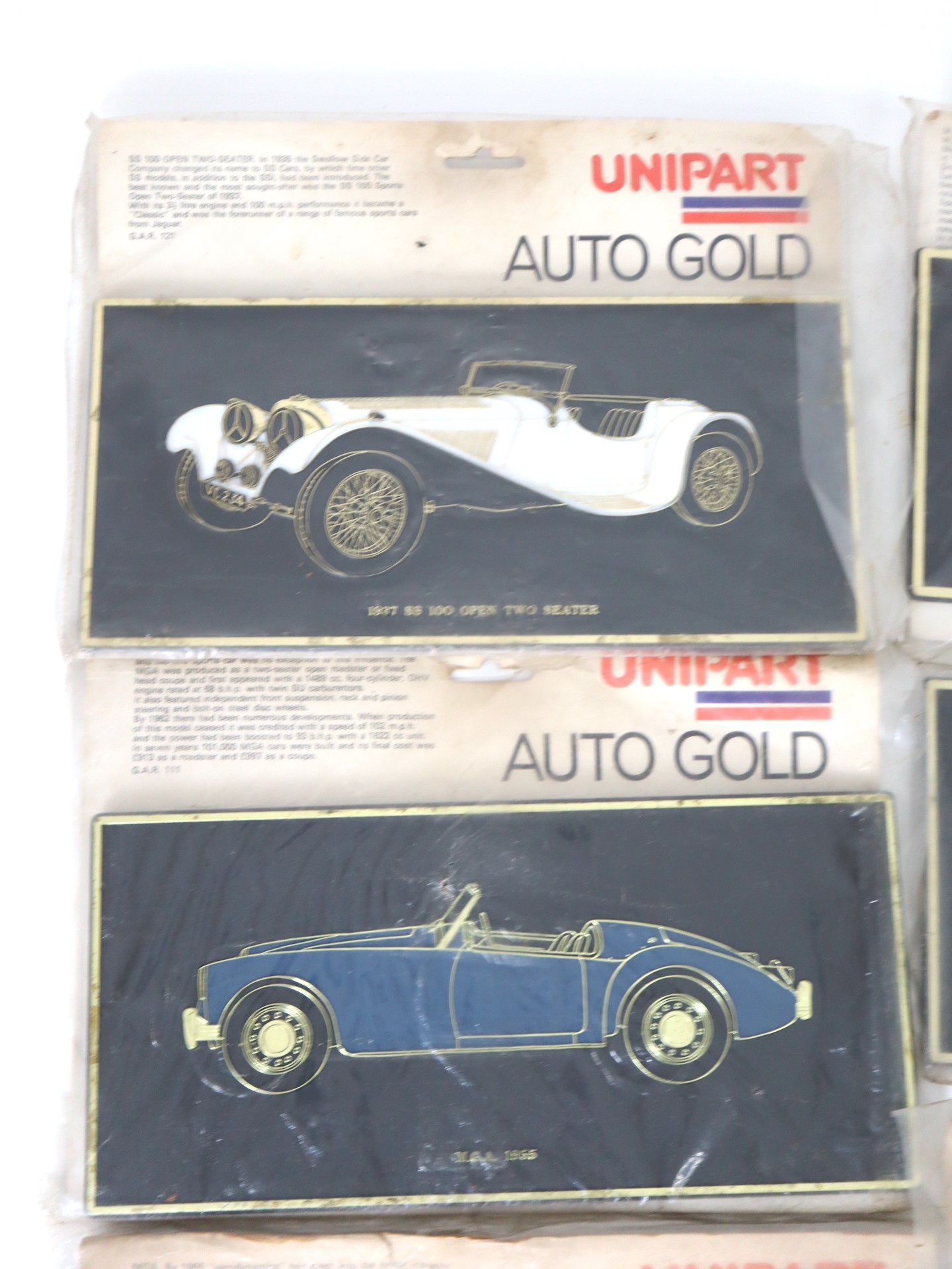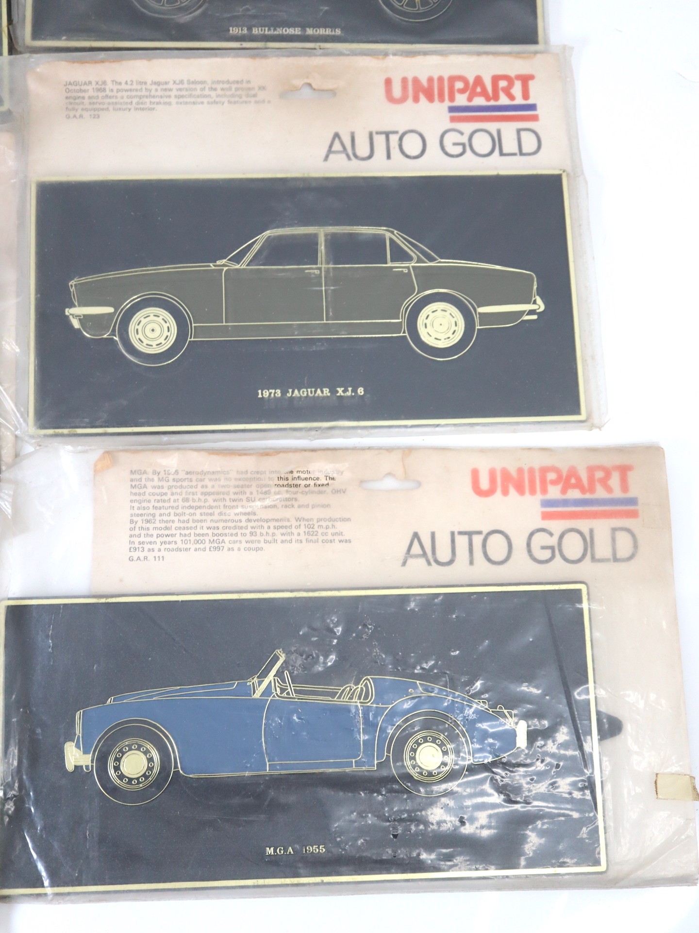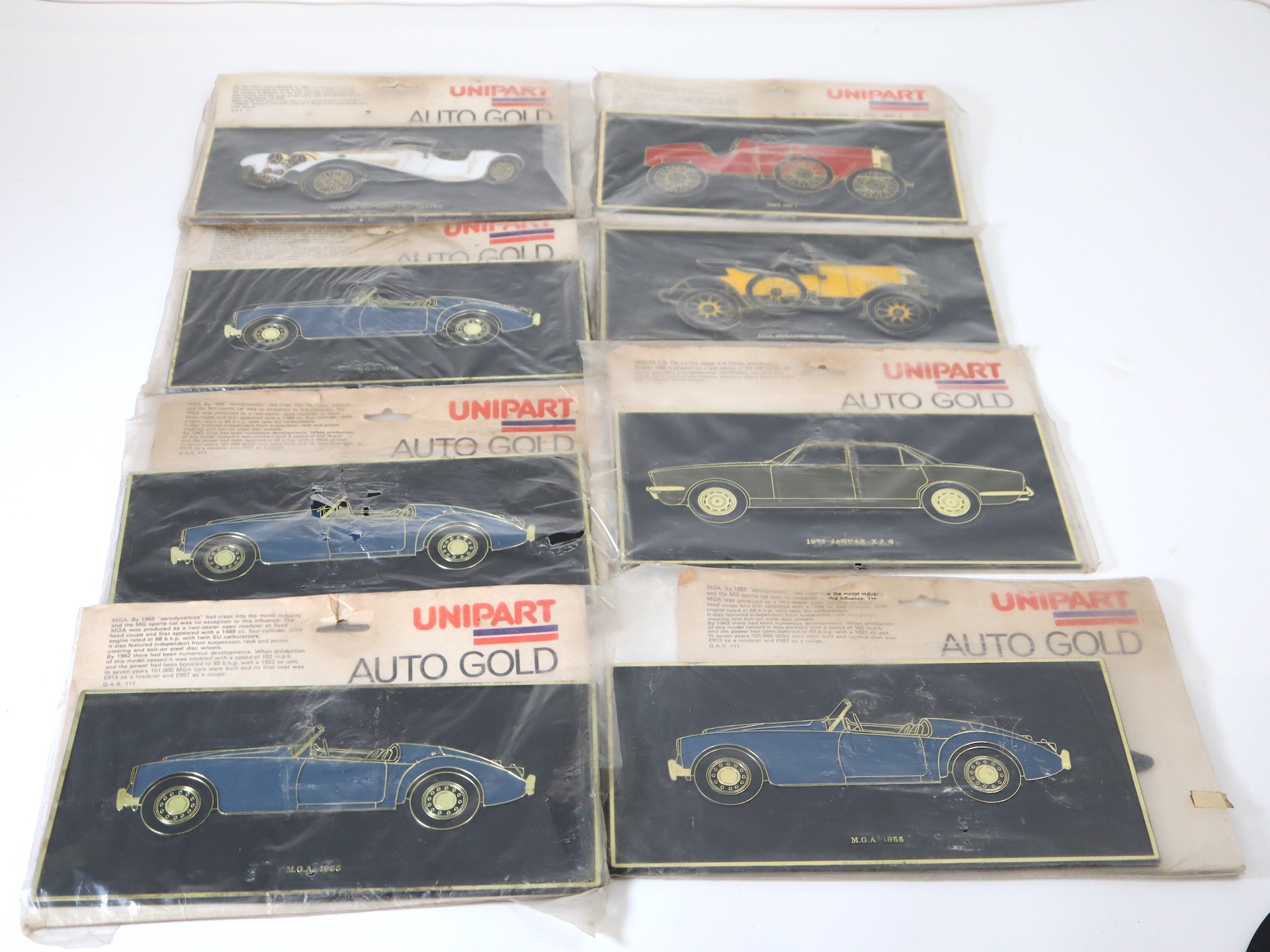 A vintage group of eight Uni-Part Auto Gold Plaques