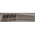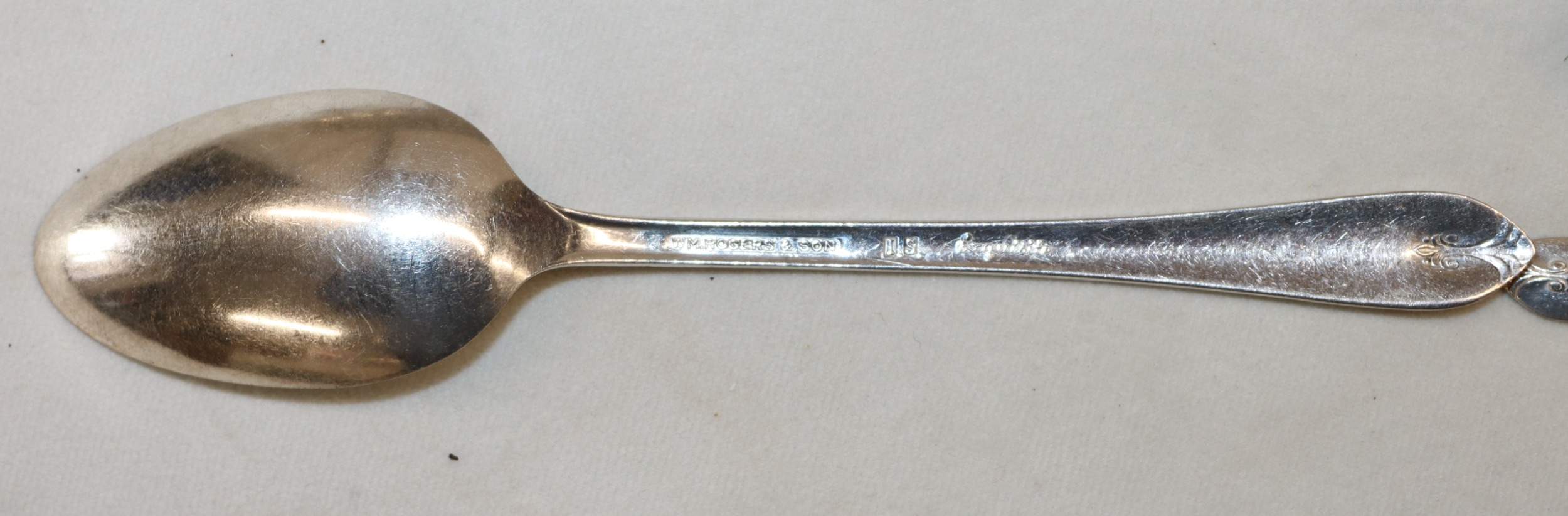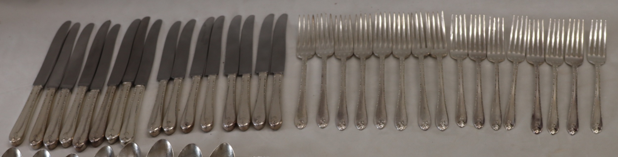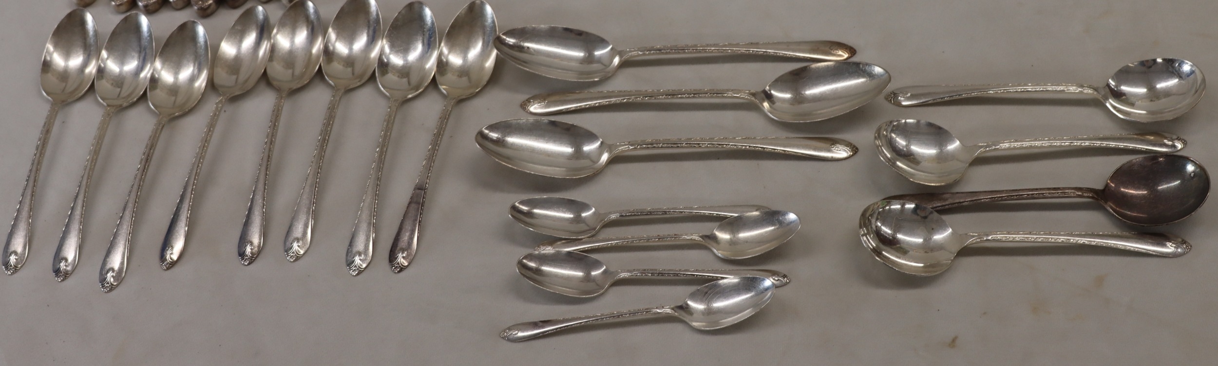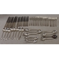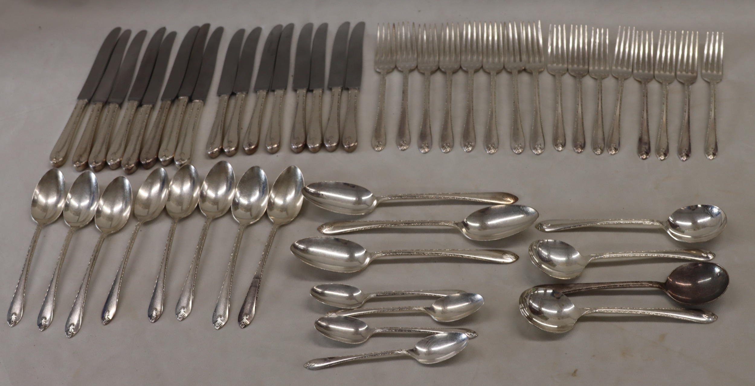 WM Rogers & Son silver plated flatware set, 8 large knives, 8 small knives, 8 large forks, 8 small forks, 8 spoons, 3 serving spoons, 4 soup spoons, 5 teaspoons.