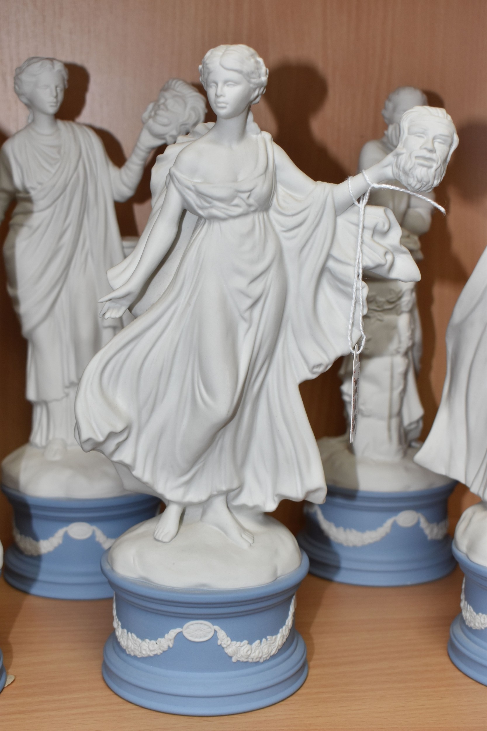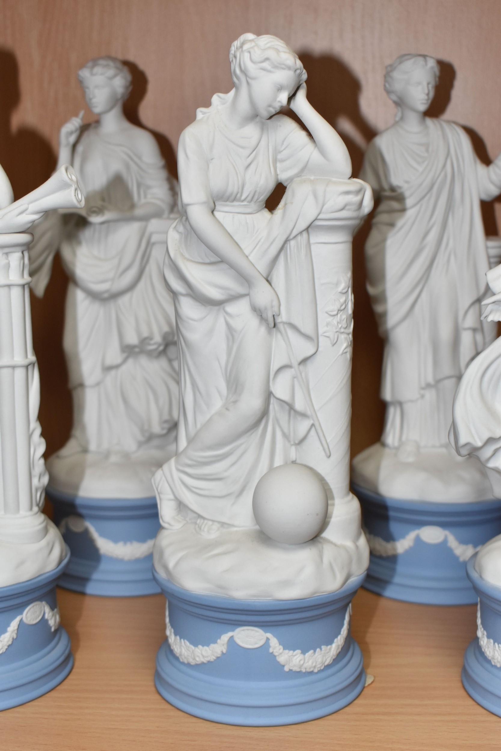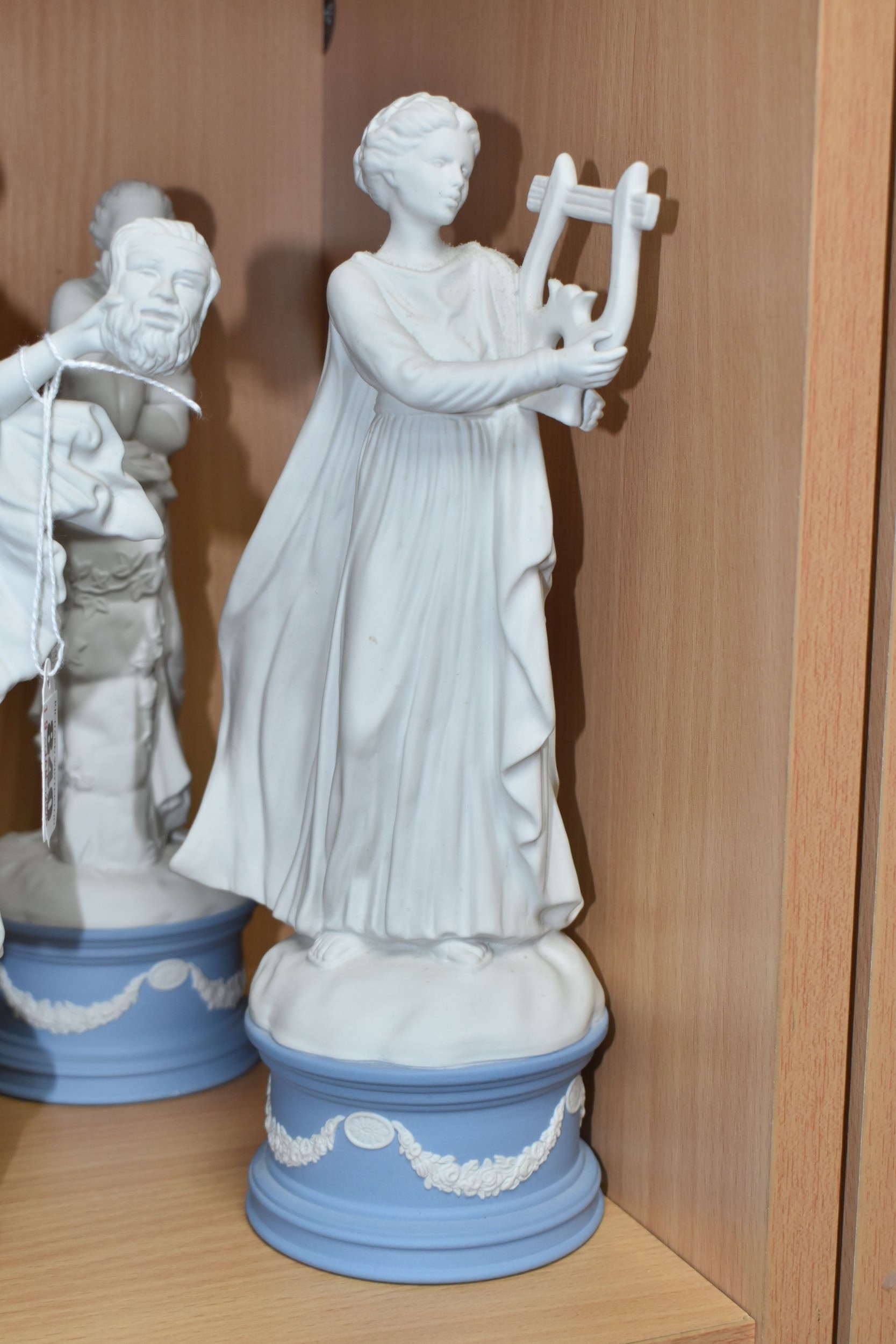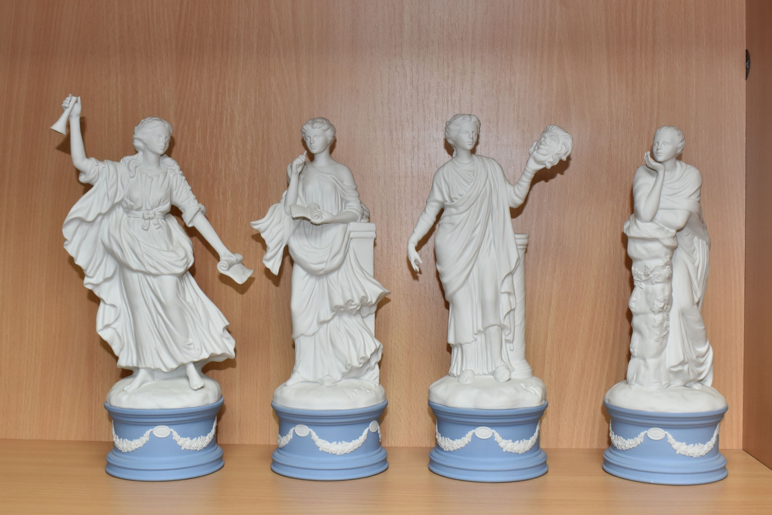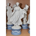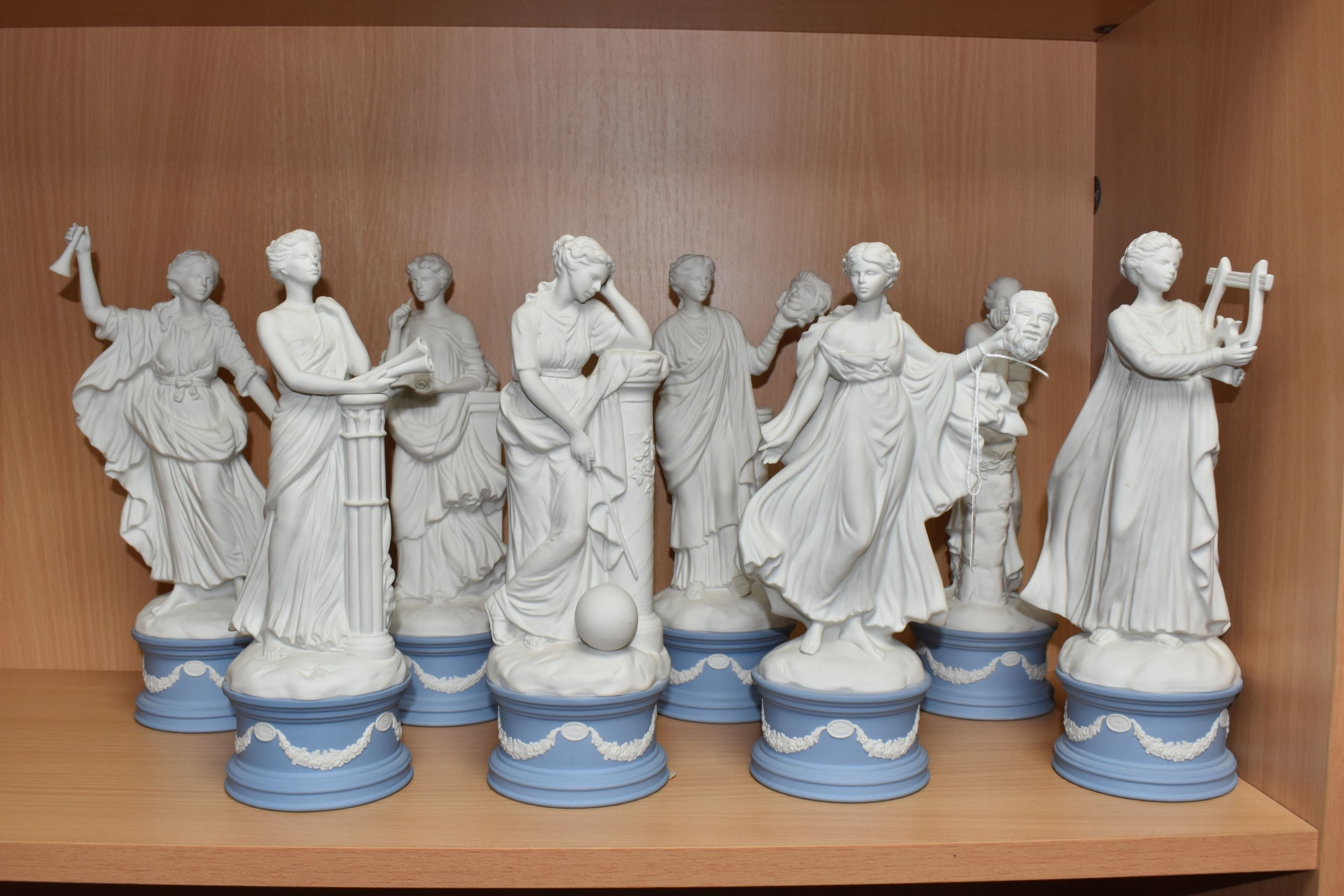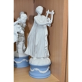 EIGHT WEDGWOOD 'CLASSICAL MUSES' COLLECTION FIGURINES, limited edition Jasperware figurines comprising Euterpe 470/12500, Clio 814/12500 (loss to end of instrument), Polymnia 91/12500, Calliope 1489/12500, Urania 447/12500, Thalia 467/12500, Melpomene 1338/12500, and Terpsichore 338/12500, height of tallest approximately 27.5cm (8) (Condition Report: most figurines appear in good condition, specific obvious damage as stated, a little dusty)