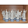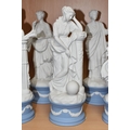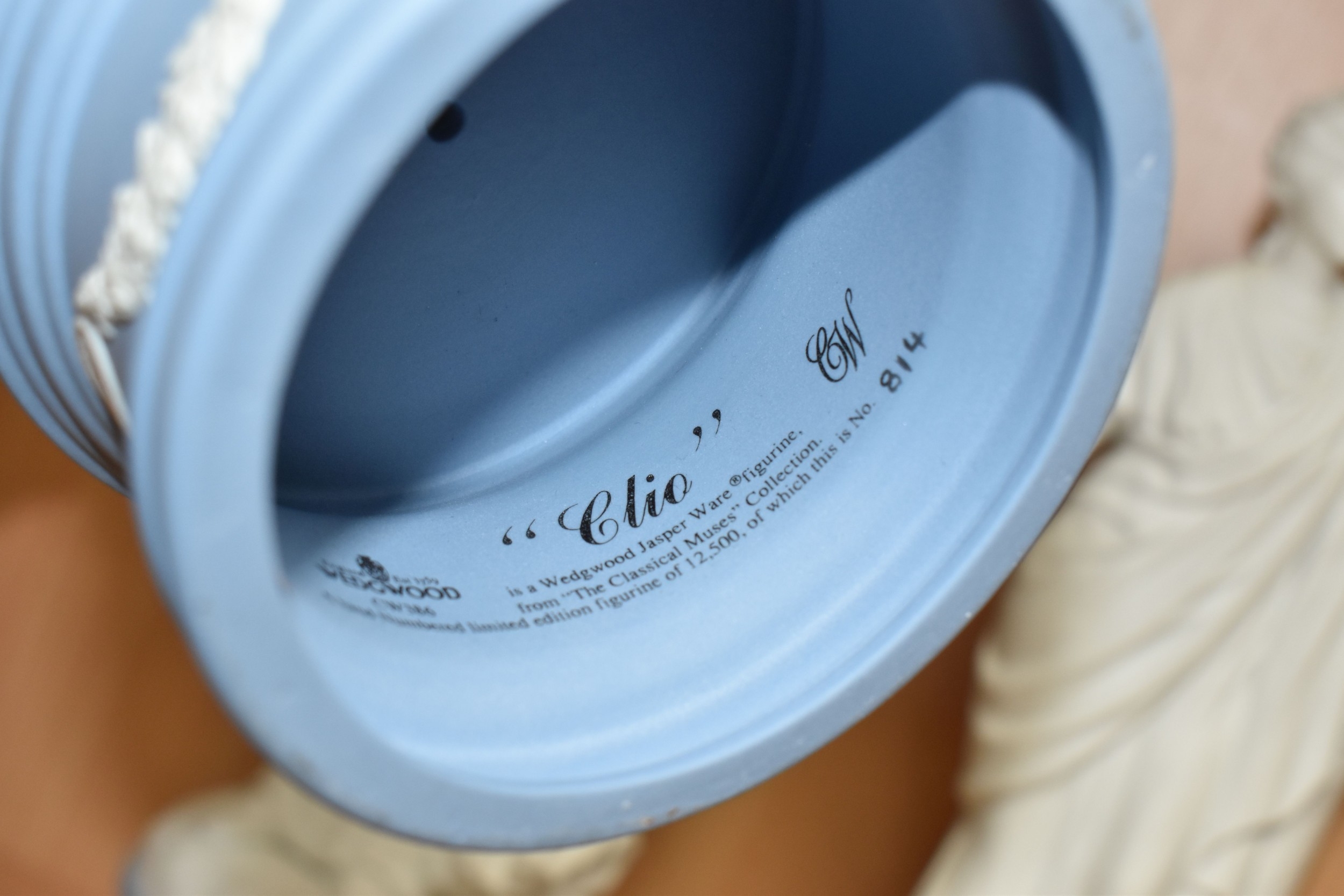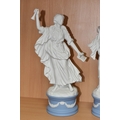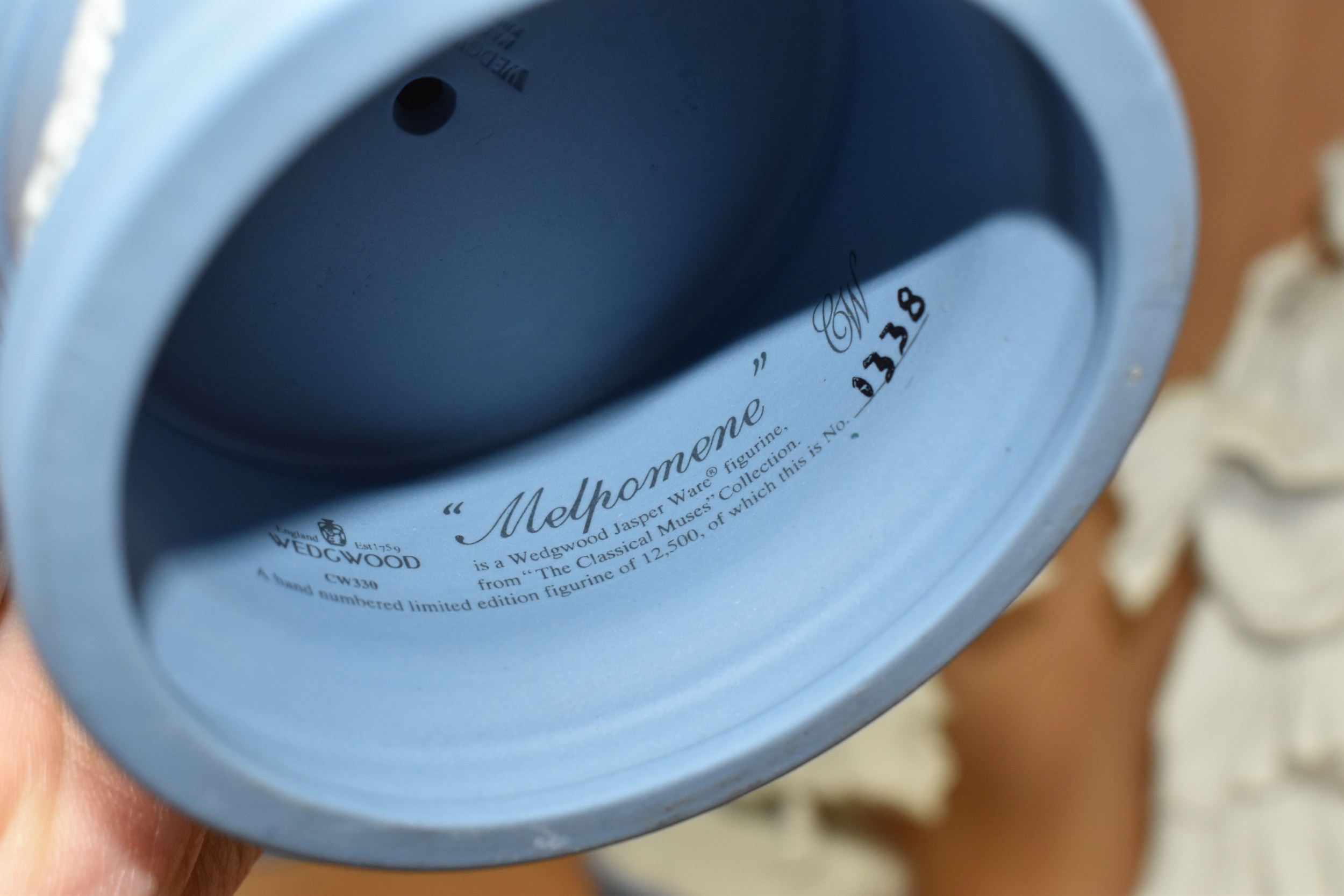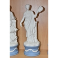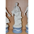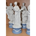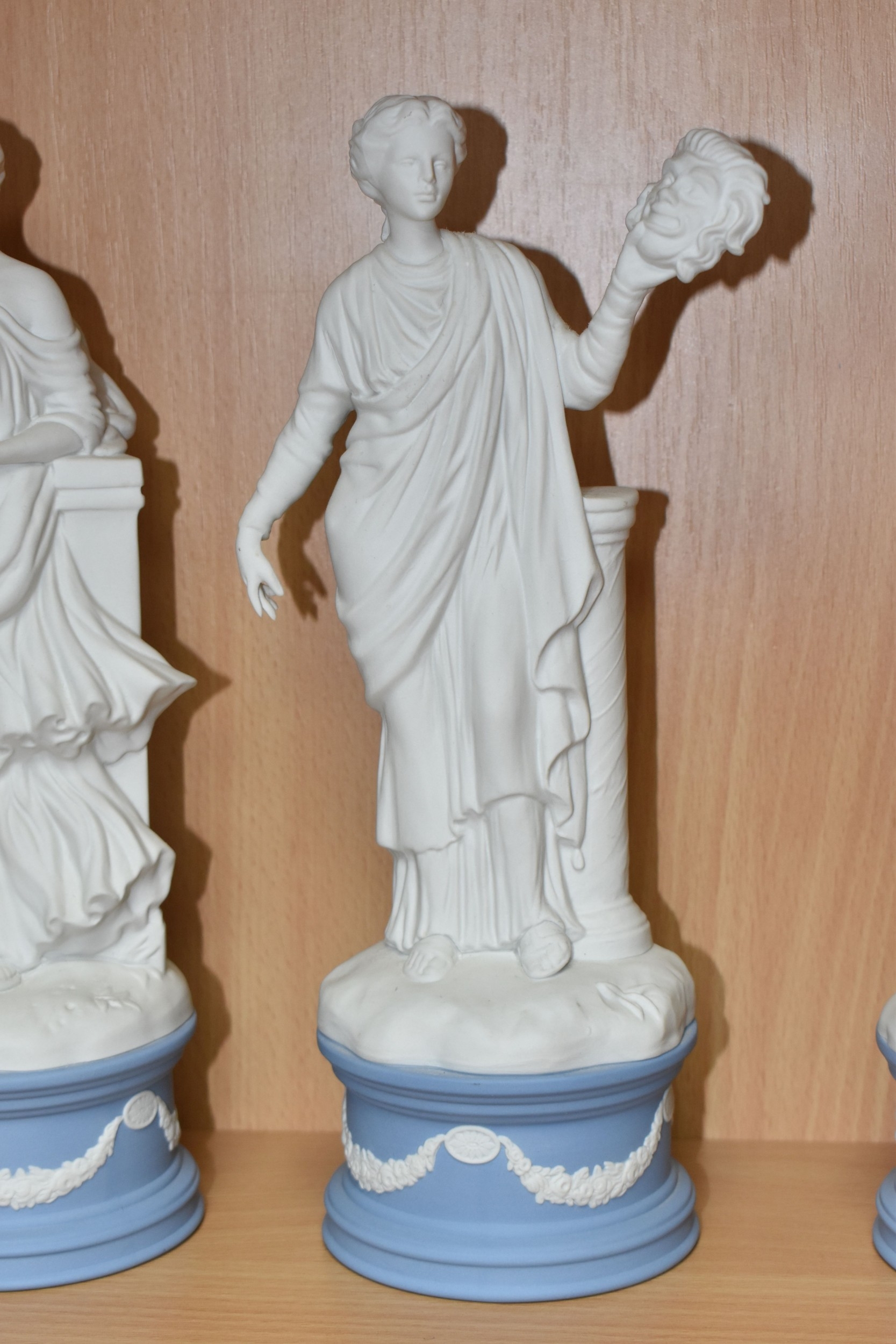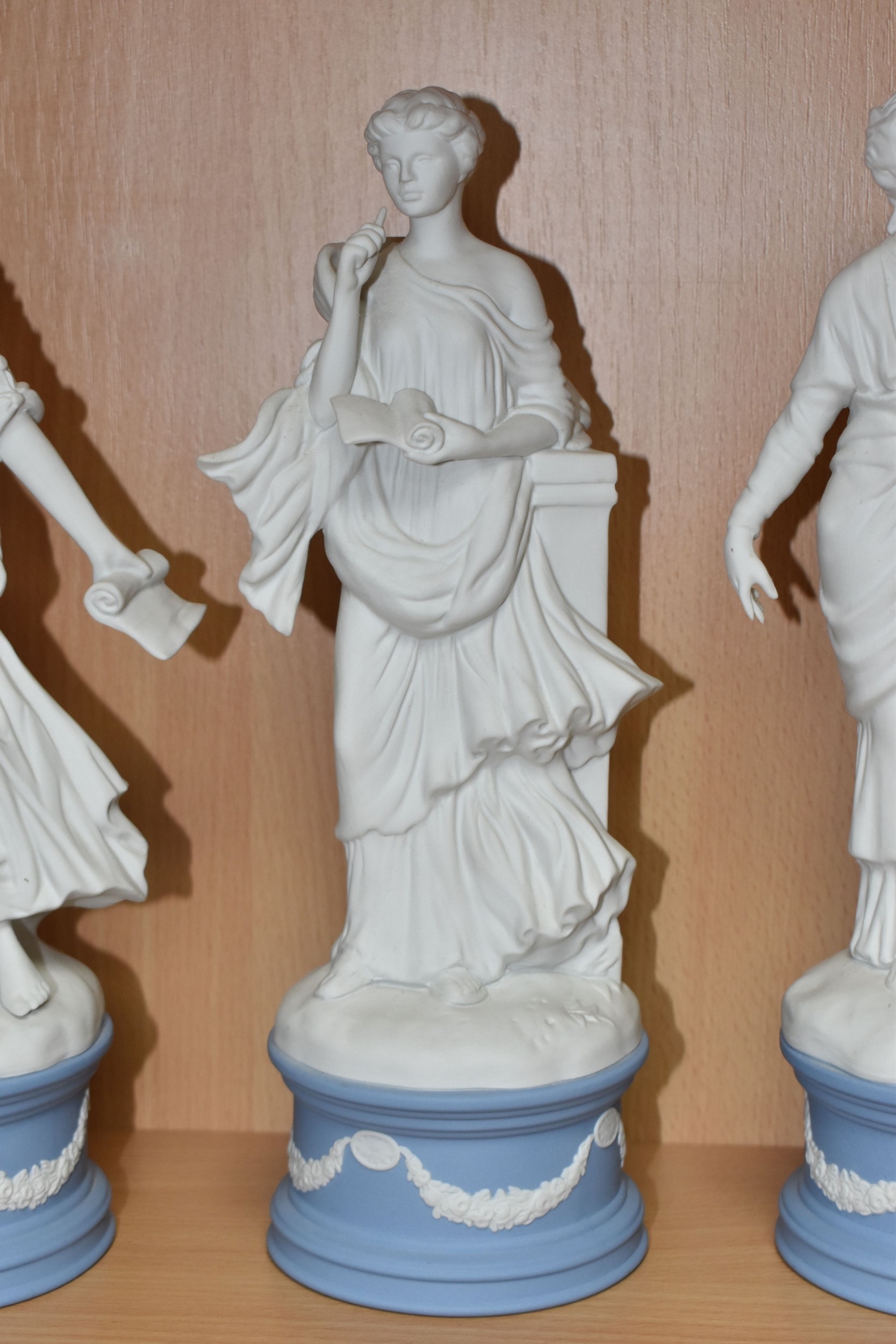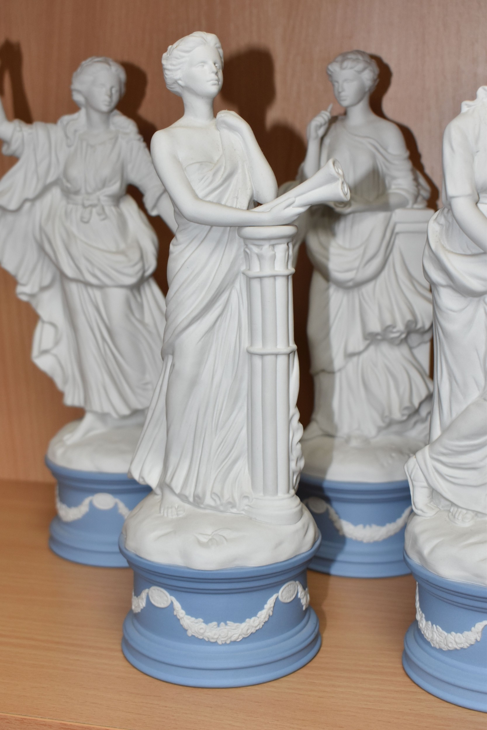 EIGHT WEDGWOOD 'CLASSICAL MUSES' COLLECTION FIGURINES, limited edition Jasperware figurines comprising Euterpe 470/12500, Clio 814/12500 (loss to end of instrument), Polymnia 91/12500, Calliope 1489/12500, Urania 447/12500, Thalia 467/12500, Melpomene 1338/12500, and Terpsichore 338/12500, height of tallest approximately 27.5cm (8) (Condition Report: most figurines appear in good condition, specific obvious damage as stated, a little dusty)