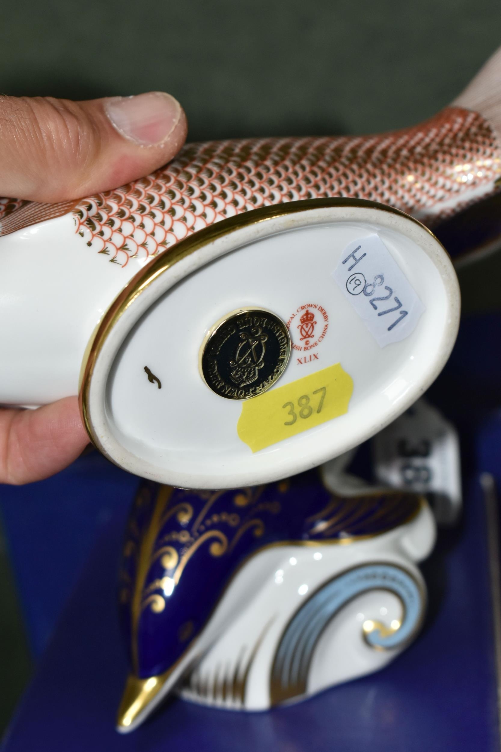 TWO BOXED ROYAL CROWN DERBY IMARI PAPERWEIGHTS, comprising Golden Carp issued 1986-1991, and Dolphin issued 1987-1993, both with gold button stoppers and original boxes (2) (Condition Report: good condition)