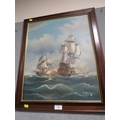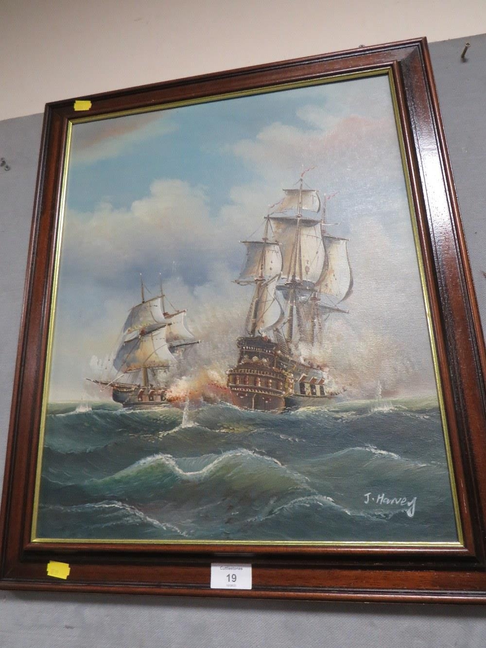 A FRAMED OIL ON CANVAS OF NAVEL BATTLESHIPS OF WAR SIGNED LOWER RIGHT J HARVEY