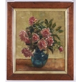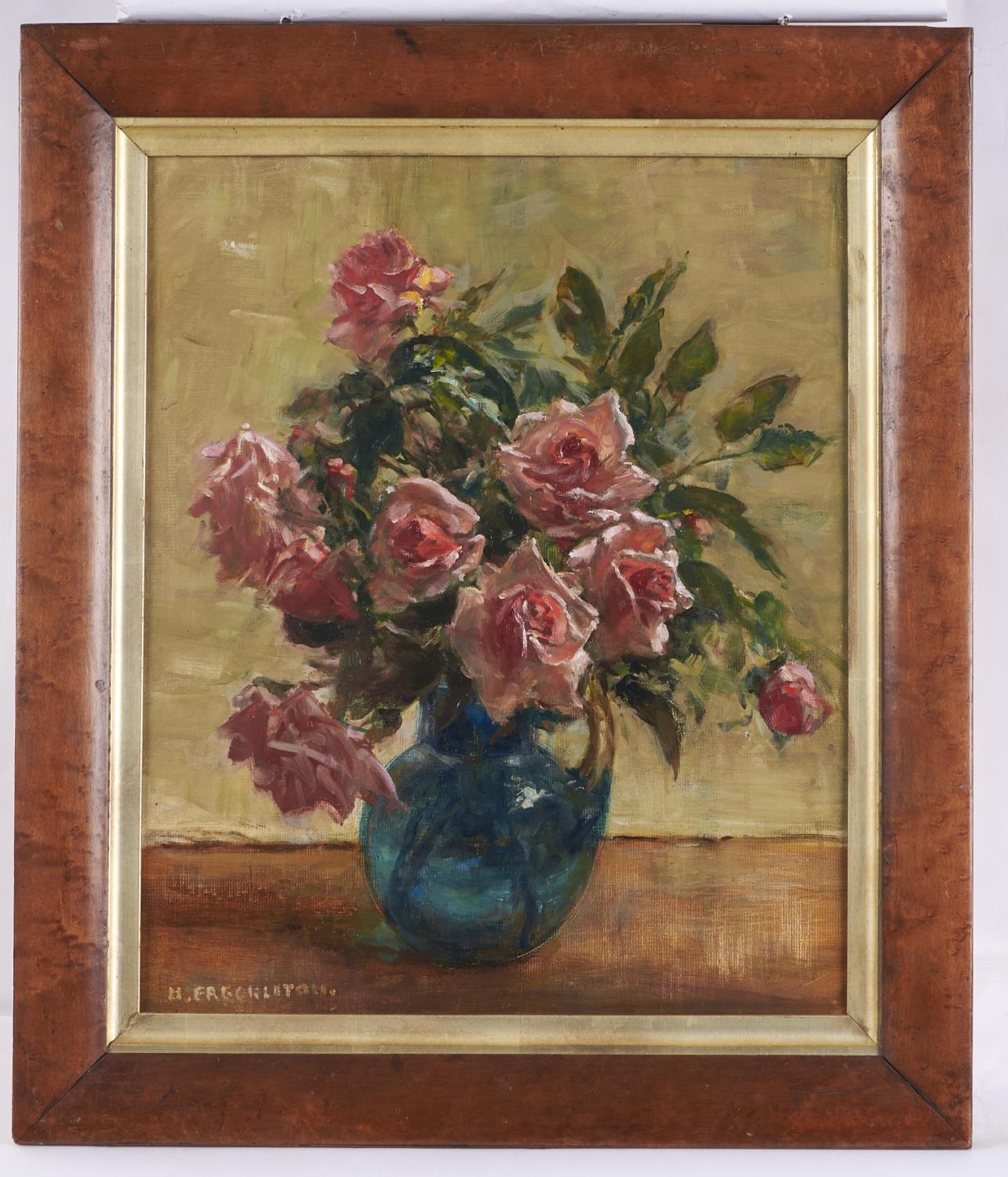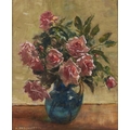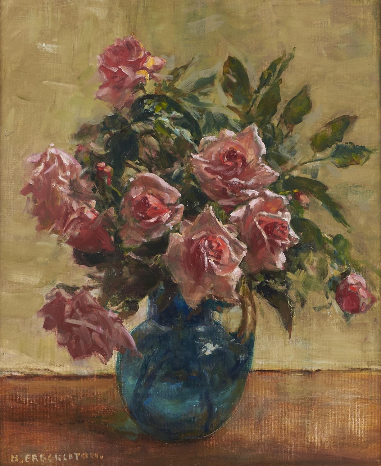 Harry Freckleton (1890-1979) - Still Life of Pink Roses in a Green Jug, oil on artist's board, signed lower left, 48 x 39cm