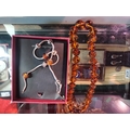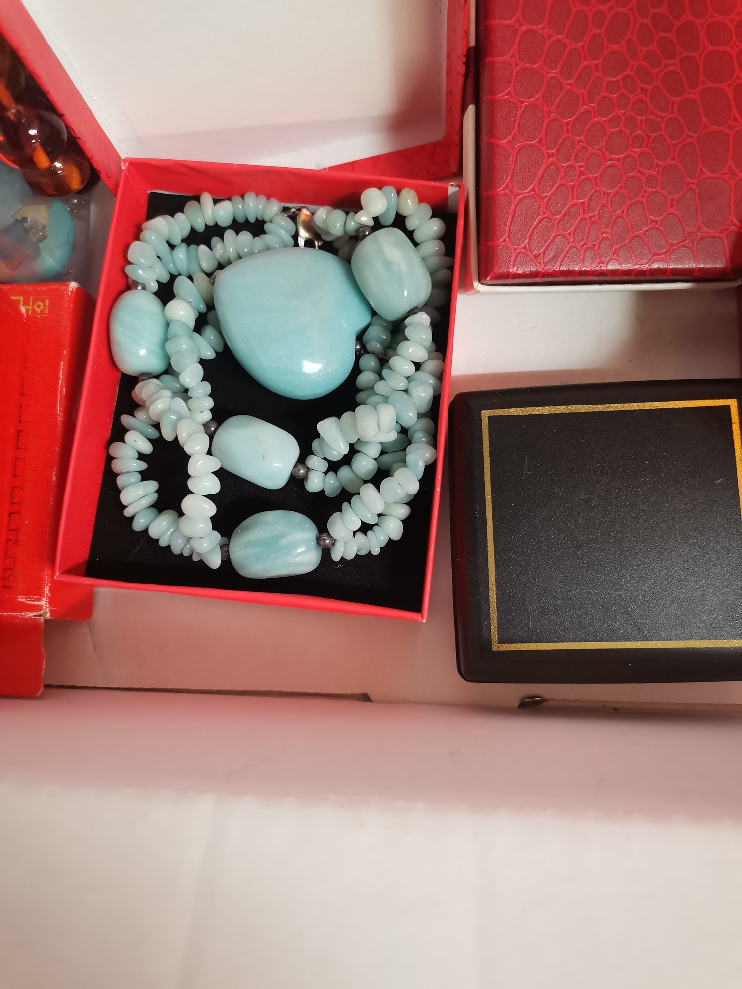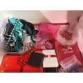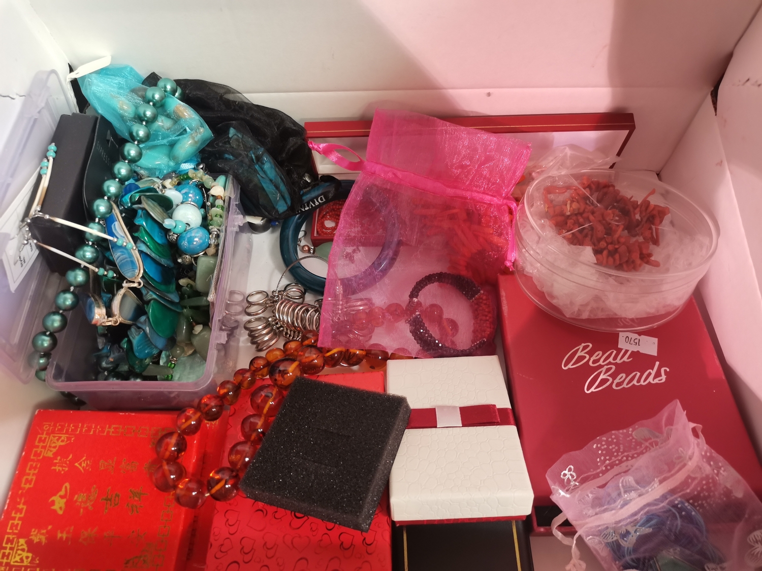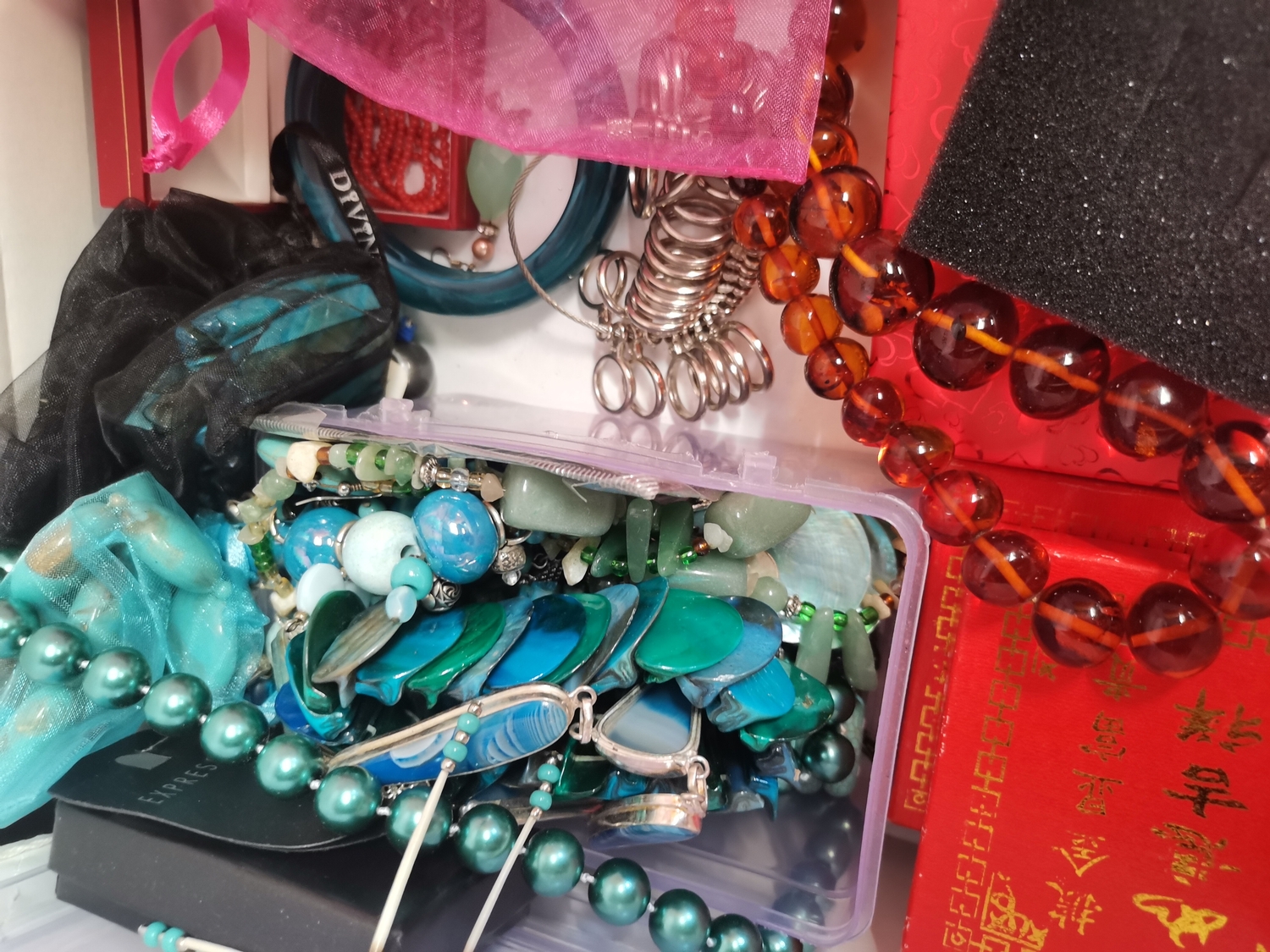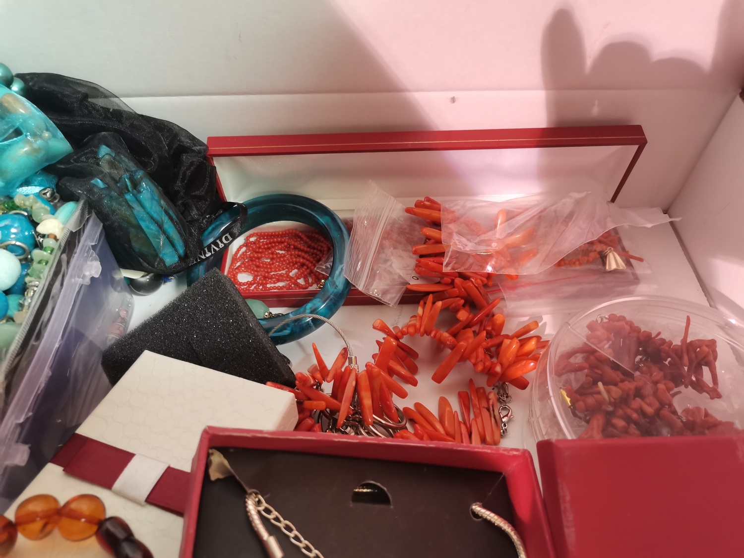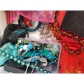A quantity of assorted jewellery and costume jewellery, including jade bangles and necklace; turquoise coloured necklaces, bracelets, earrings; coral necklaces and earrings; amber-type bead necklace; etc. (Qty - one box)