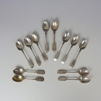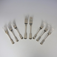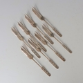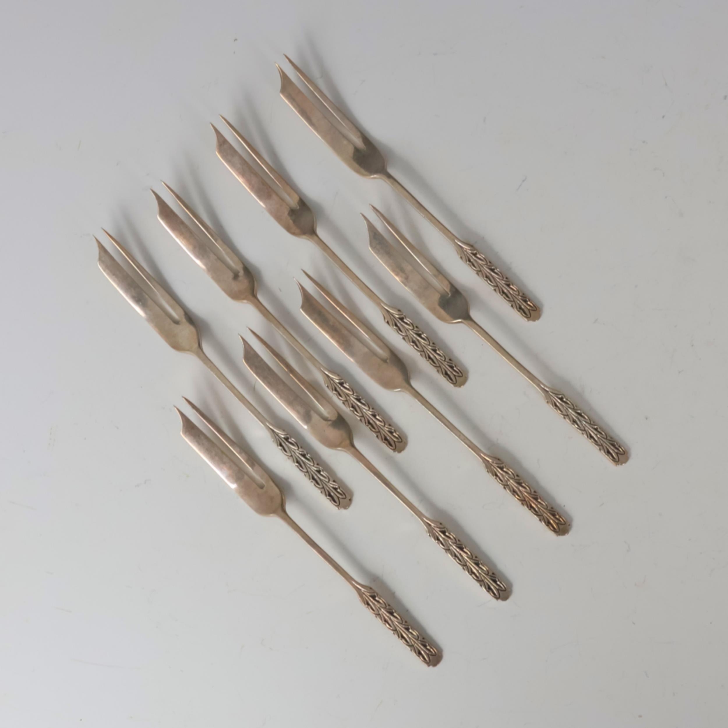 A near set of eight Liberty and Co silver cake/pastry forks, Birmingham 1927/28, the terminals of cast leafy Arts and Crafts style, 13cm long, gross weight 3ozt (8)