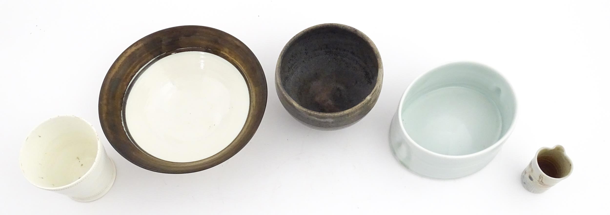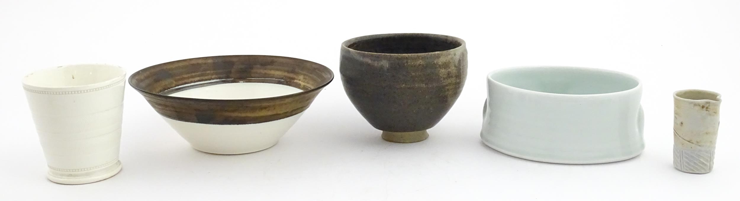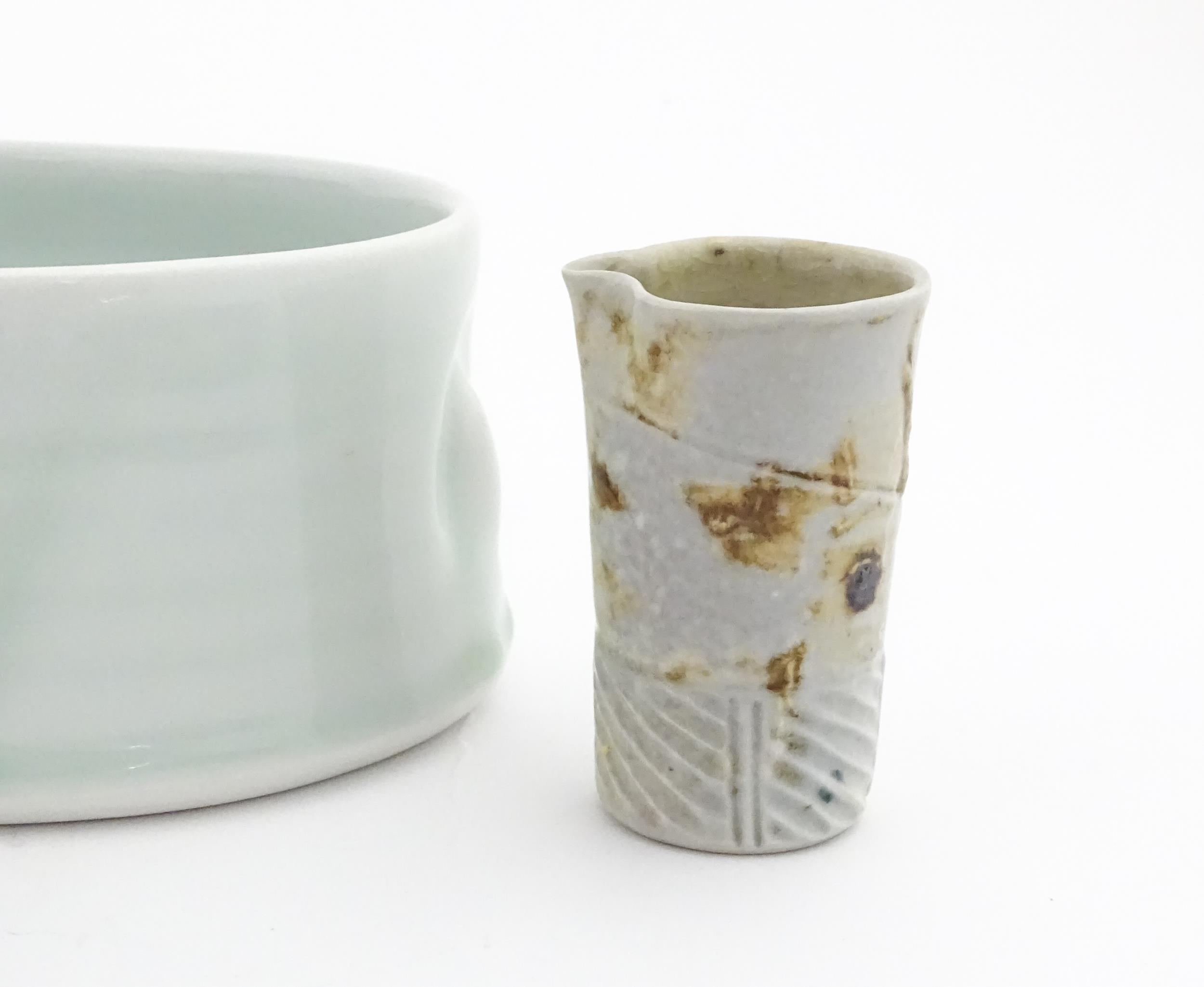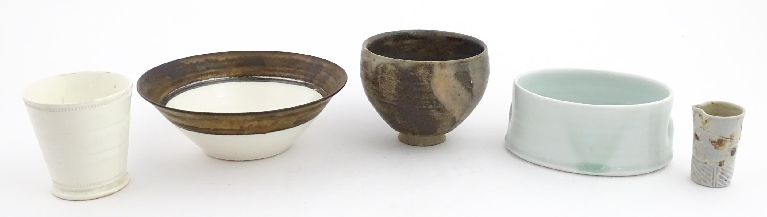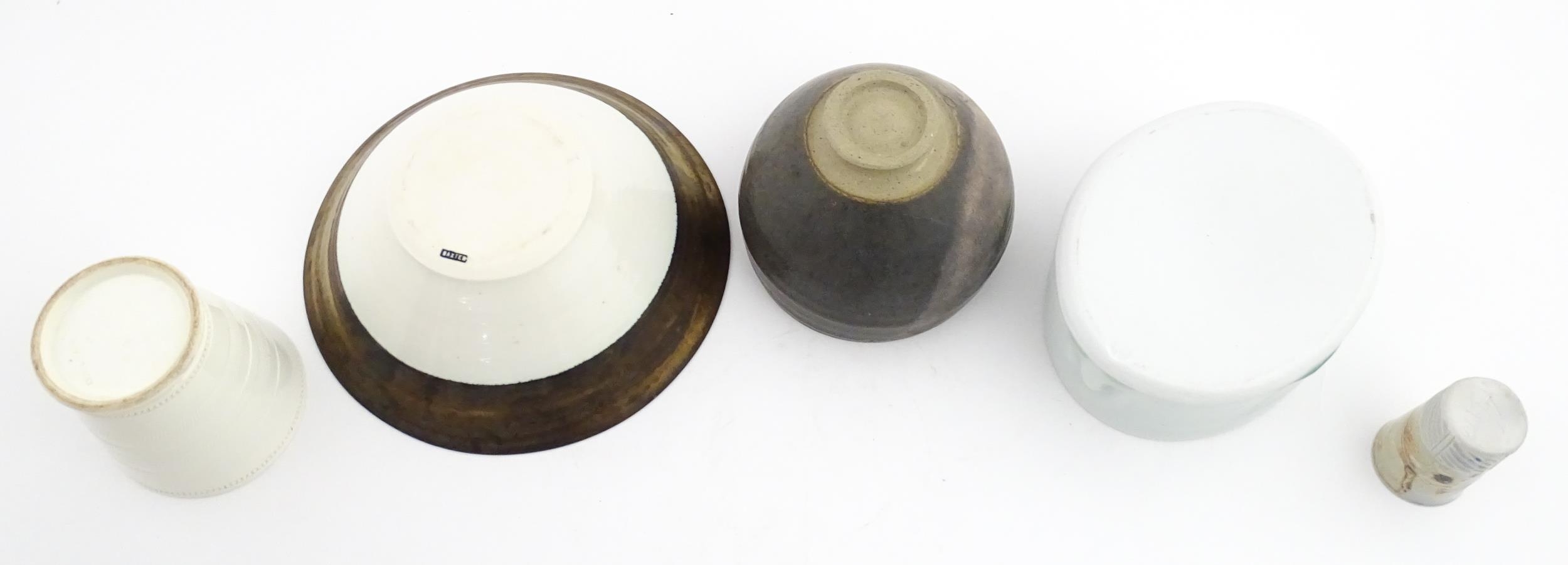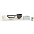 Four studio pottery items to include an oval bowl by Antje Ernestus, a bowl by Richard Baxter, a small jug with incised detail indistinctly signed under, and a small footed bowl. Together with a Wedgwood pot of tapering form with banded detail, marked under and indistinctly signed Ruth Lorve 24/3/45. Baxter bowl approx. 9" wide (5)