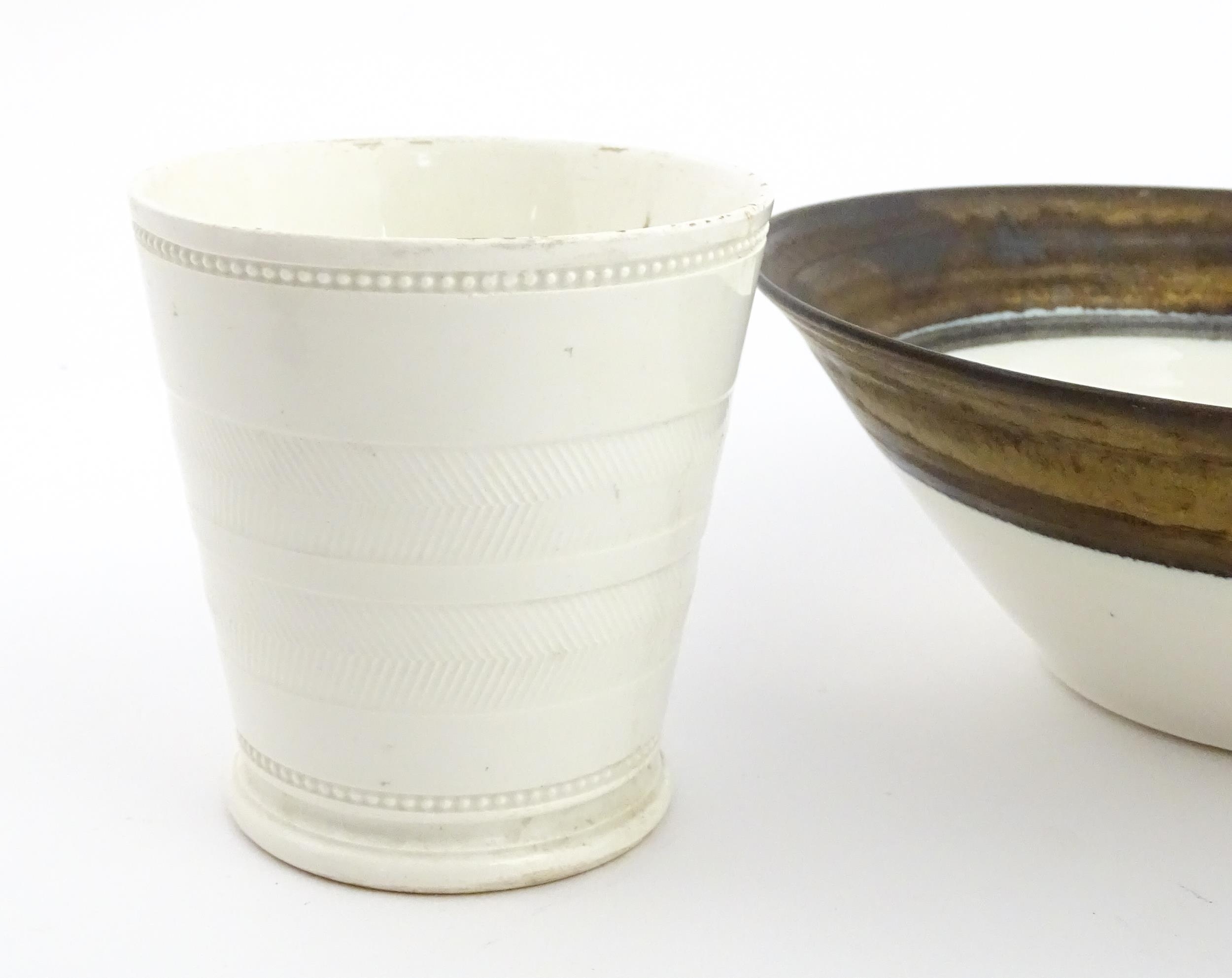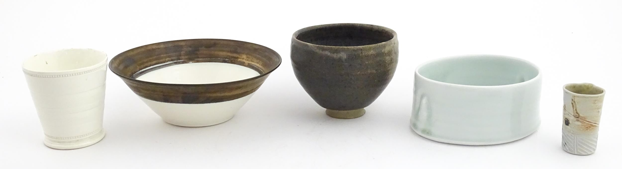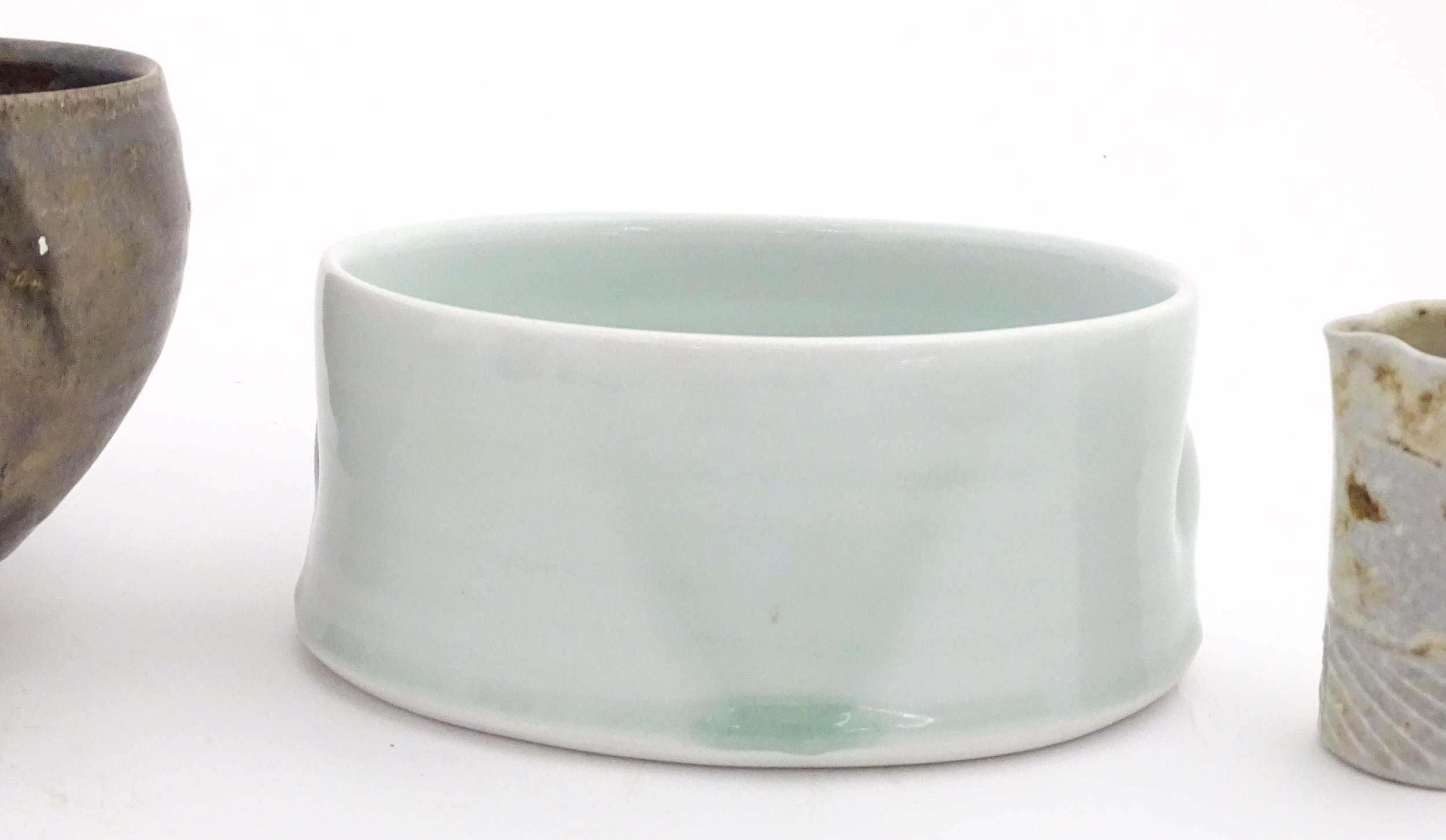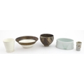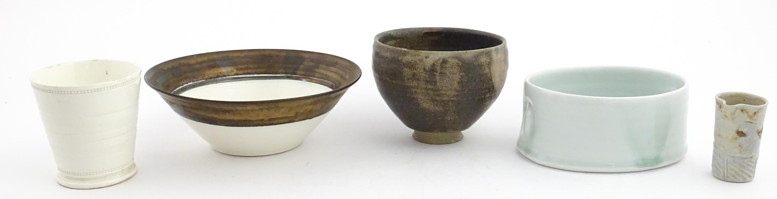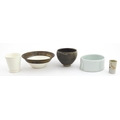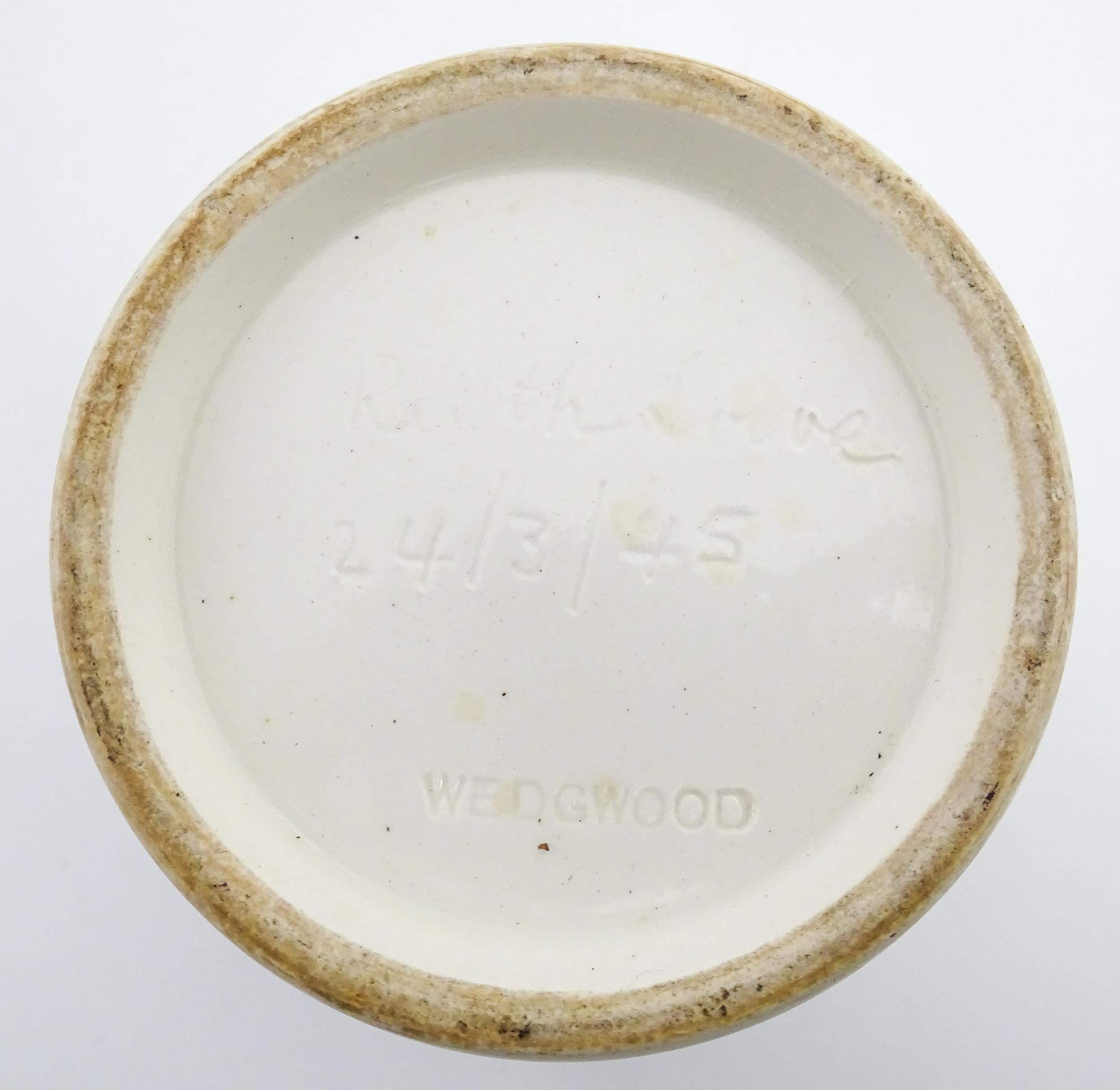 Four studio pottery items to include an oval bowl by Antje Ernestus, a bowl by Richard Baxter, a small jug with incised detail indistinctly signed under, and a small footed bowl. Together with a Wedgwood pot of tapering form with banded detail, marked under and indistinctly signed Ruth Lorve 24/3/45. Baxter bowl approx. 9" wide (5)