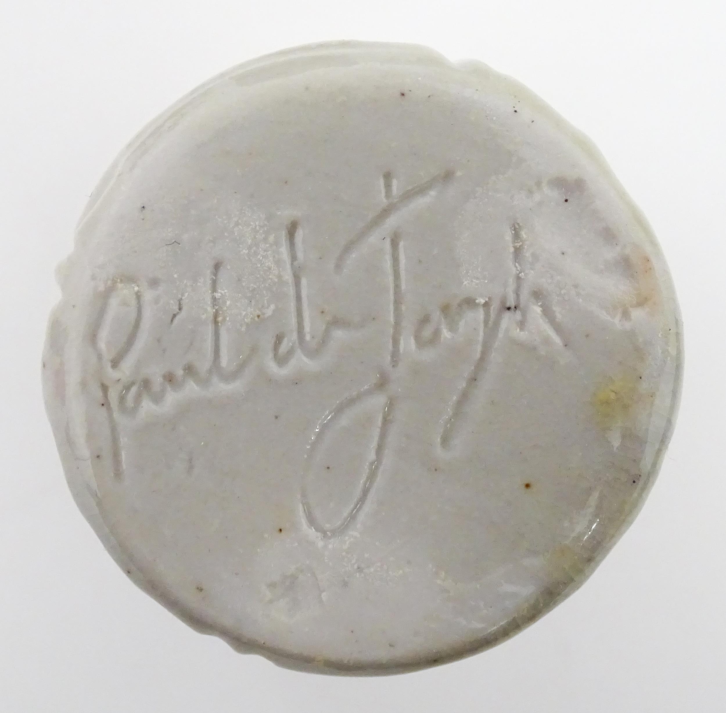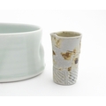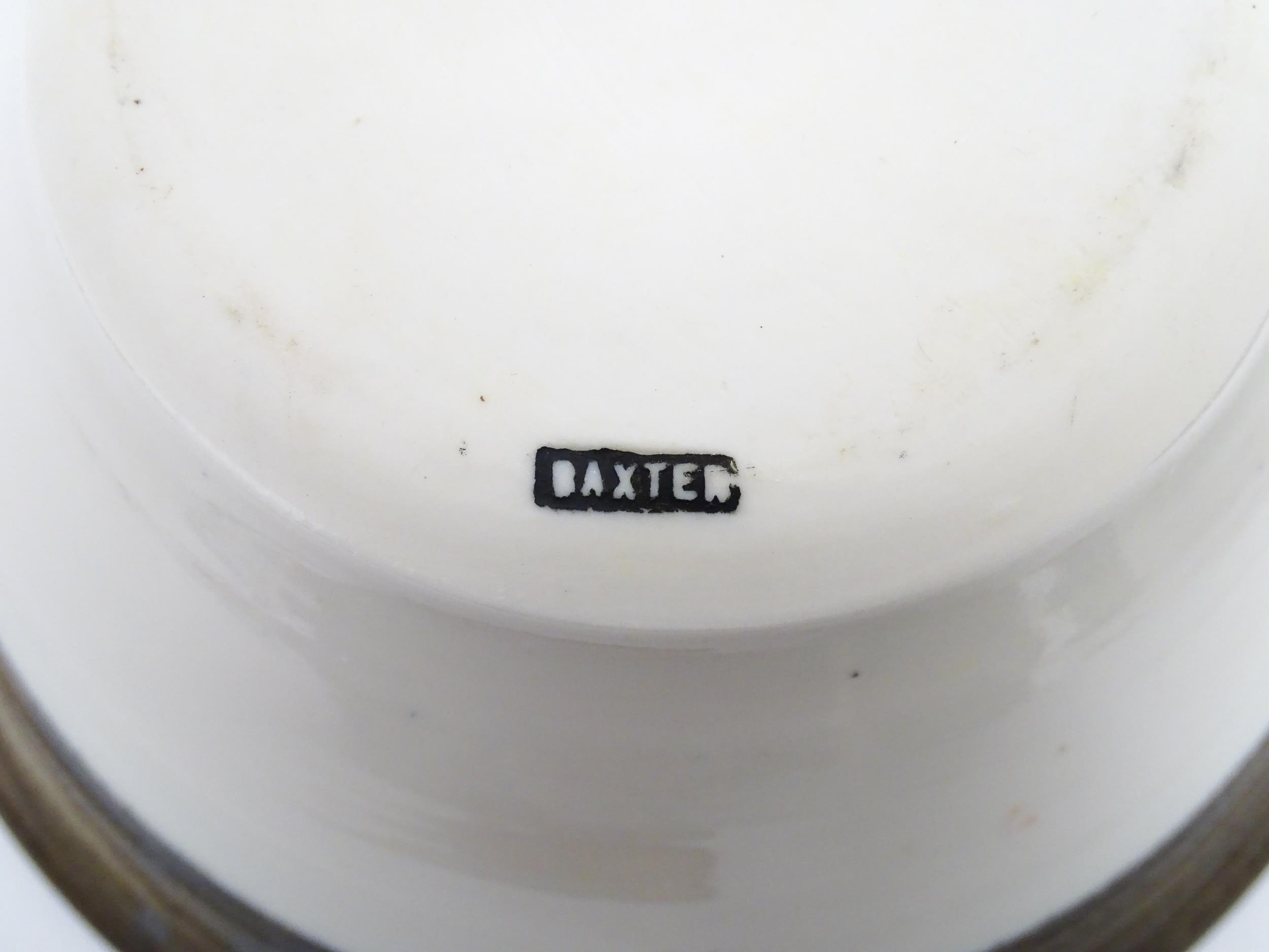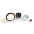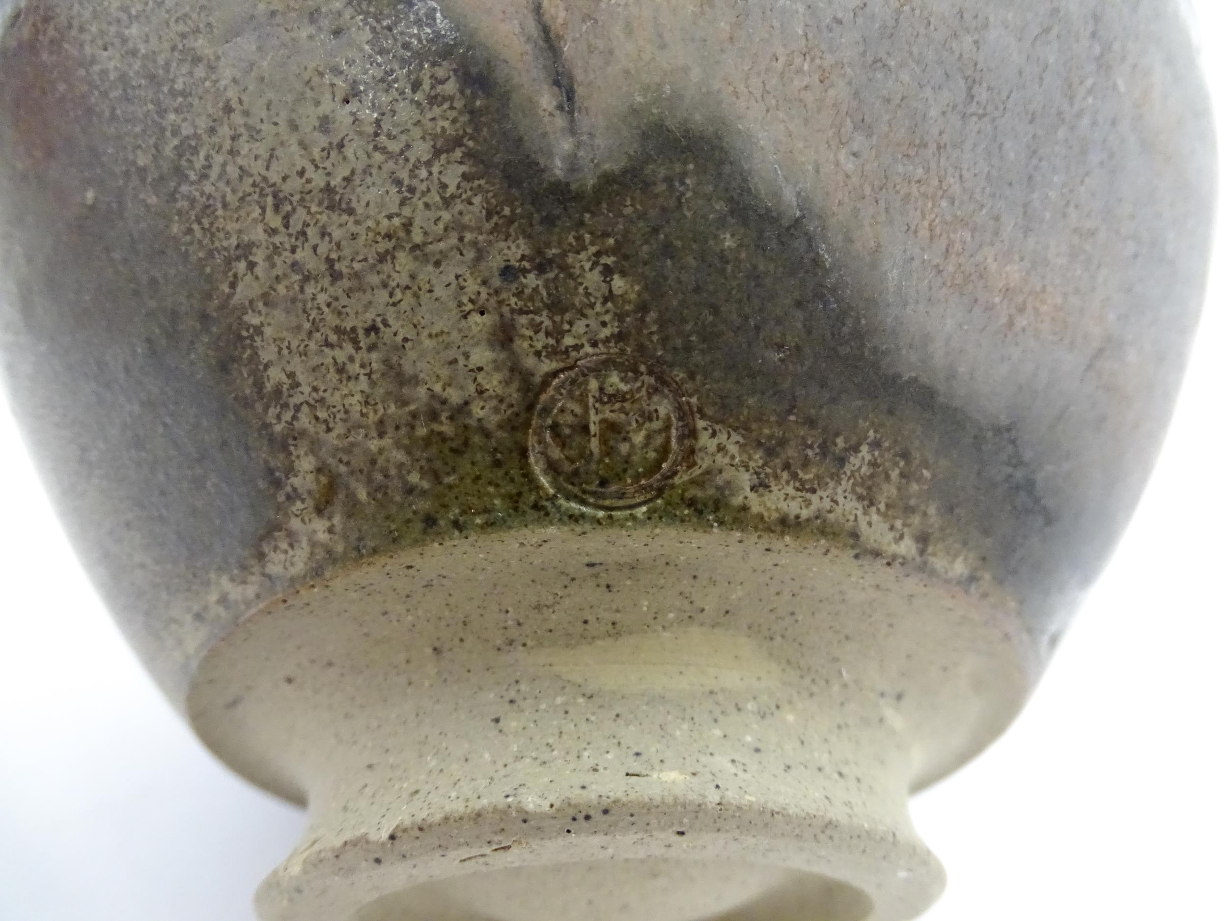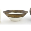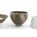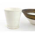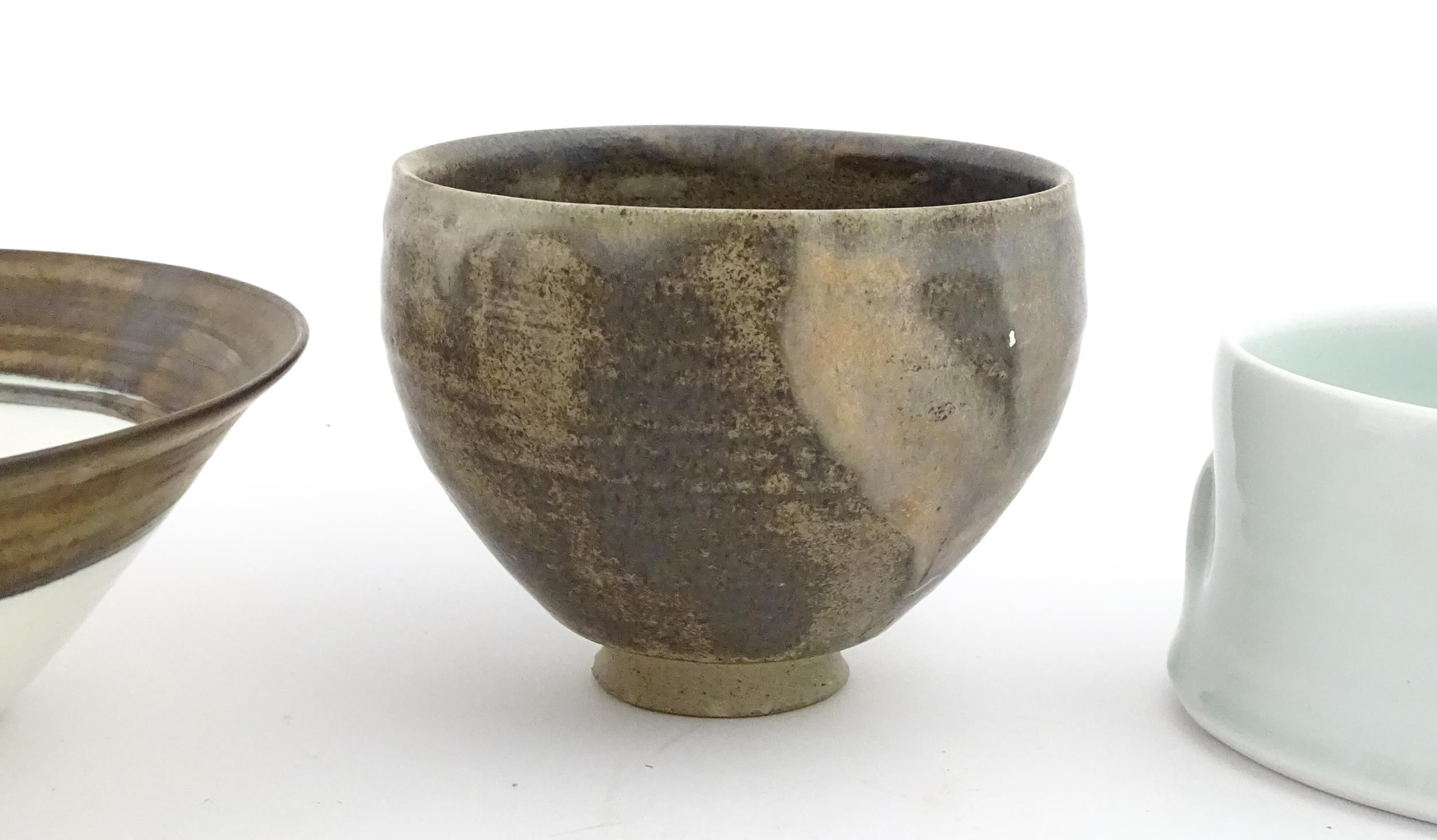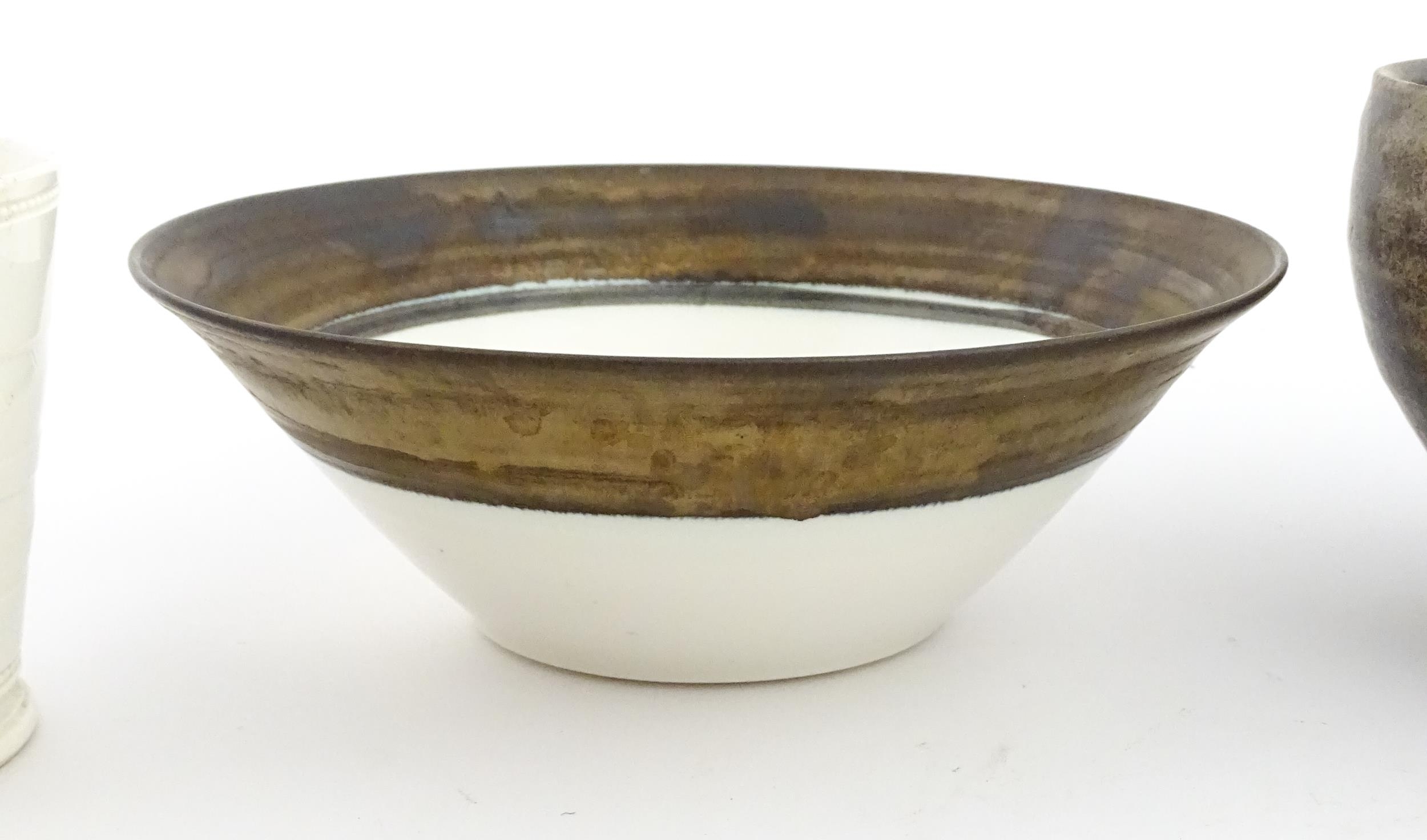 Four studio pottery items to include an oval bowl by Antje Ernestus, a bowl by Richard Baxter, a small jug with incised detail indistinctly signed under, and a small footed bowl. Together with a Wedgwood pot of tapering form with banded detail, marked under and indistinctly signed Ruth Lorve 24/3/45. Baxter bowl approx. 9" wide (5)