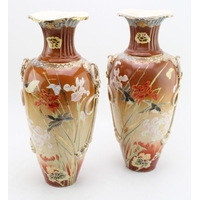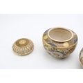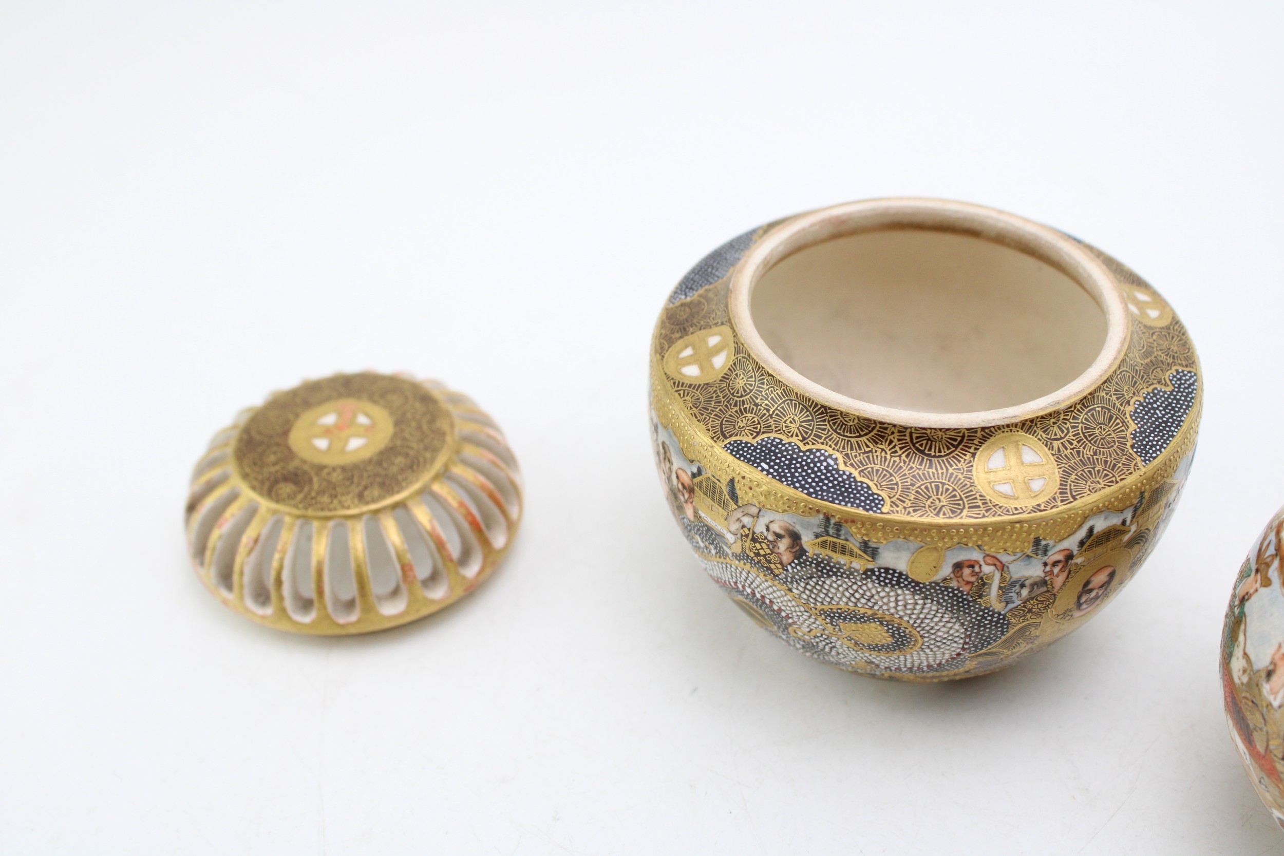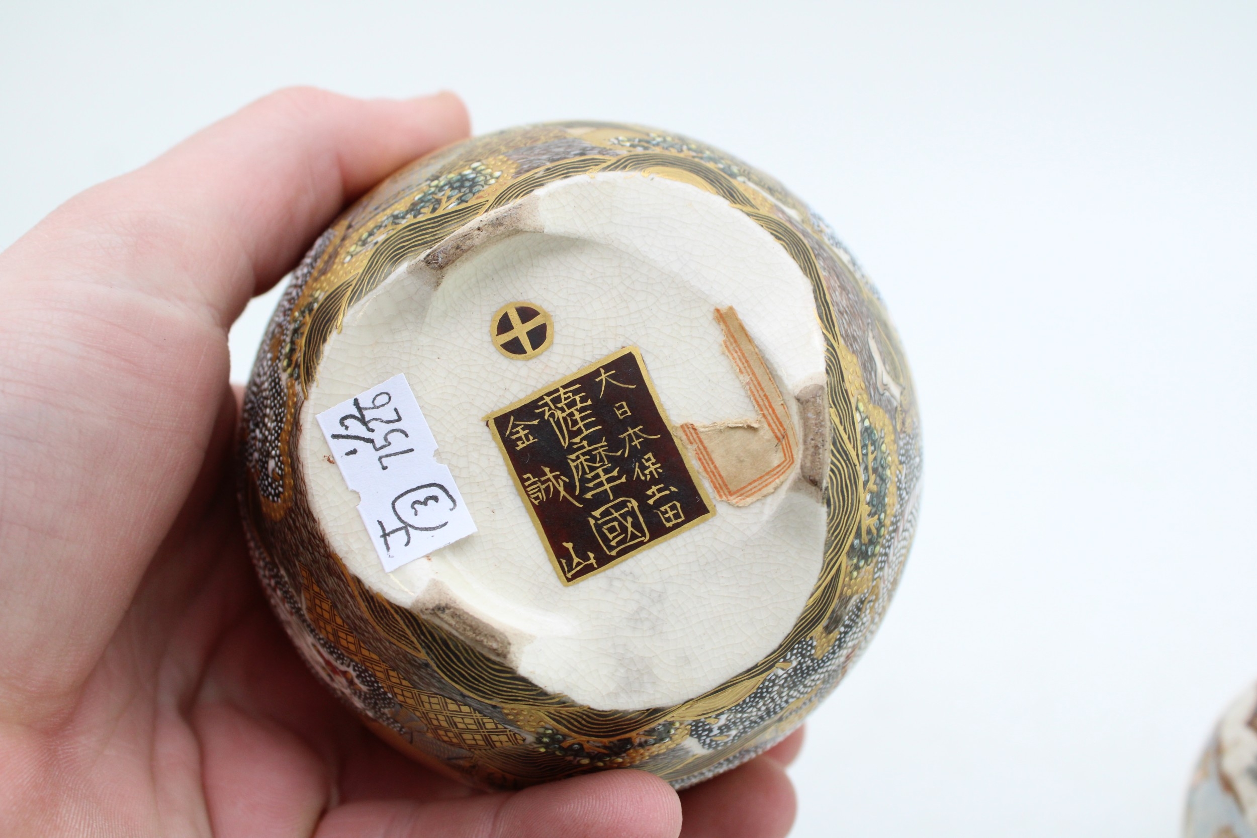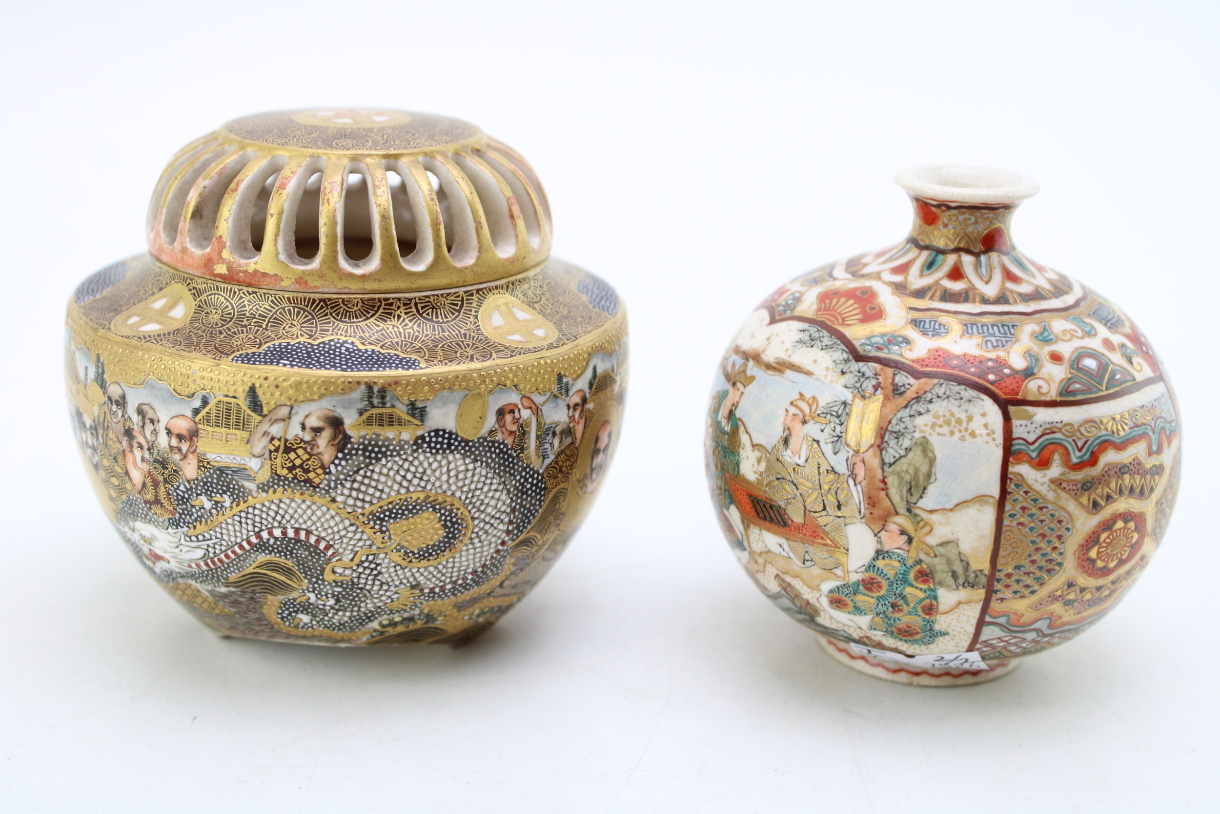 Two Japanese Satsuma vases, one with lid and markings to base, 9cm tall.