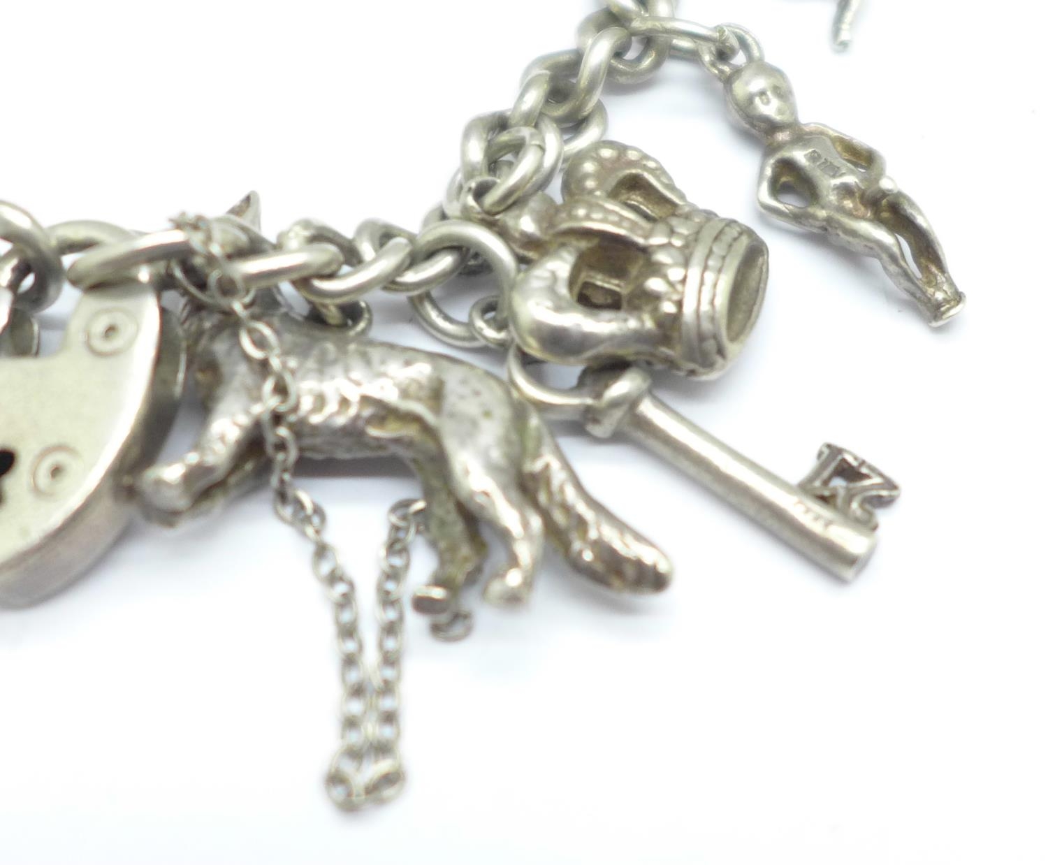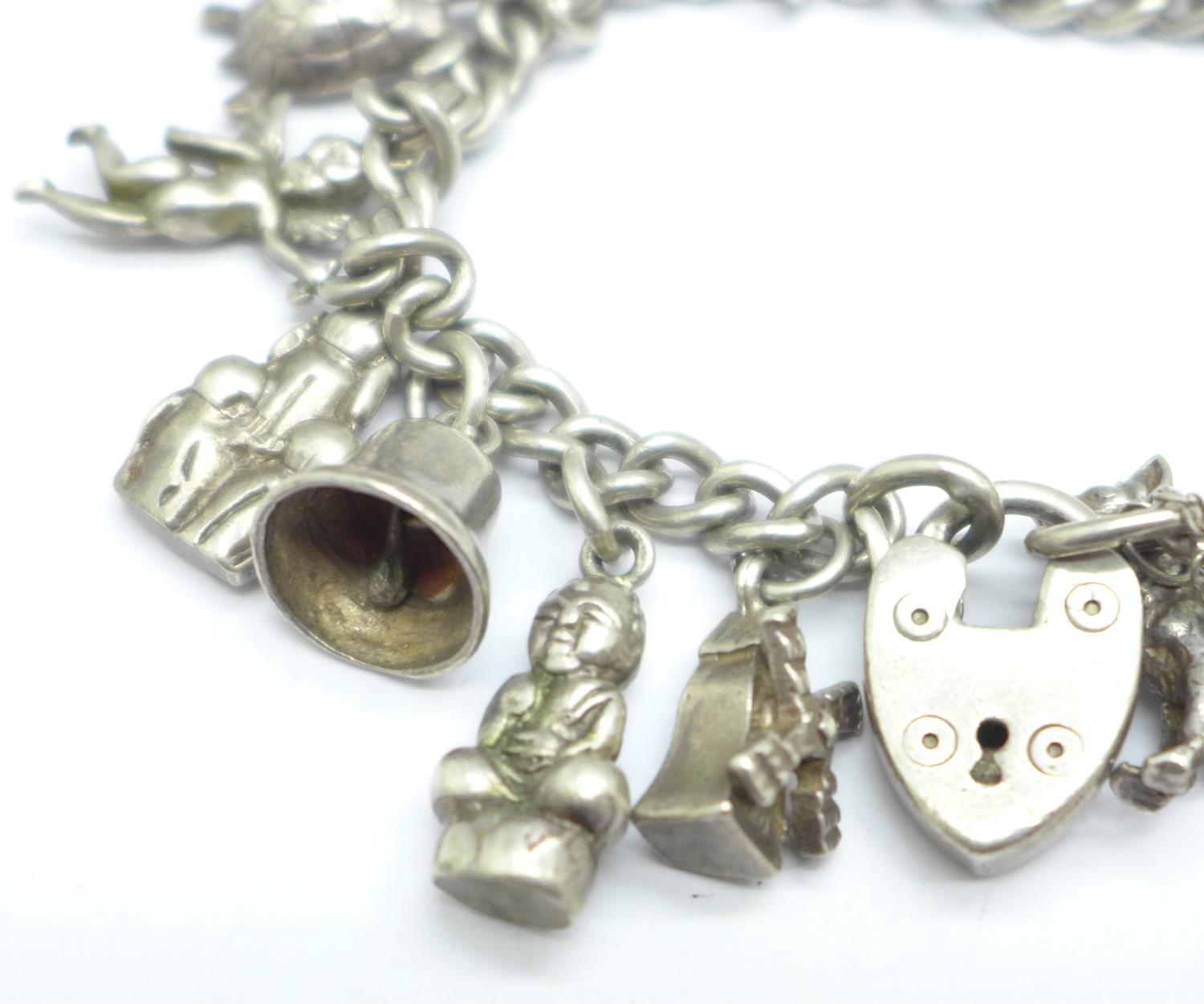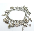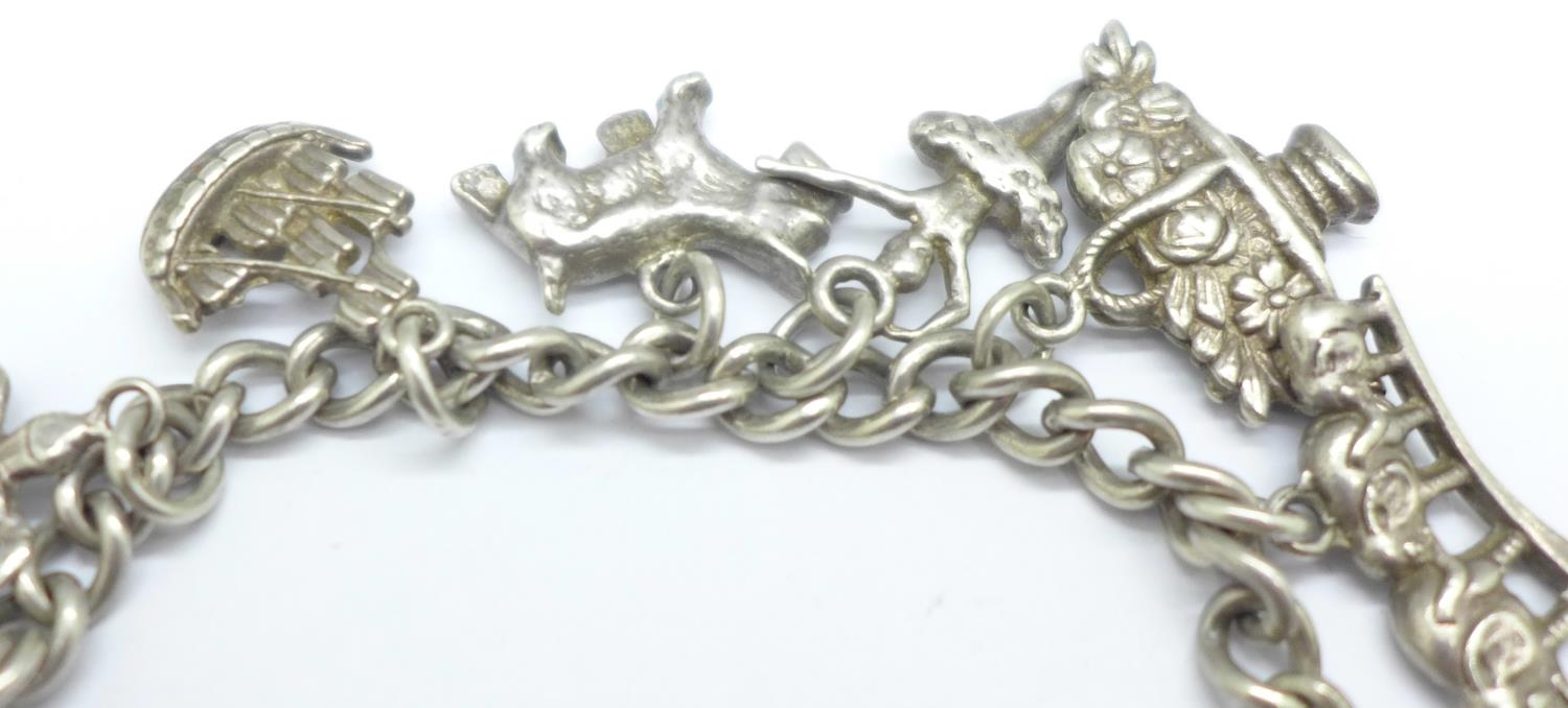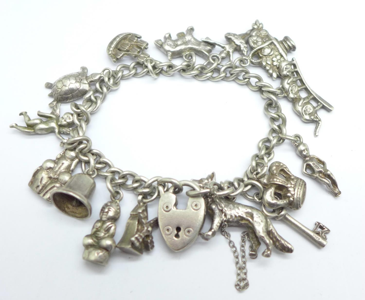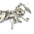 A silver charm bracelet, clasp and bracelet stamped silver, all charms test as silver, 76.2g