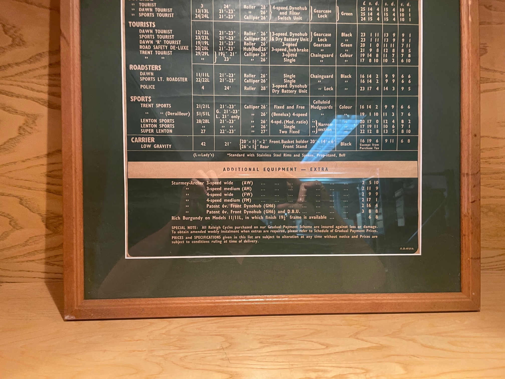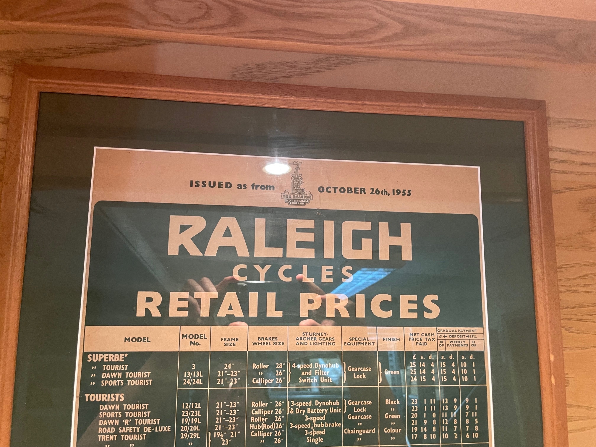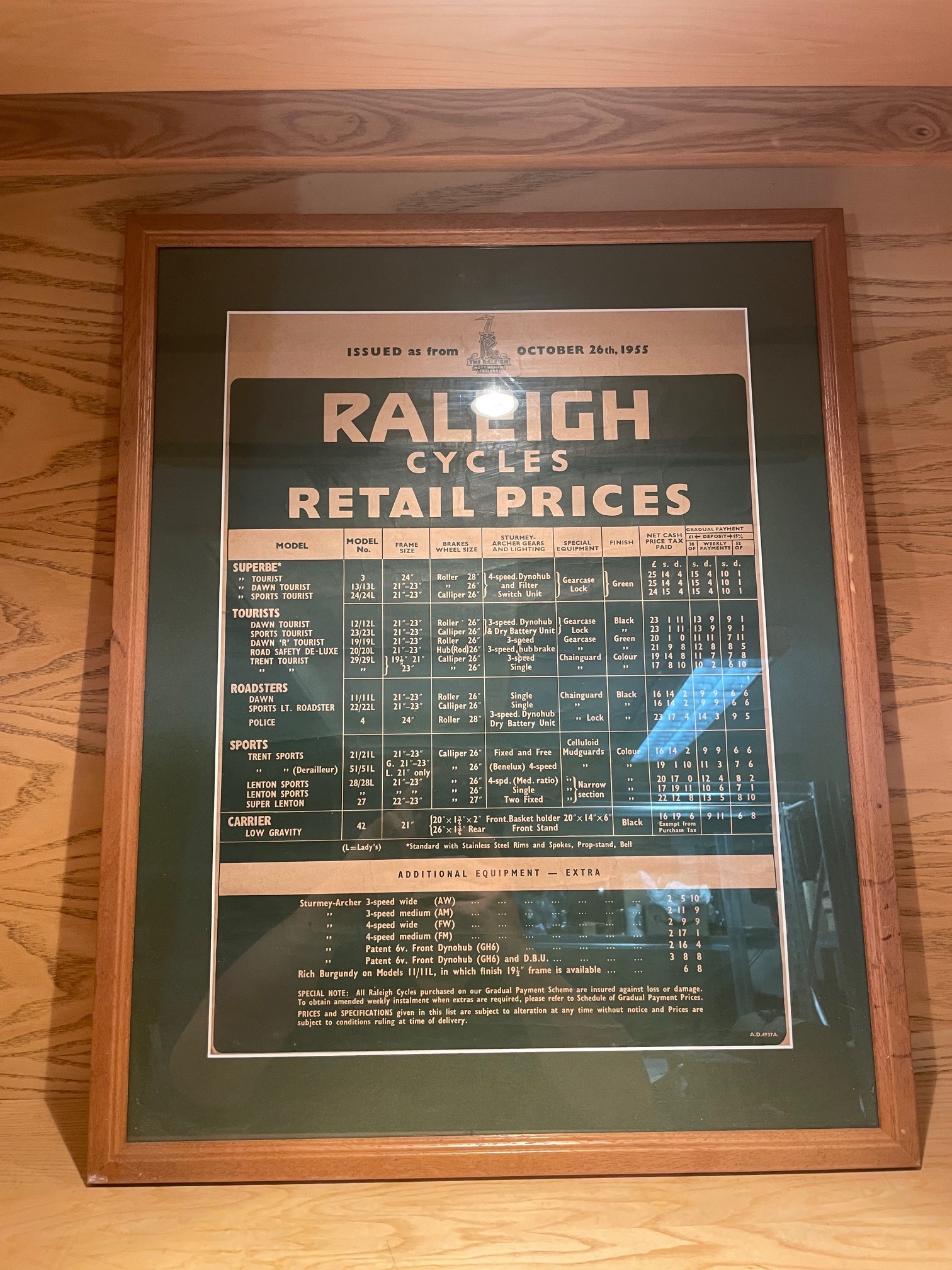 Framed & Glazed Raleigh Cycles Pricelist For 1955In House Shipping Unavailable