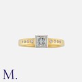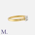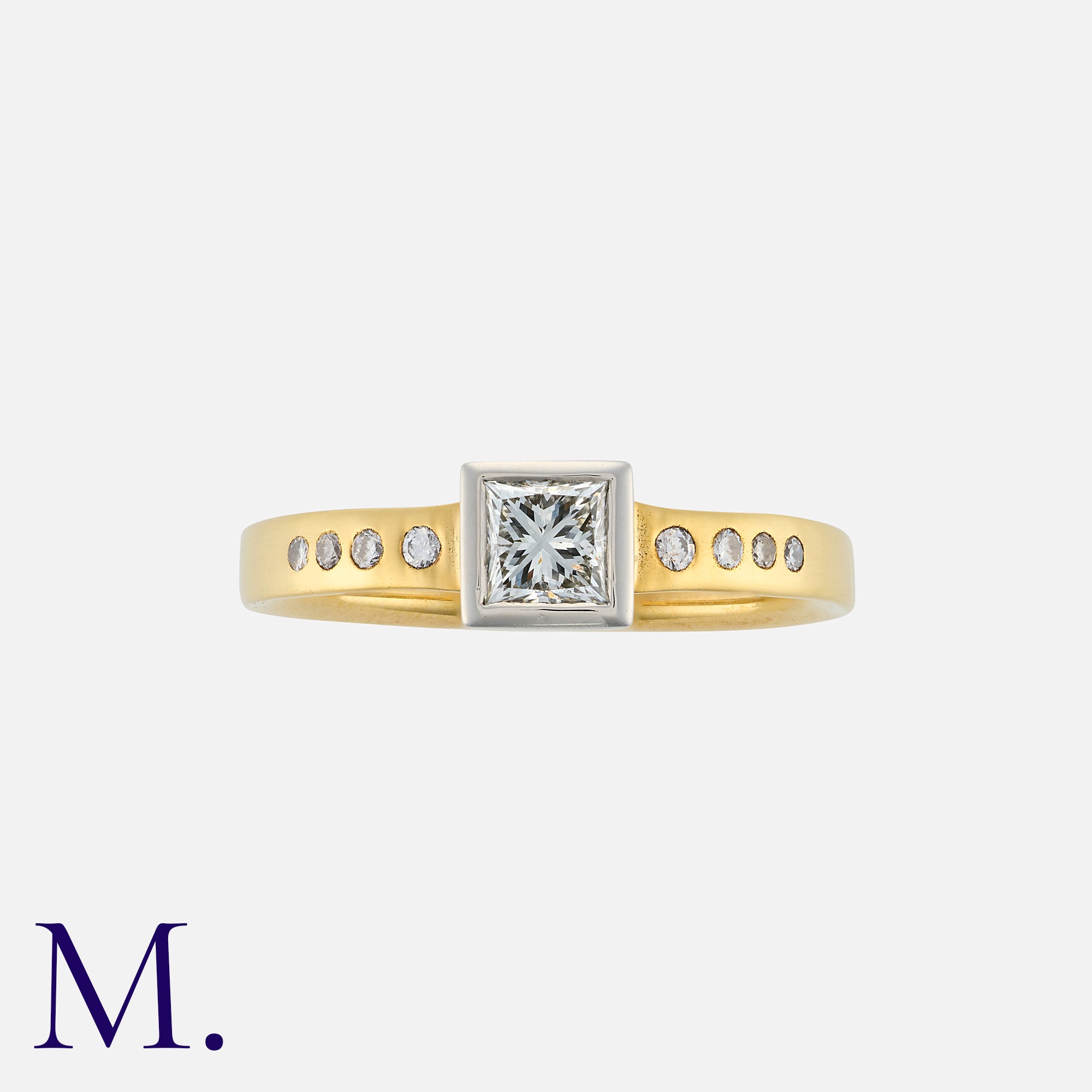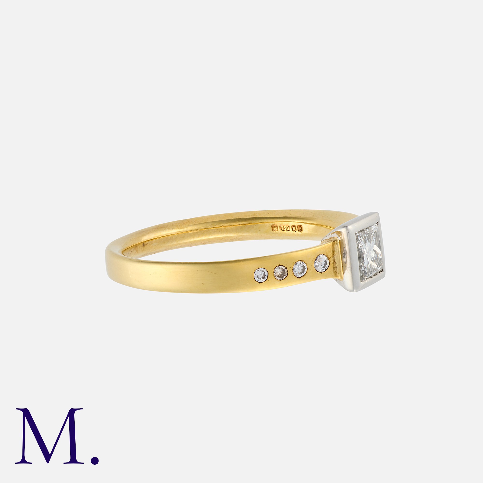 A Diamond Solitaire Ring in 18K yellow and white gold, set with a princess cut diamond weighing 0.41ct, together with diamond-set shoulders (weighing approx. 0.30ct in total). Hallmarked for 18ct gold.