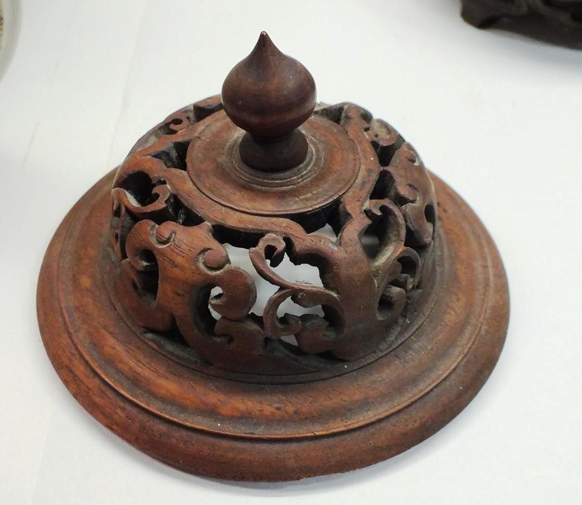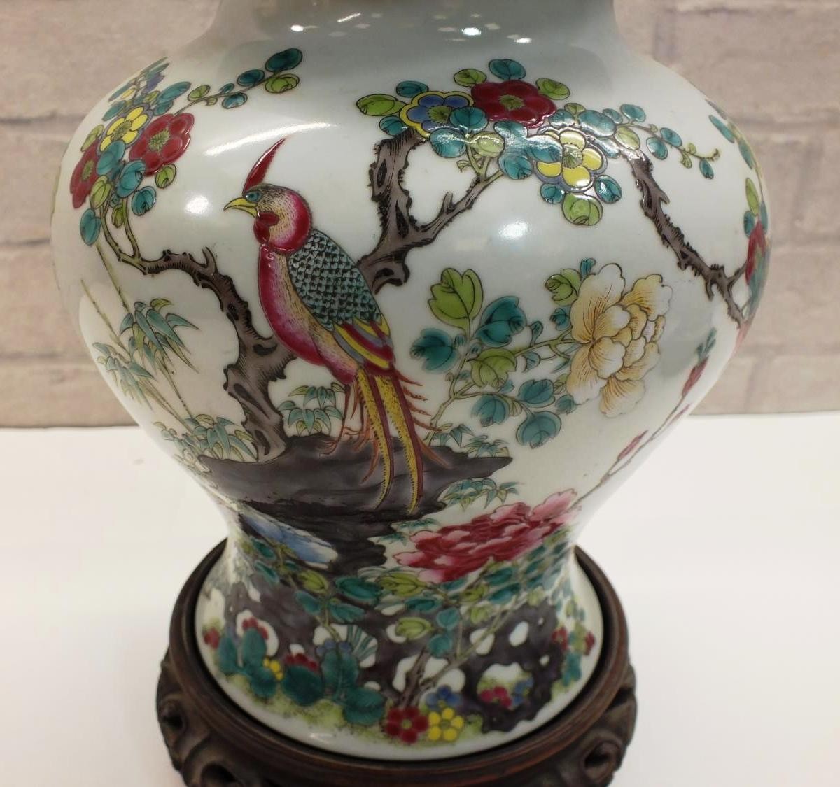 PAIR OF CHINESE HAND PAINTED VASES ON CARVED WOOD BASES WITH CARVED WOOD LIDS