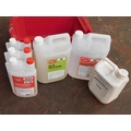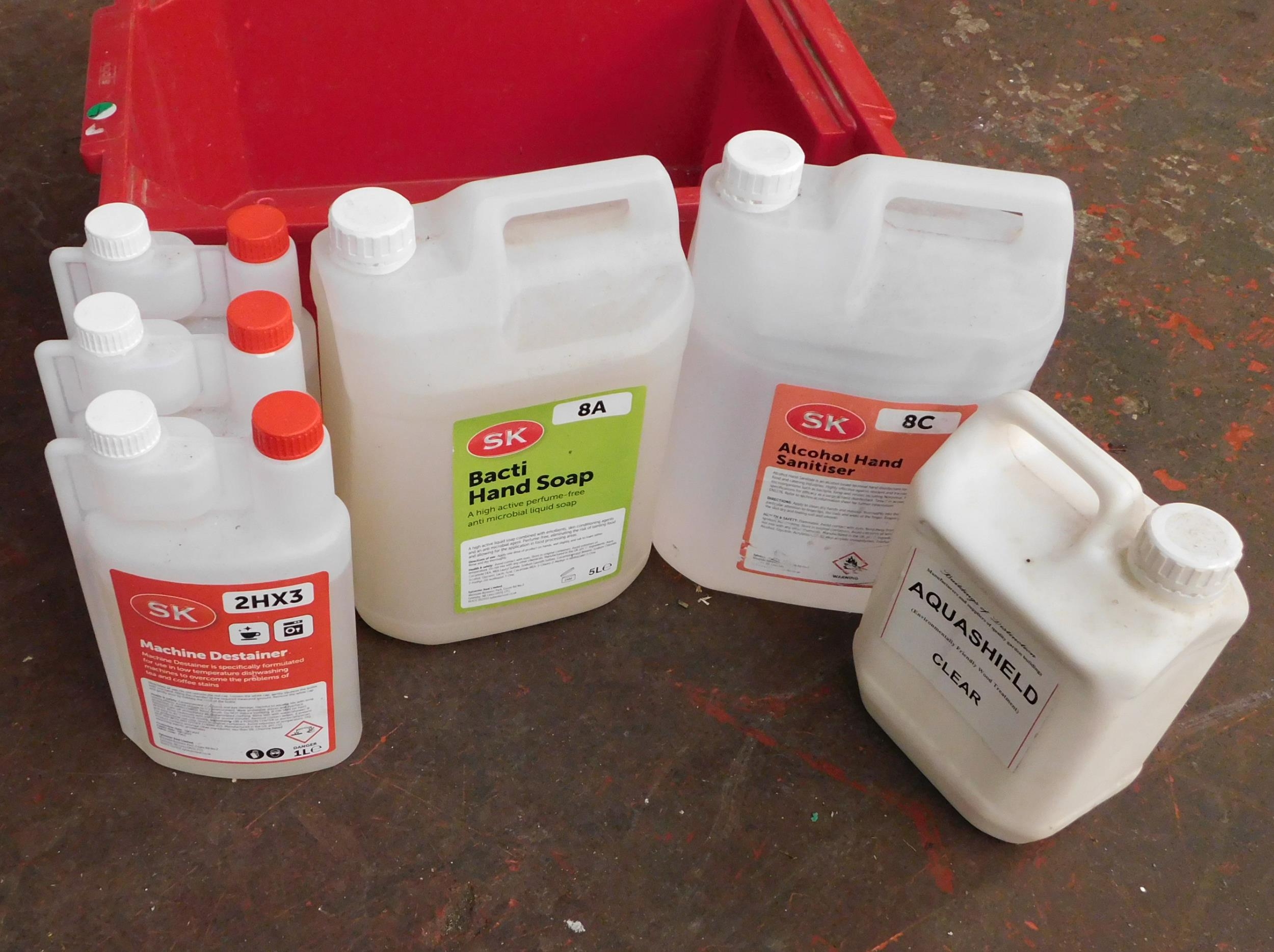 Six containers of cleaning products - incl. alcohol hand sanitiser and machine de-stainer