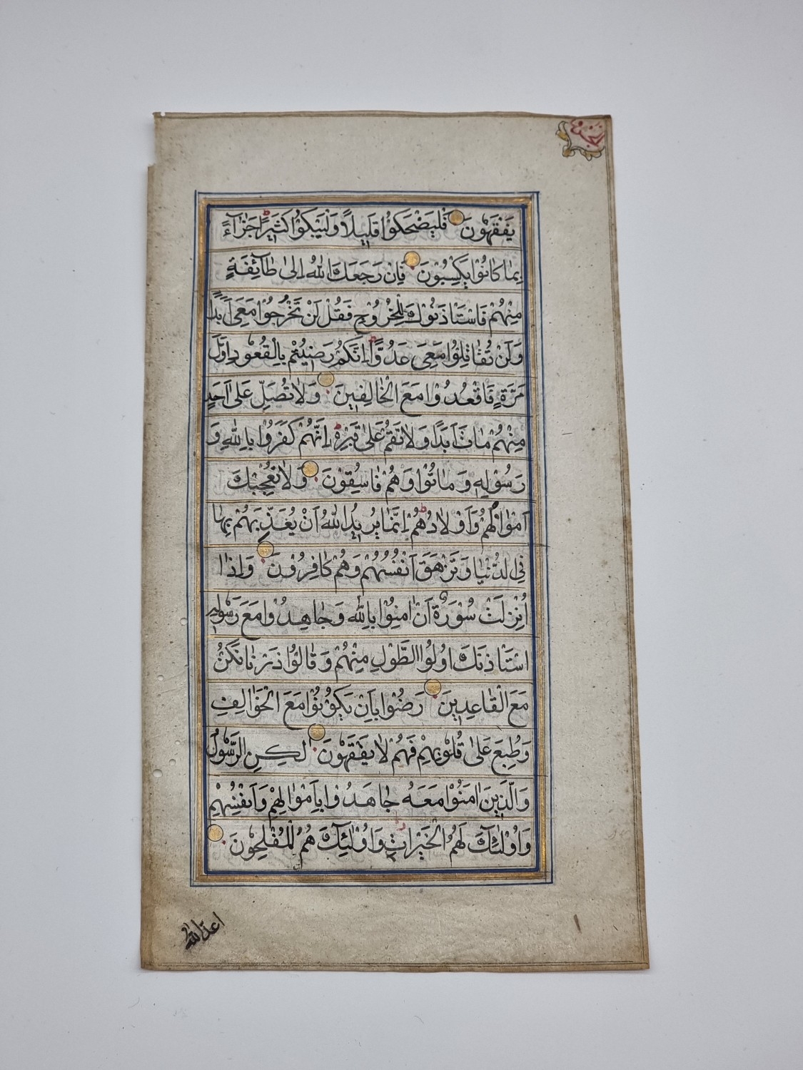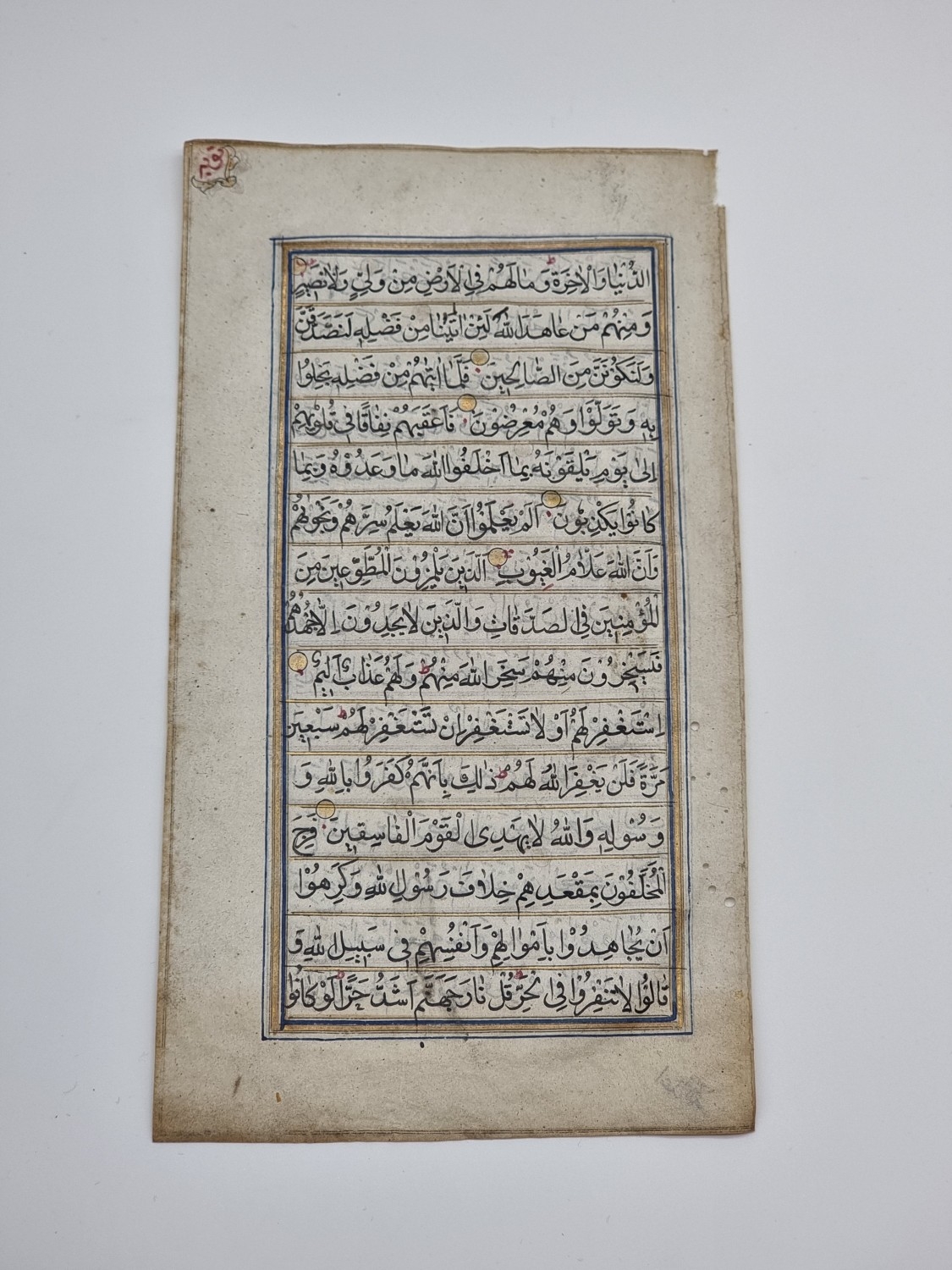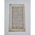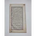 KORAN LEAF: single leaf from a 17thc Koran, in black ink heightened in gilt, rubricated in blue, leaf size approx 18 x 9.5cm, scattered wormholes to one edge, some light dust and marks. (1)