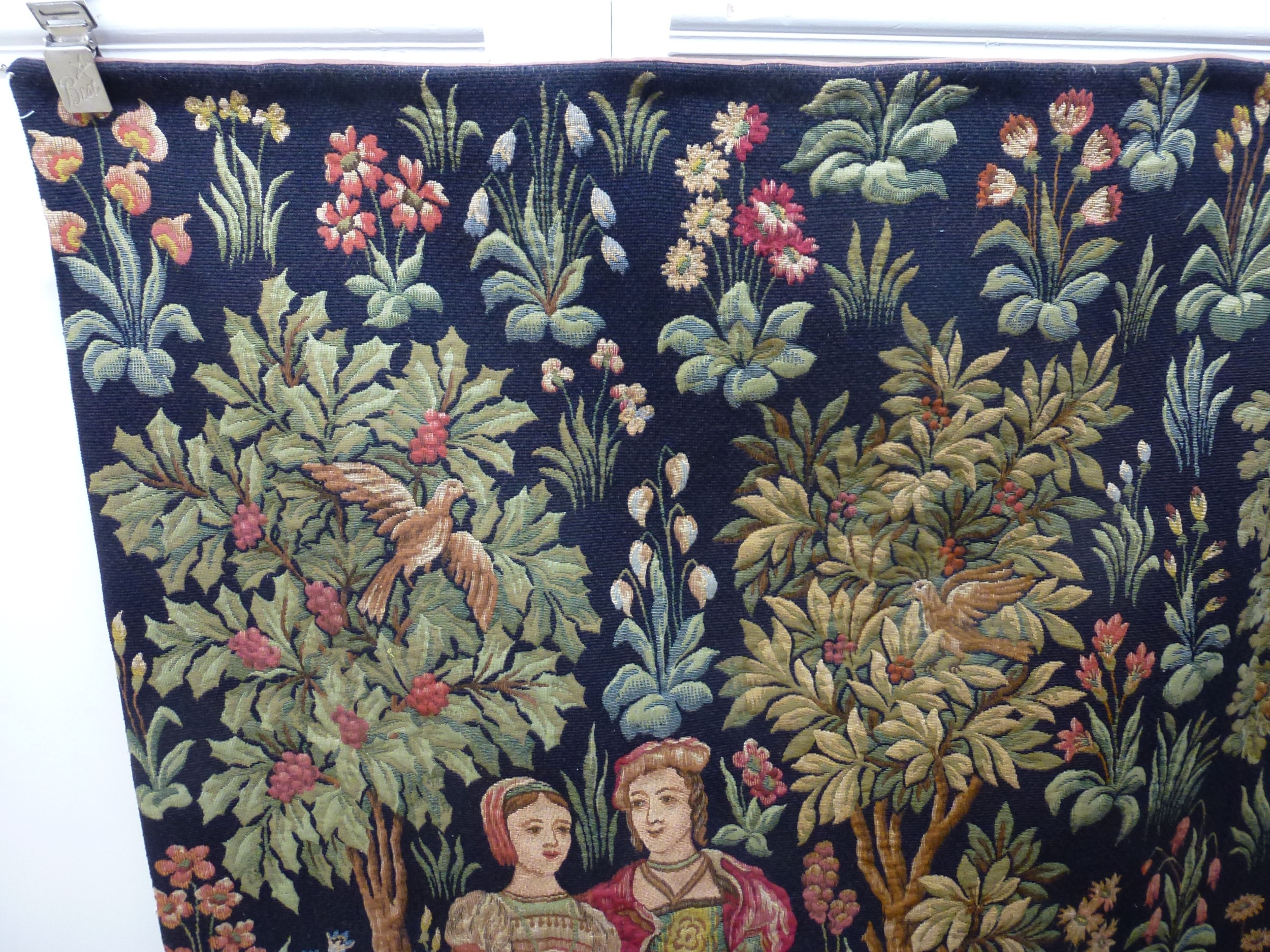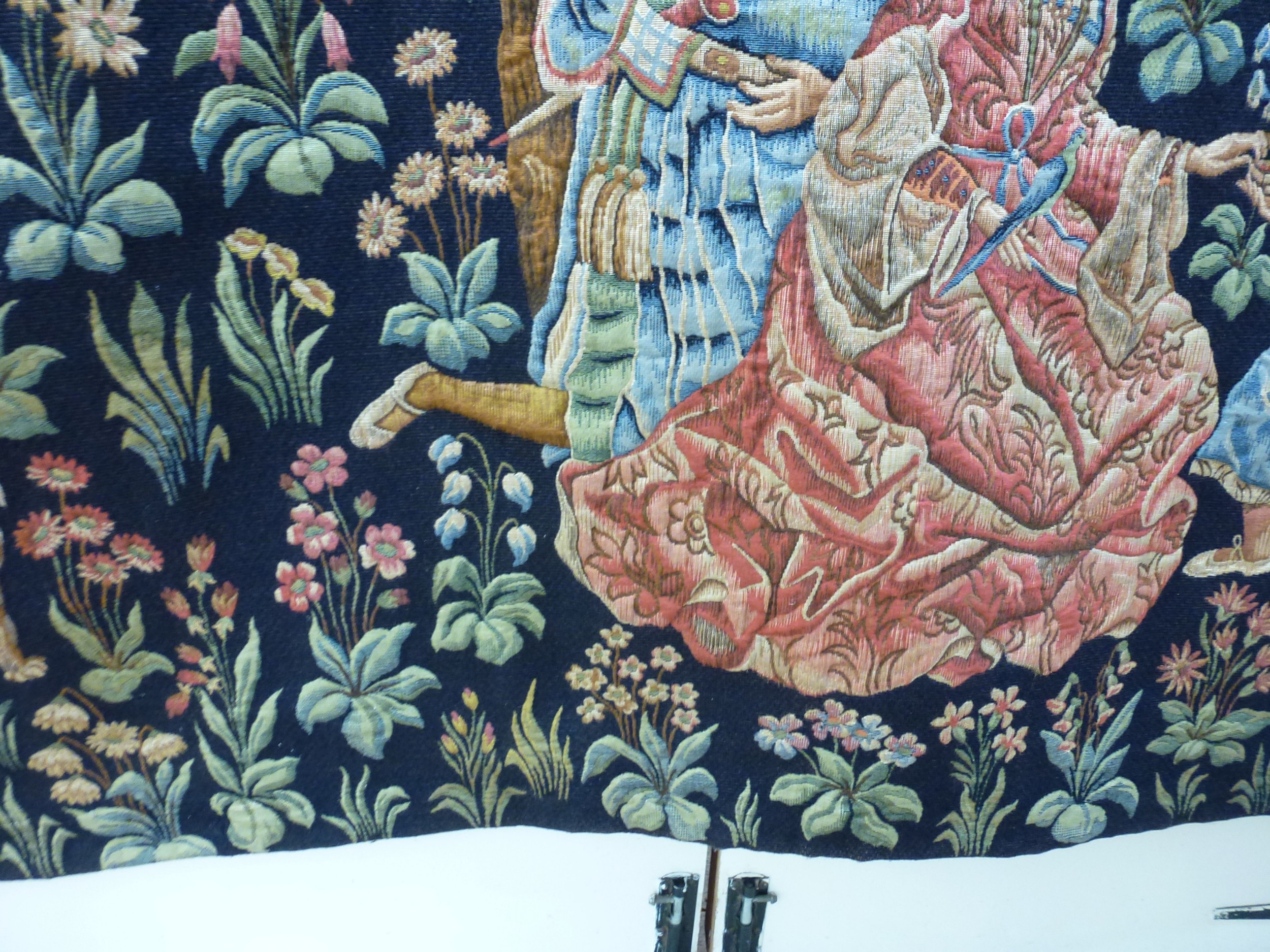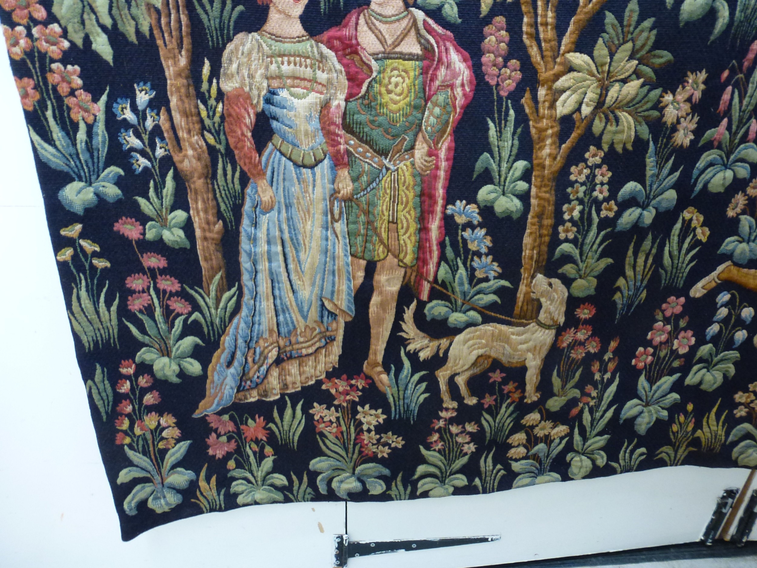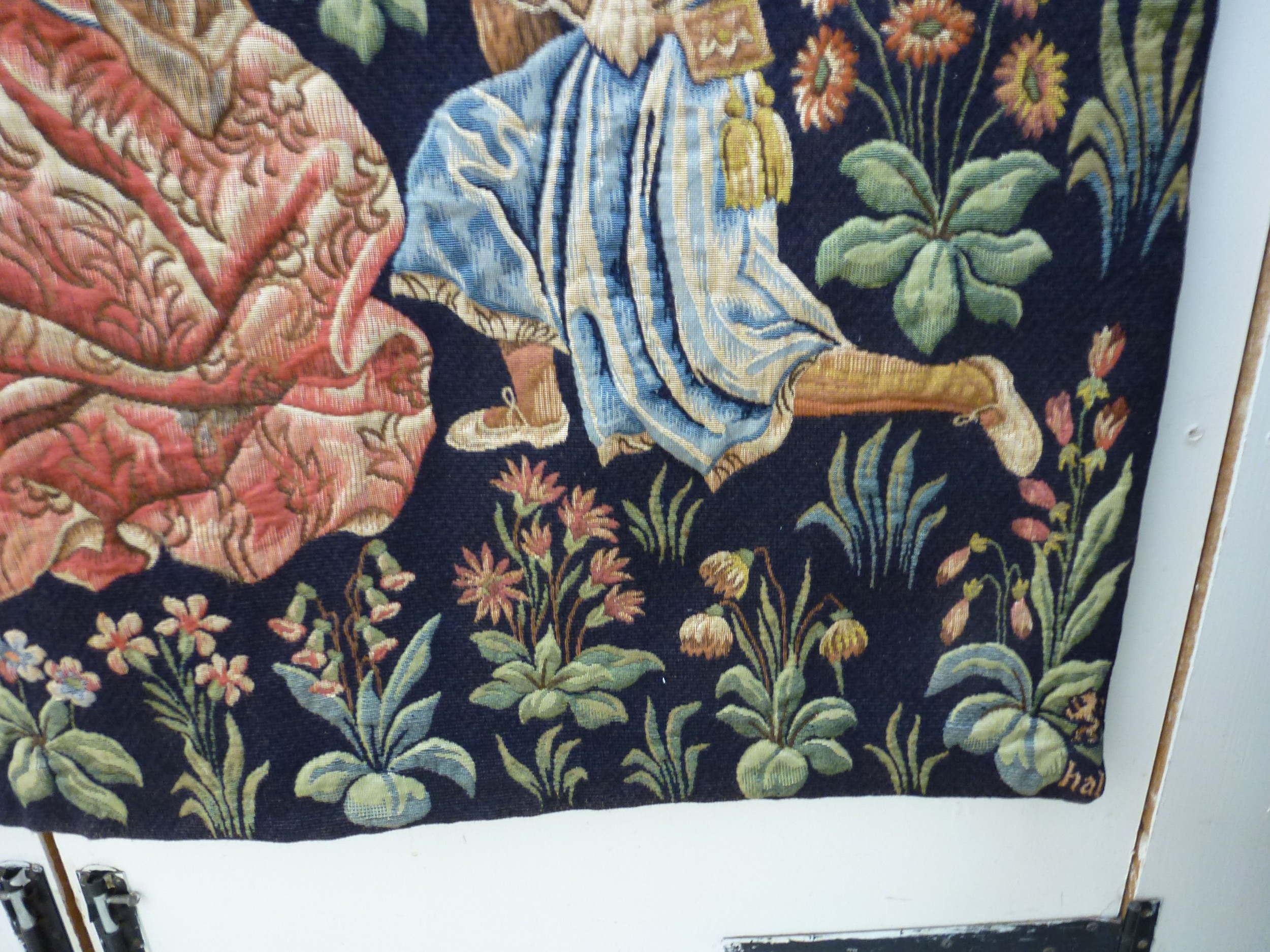 HAL - a 20thC Flemish inspired tapestry hanging, depicting figures in period costume, in a woodland setting signed bottom right hand corner 52" x 76"