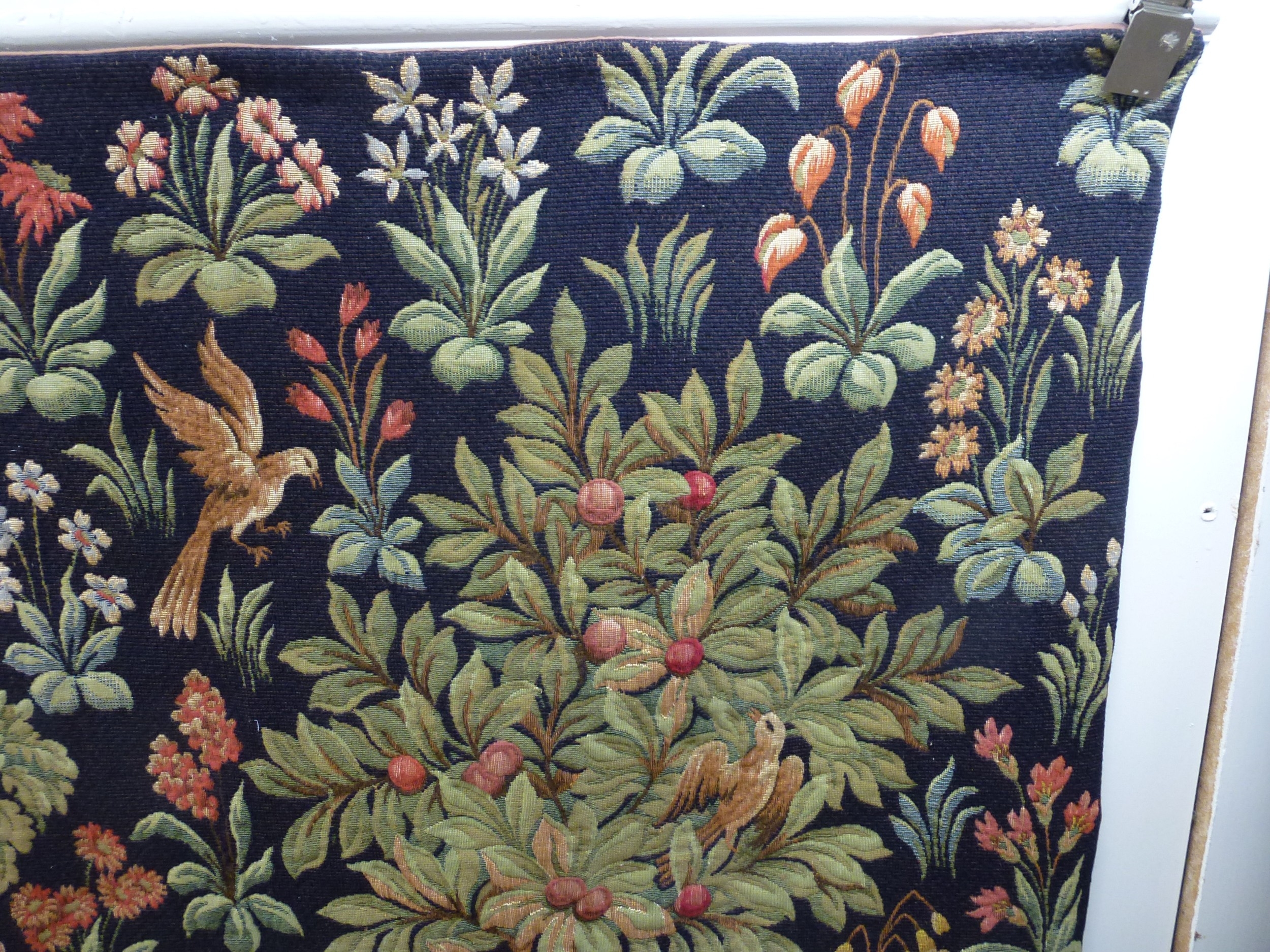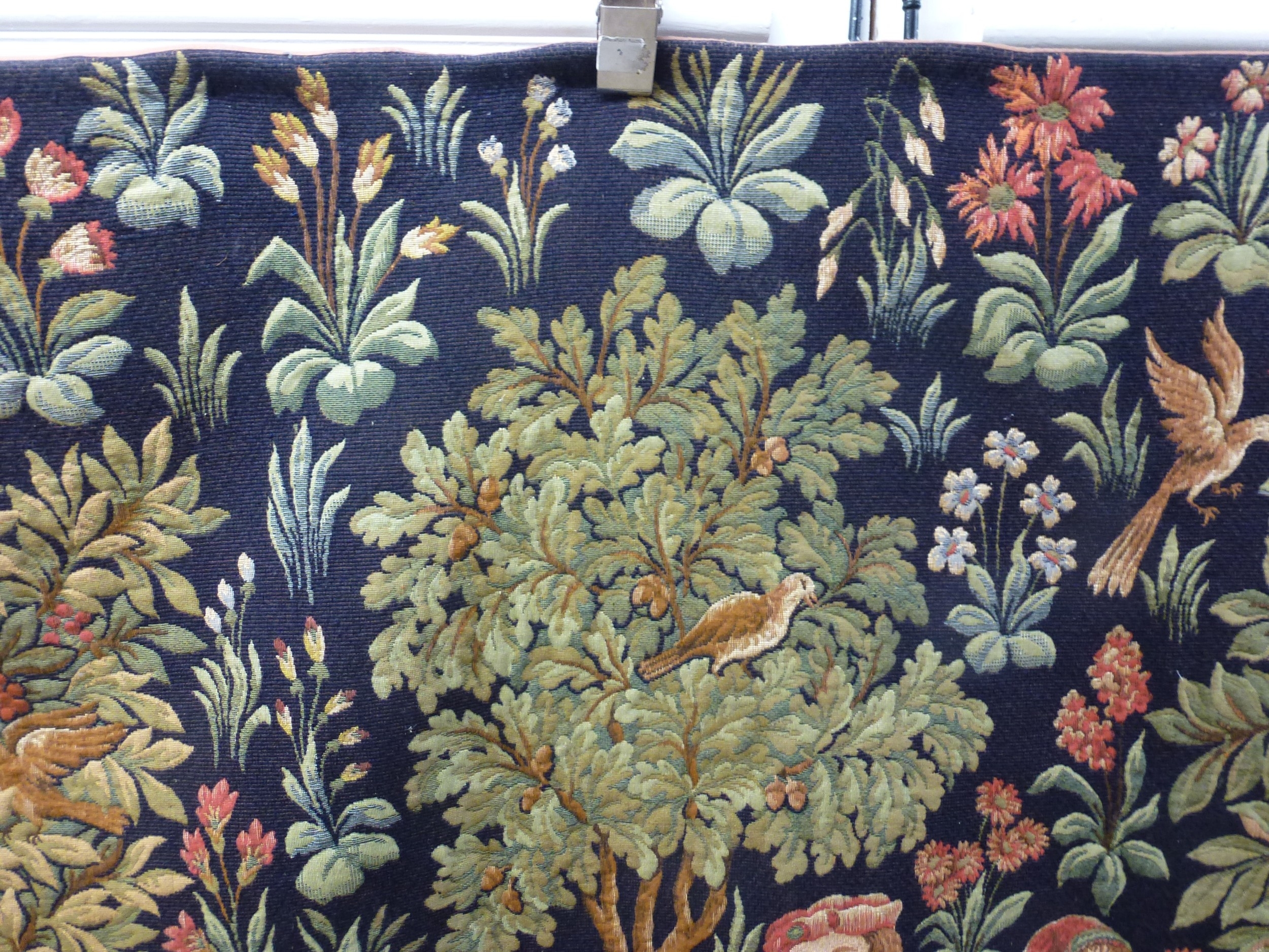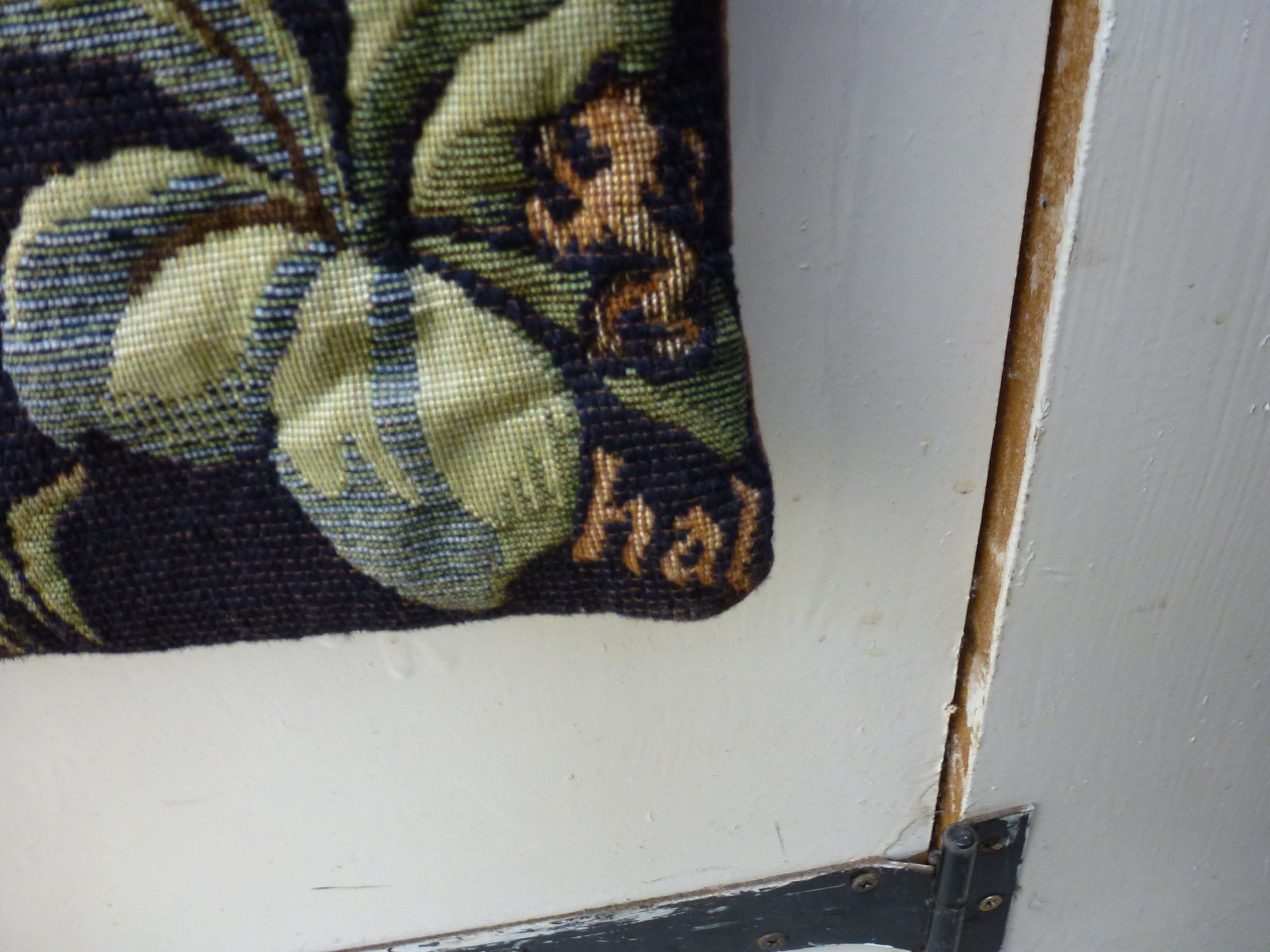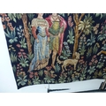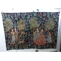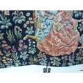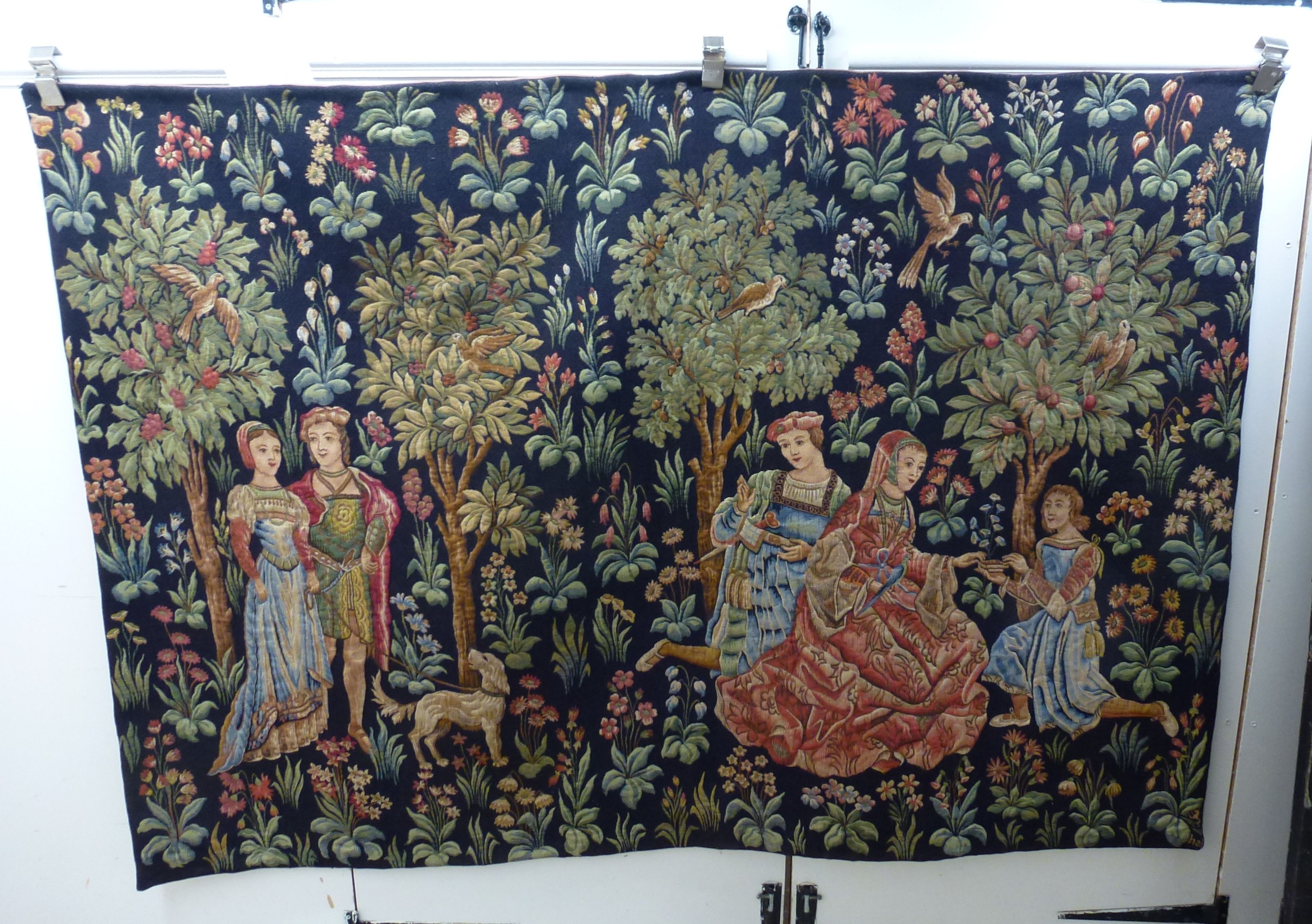 HAL - a 20thC Flemish inspired tapestry hanging, depicting figures in period costume, in a woodland setting signed bottom right hand corner 52" x 76"