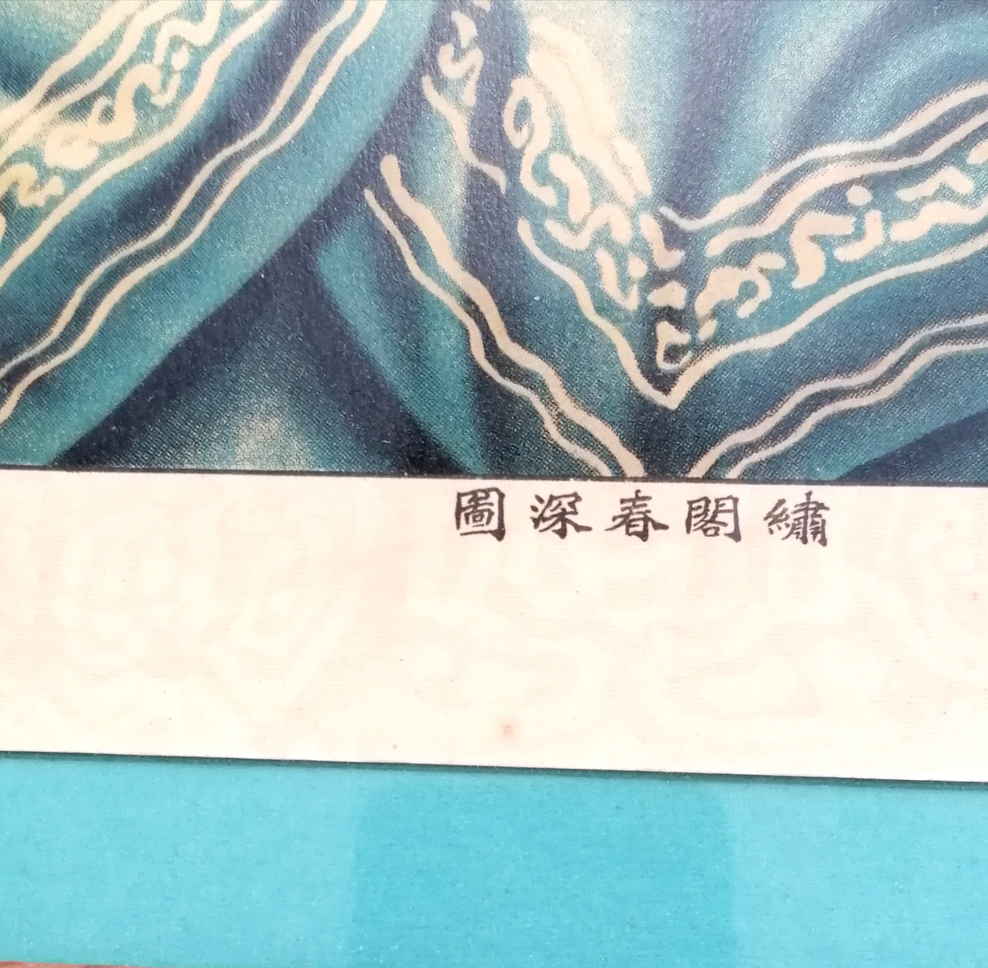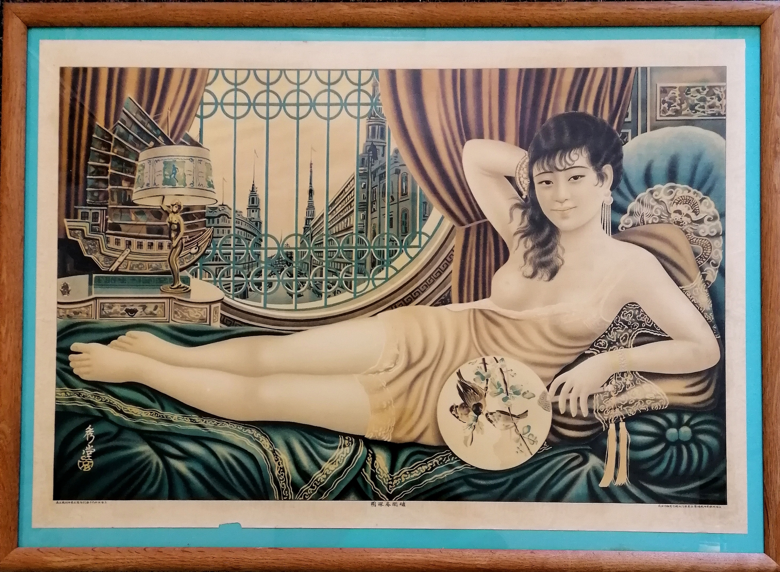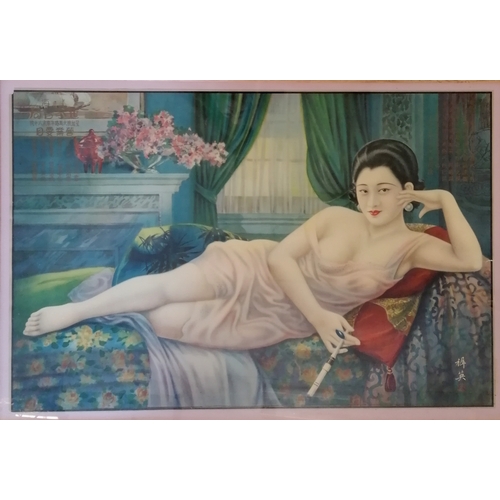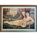Japanese C1930 framed poster of semi nude reclining female with a fan - 85cm x 63cm