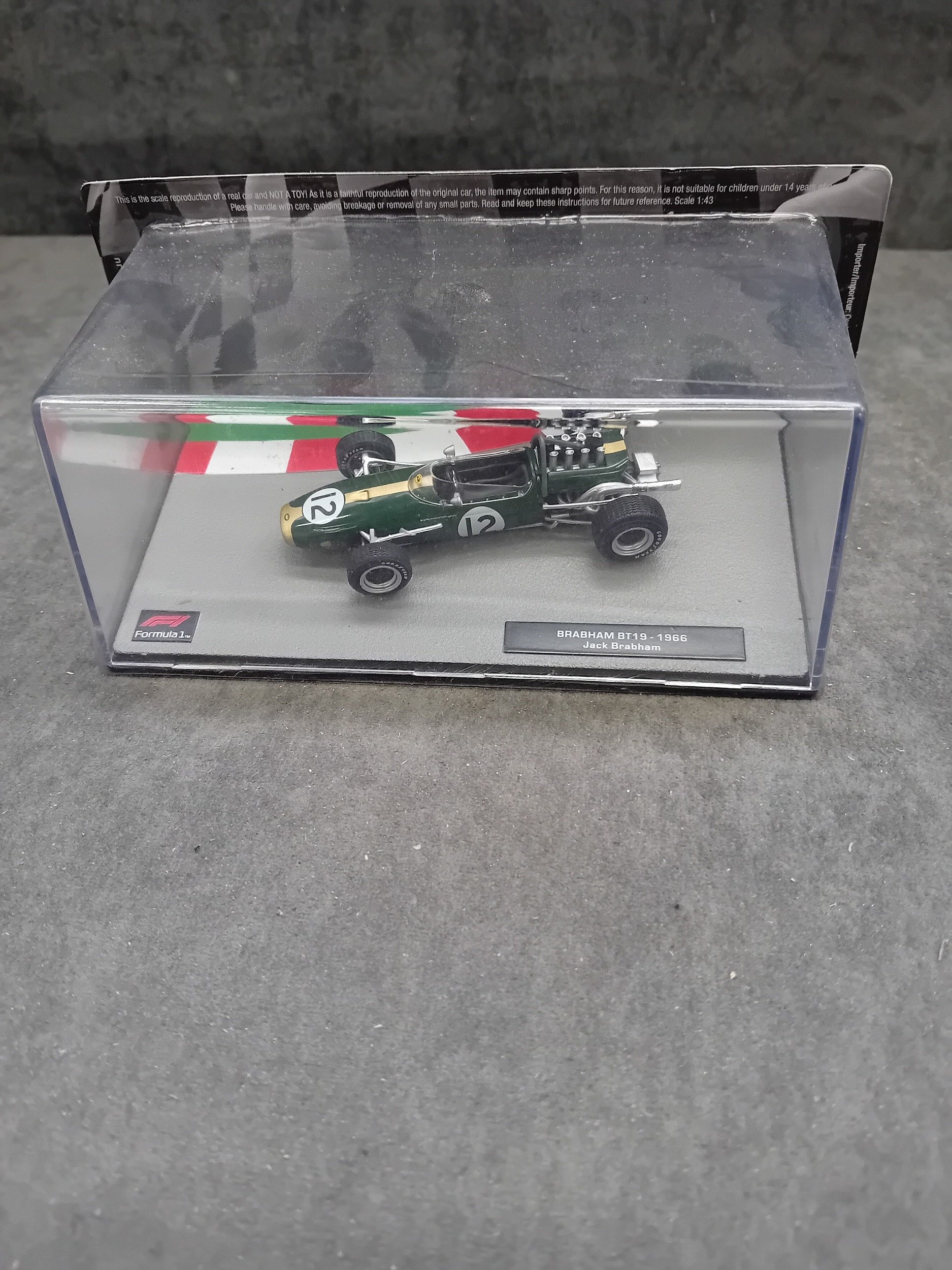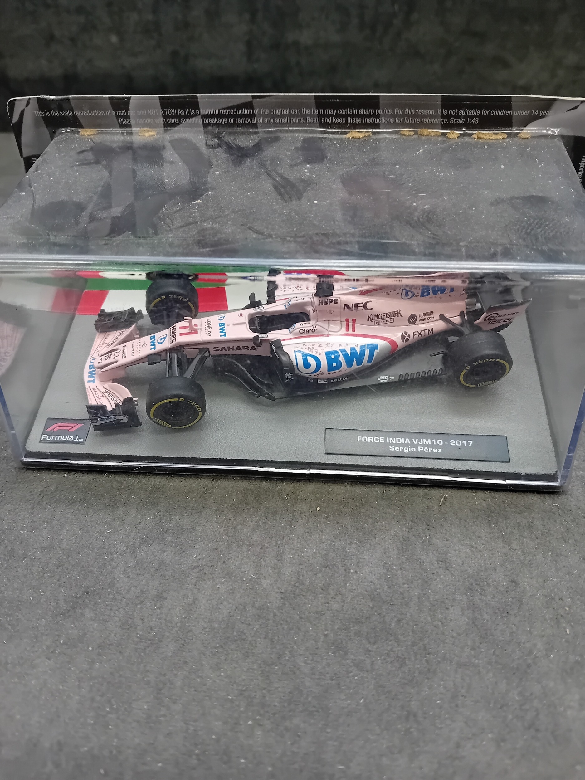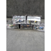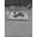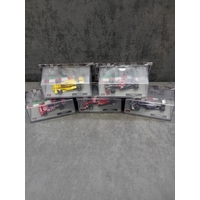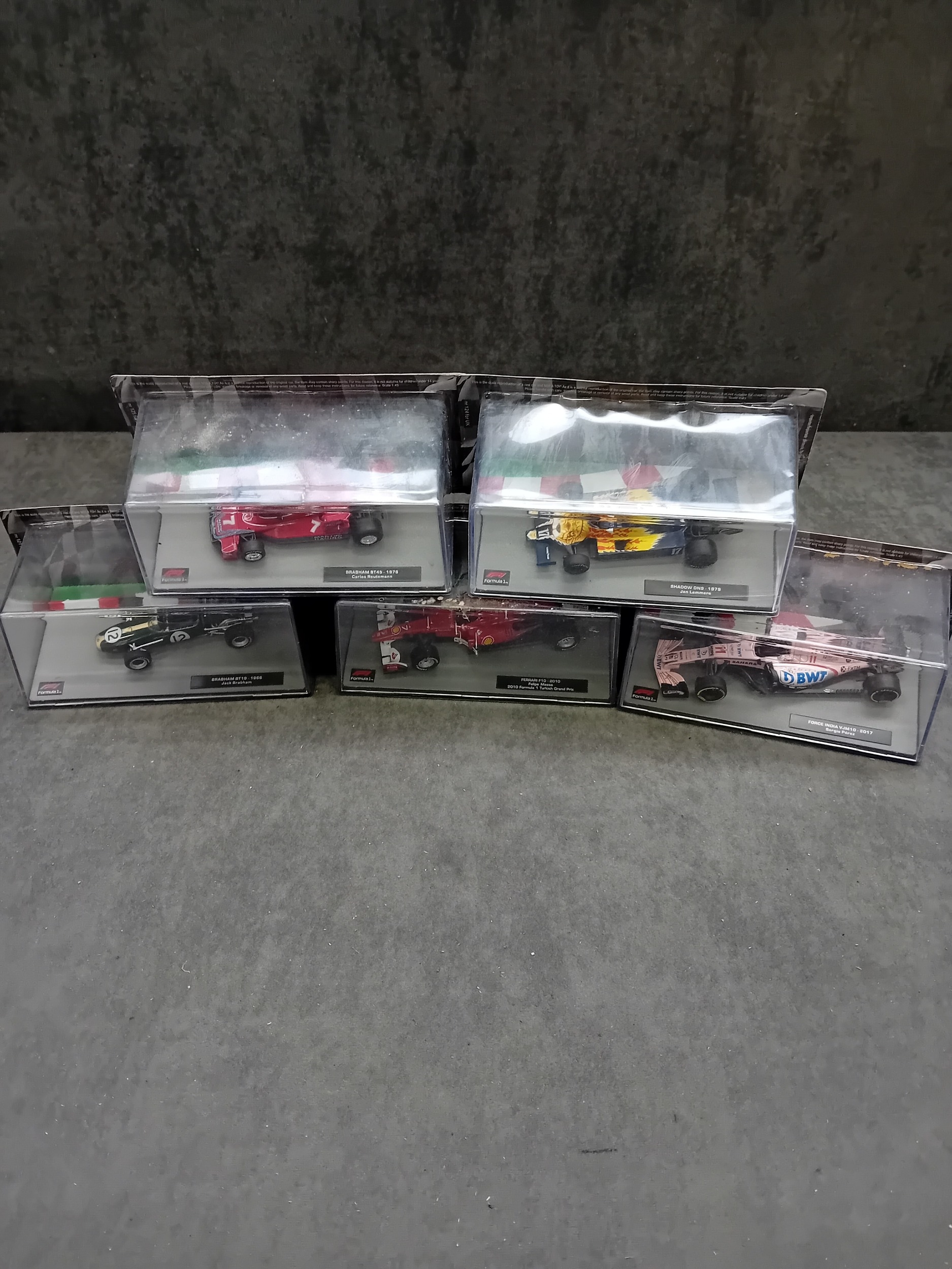 A collection of five die-cast model cars from the 'Formula 1 The Car Collection' series, likely part of a DeAGOSTINI or similar partwork series, comprising Issues 121 to 125. Each model is presented in its original clear acrylic display case with a grey base featuring a track motif. The models are identified by labels on their bases as: a green Brabham BT19 from 1966 (Jack Brabham), a red Brabham BT45 from 1976 (Carlos Reutemann), a red Ferrari F10 from the 2010 Turkish Grand Prix, a blue and yellow Shadow DN9 from 1979 (Jan Lammers), and a pink Force India VJM10 from 2017 (Sergio Perez). Each base also displays a 'Formula 1' logo. The packaging specifies a 'Scale 1:43' and includes a warning stating they are 'scale reproduction[s] of a real car and NOT a TOY, ' deemed unsuitable for children under 14 years due to potential sharp points and small parts.