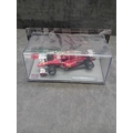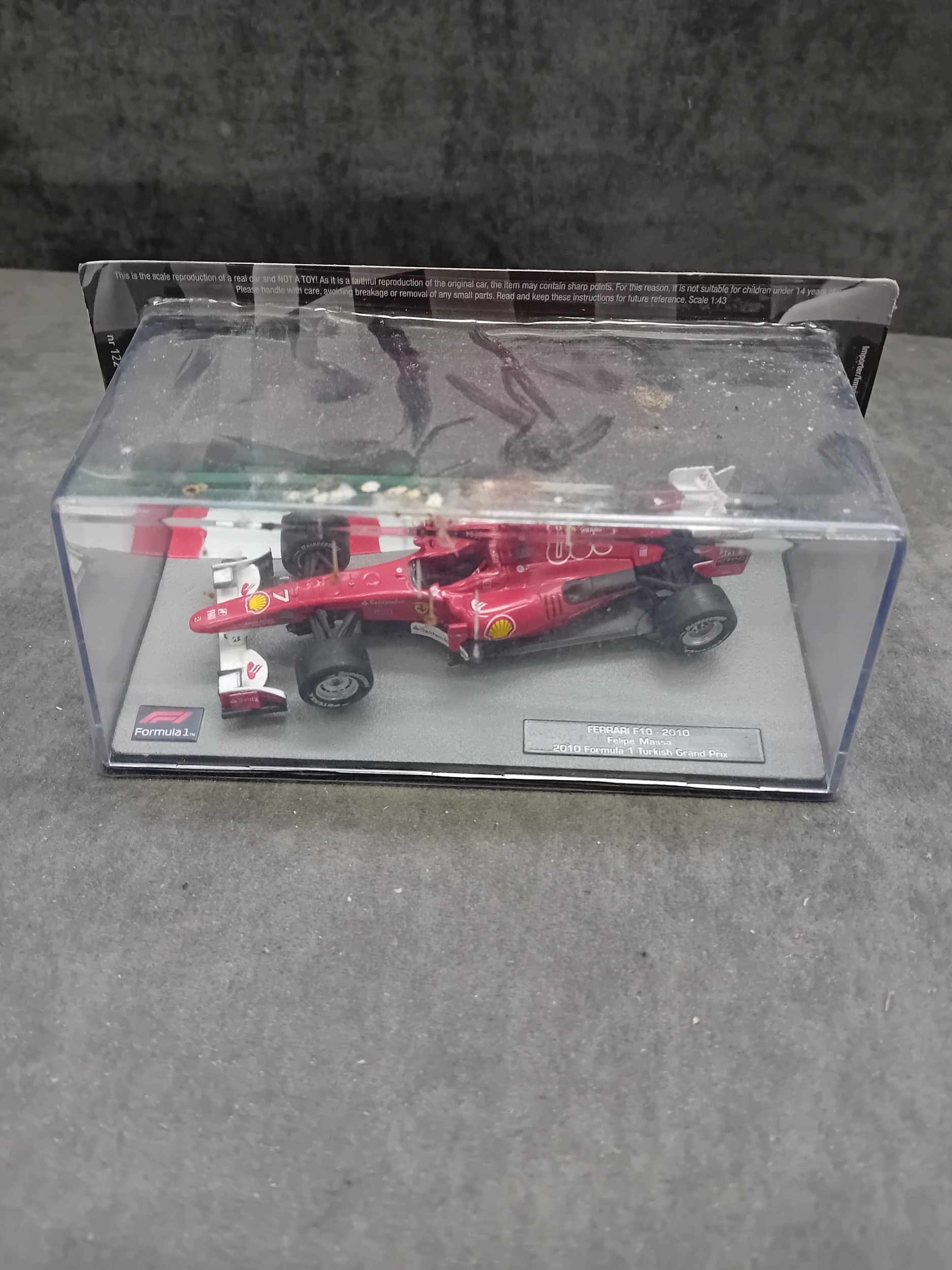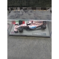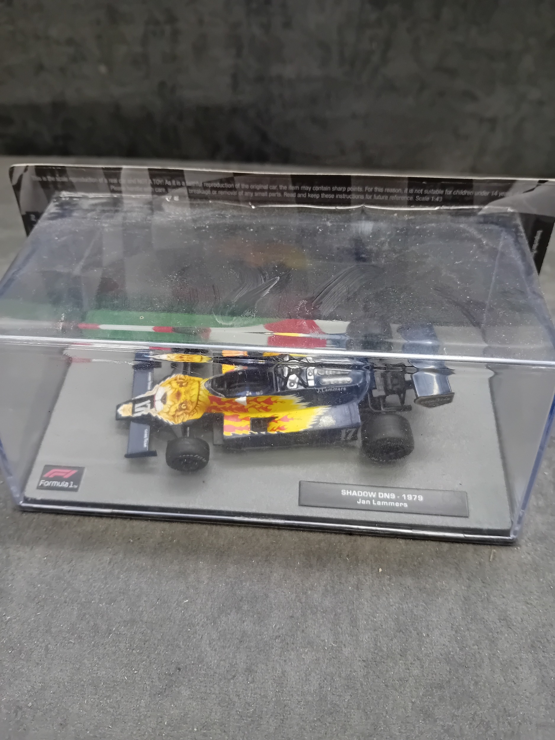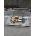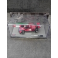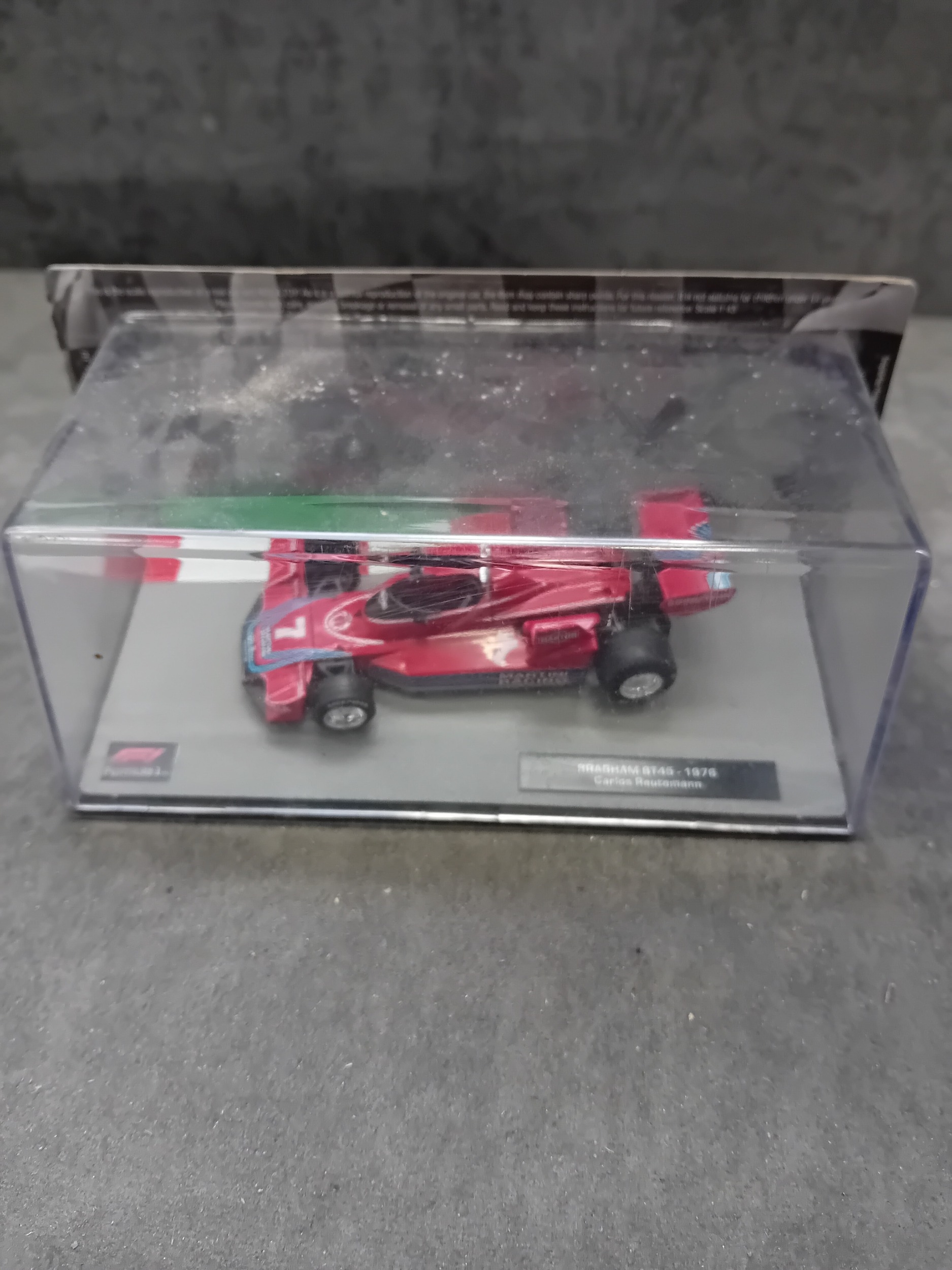 A collection of five die-cast model cars from the 'Formula 1 The Car Collection' series, likely part of a DeAGOSTINI or similar partwork series, comprising Issues 121 to 125. Each model is presented in its original clear acrylic display case with a grey base featuring a track motif. The models are identified by labels on their bases as: a green Brabham BT19 from 1966 (Jack Brabham), a red Brabham BT45 from 1976 (Carlos Reutemann), a red Ferrari F10 from the 2010 Turkish Grand Prix, a blue and yellow Shadow DN9 from 1979 (Jan Lammers), and a pink Force India VJM10 from 2017 (Sergio Perez). Each base also displays a 'Formula 1' logo. The packaging specifies a 'Scale 1:43' and includes a warning stating they are 'scale reproduction[s] of a real car and NOT a TOY, ' deemed unsuitable for children under 14 years due to potential sharp points and small parts.
