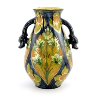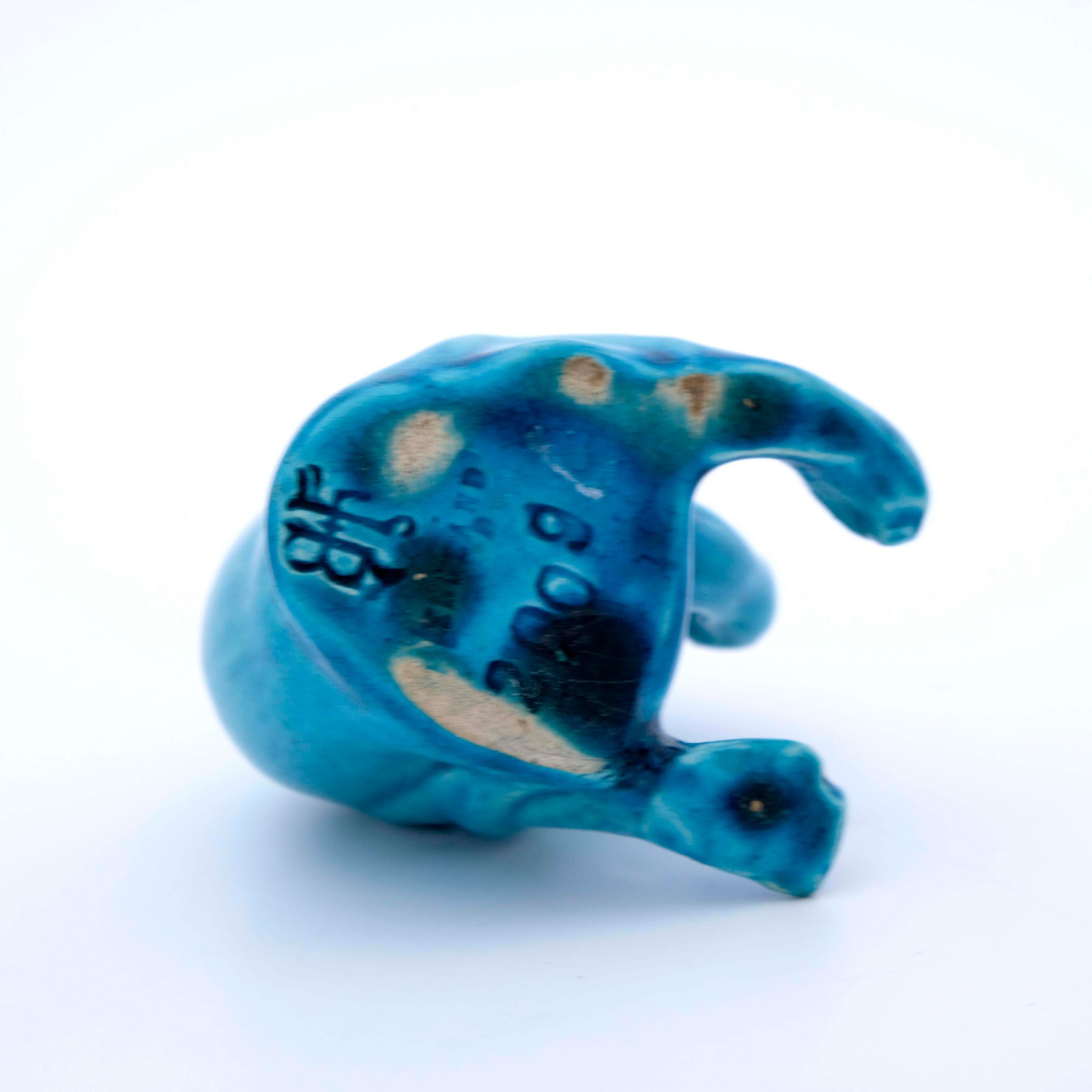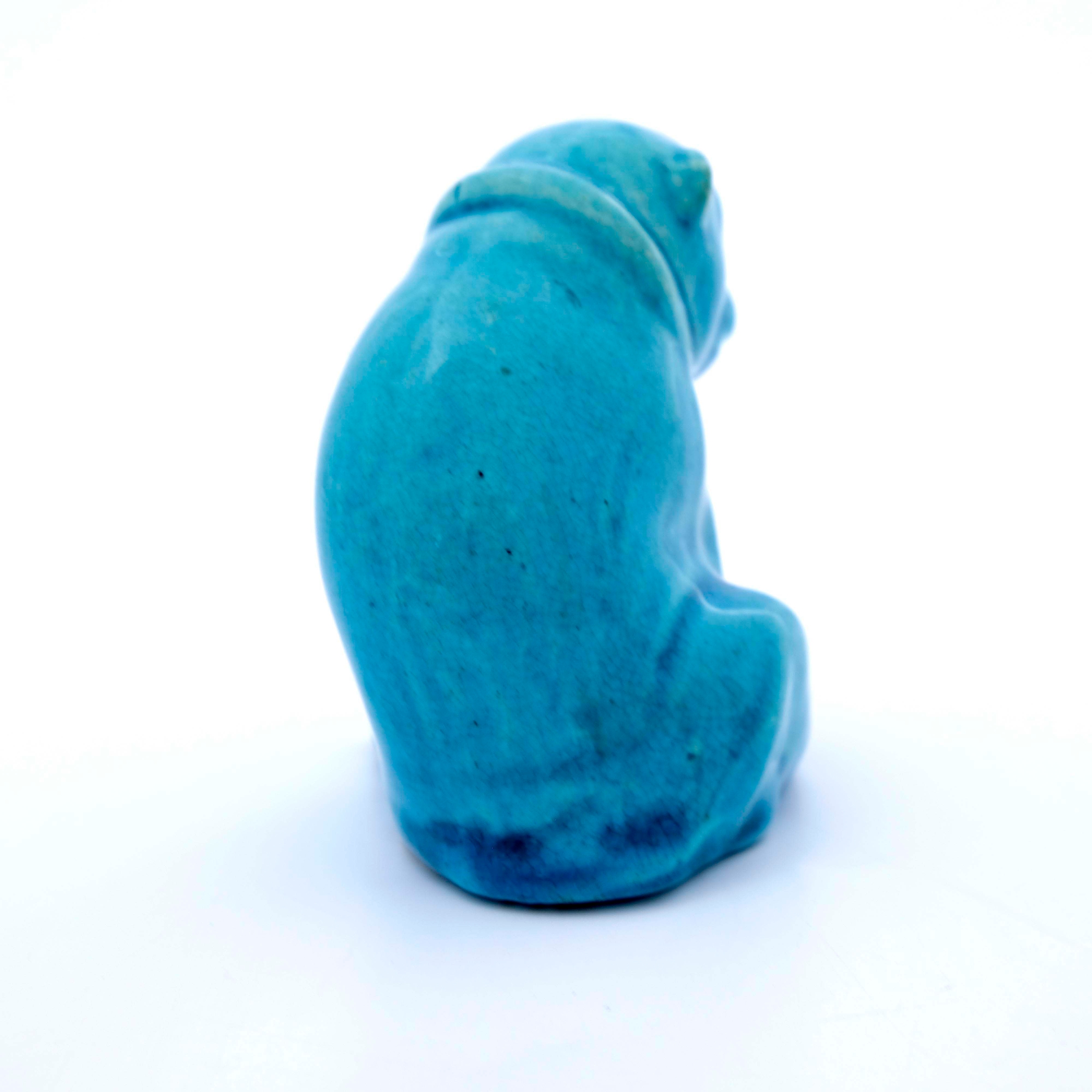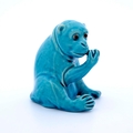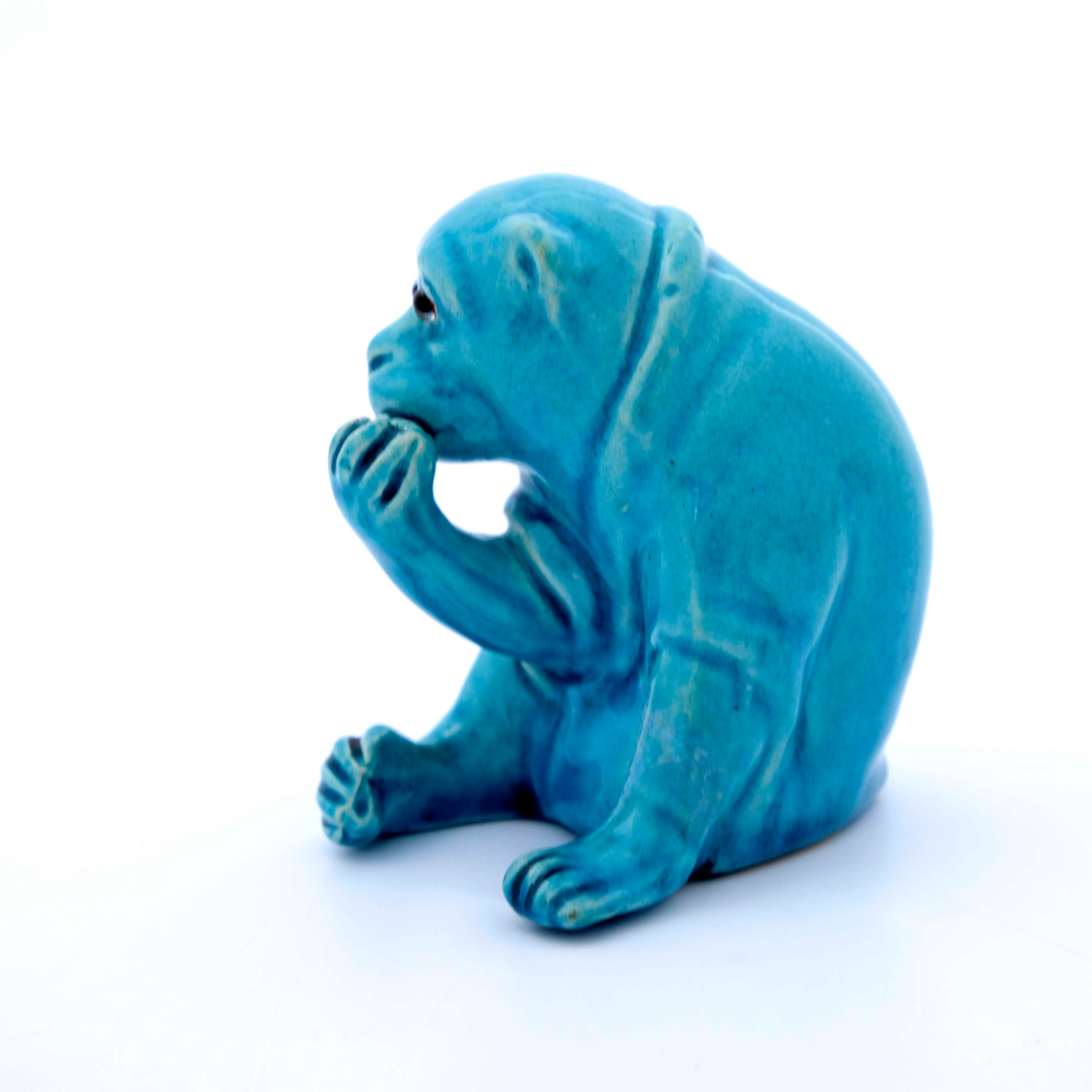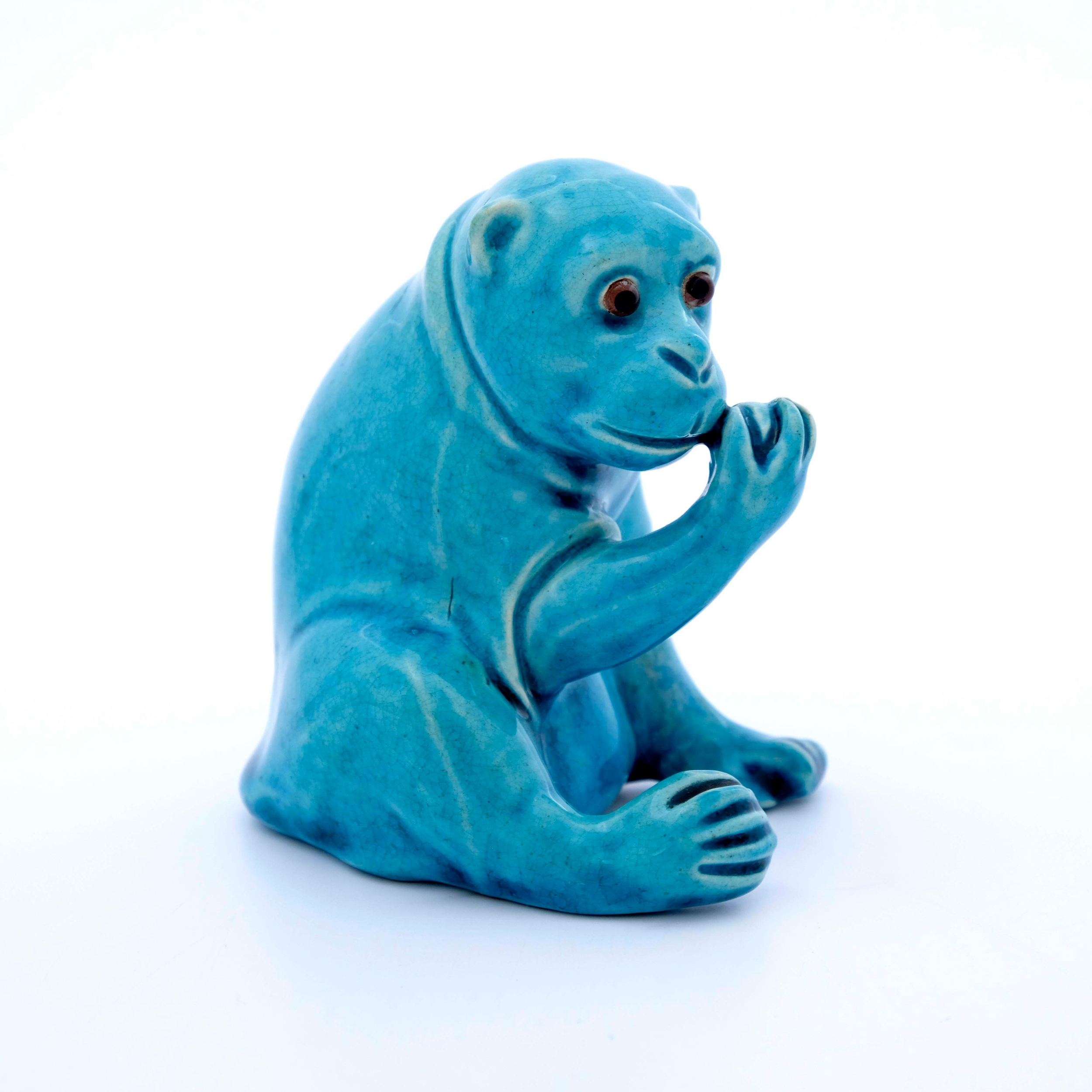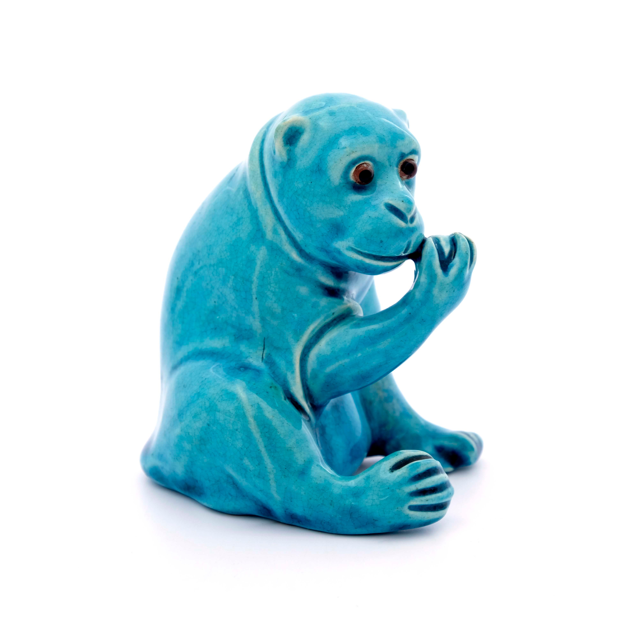 Burmantofts, a Faience art pottery figure of a monkey, modelled sitting eating an apple, turquoise glazed and set with glass eyes, impressed marks 2009, 8cm high
