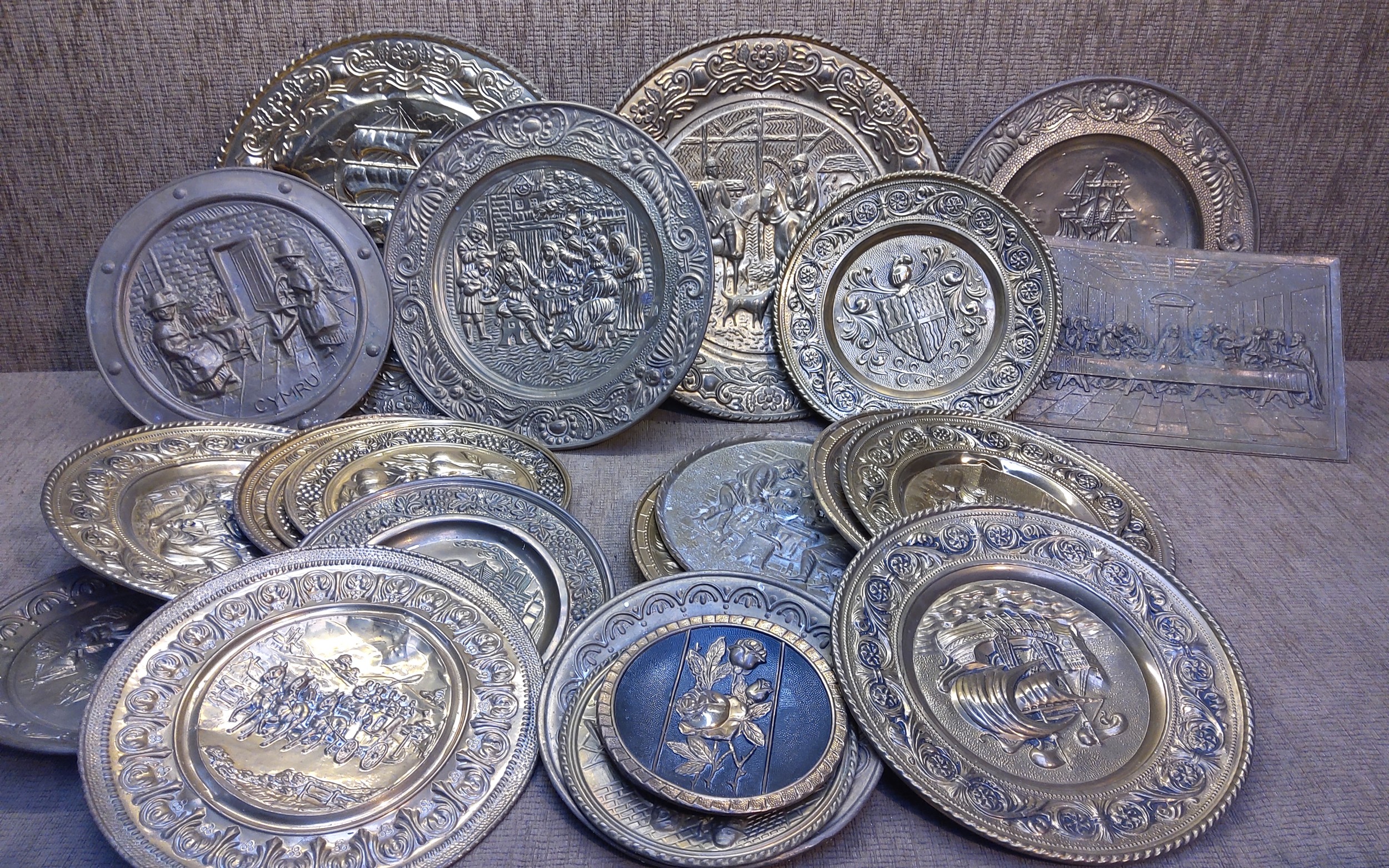 Collection of 21 brass hanging plates.